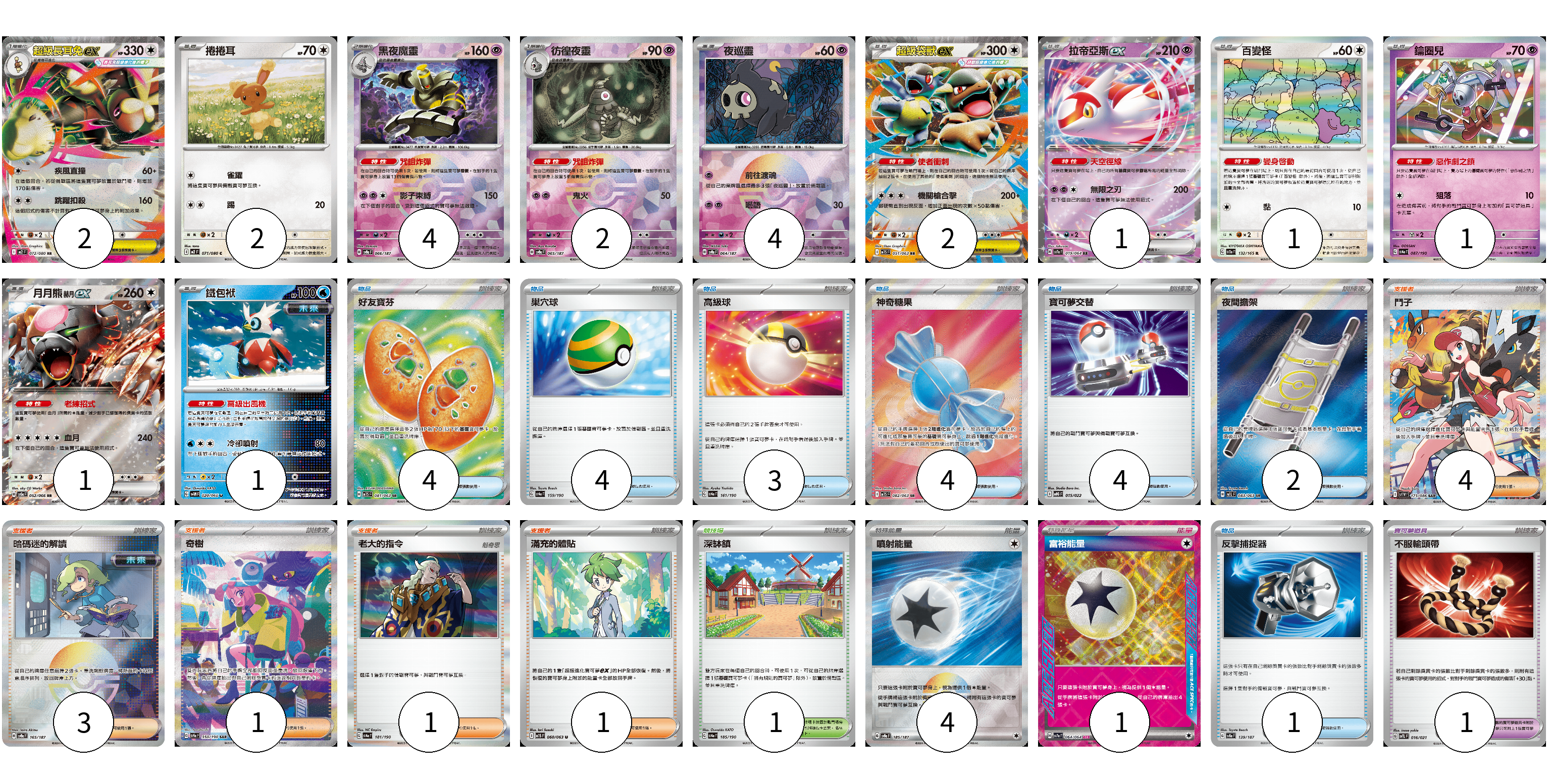 牌組構築方案 以此牌組為基礎新構築牌組 顯示卡面 顯示列表 寶可夢卡(21) 2 2 4 2 4 2 1 1 1 1 1 寶可夢道具(1) 1 物品卡(22) 4 4 3 4 4 2 1 支援者卡(10) 4 3 1 1 1 競技場卡(1) 1 能量卡(5) 4 1 寶可夢卡(21) 卡牌名稱 張數 卡牌名稱 張數 超級長耳兔ex M2 072/080 02 捲捲耳 M2 071/080 02 黑夜魔靈 SV8a 066/187 04 彷徨夜靈 SV8a 065/187 02 夜巡靈 SV8a 064/187 04 超級袋獸ex M1S 051/063 02 拉帝亞斯ex SV7a 019/064 01 百變怪 SV2a 132/165 01 鑰圈兒 SV4a 087/190 01 月月熊 赫月 ex SV5a 052/066 01 鐵包袱 SV4M 020/066 01 寶可夢道具(1) 卡牌名稱 張數 卡牌名稱 張數 不服輸頭帶 SVTL 016/021 01 物品卡(22) 卡牌名稱 張數 卡牌名稱 張數 好友寶芬 M1S 081/063 04 巢穴球 SV4a 159/190 04 高級球 SV4a 161/190 03 神奇糖果 M1S 082/063 04 寶可夢交替 MBG 015/022 04 夜間擔架 M1L 083/063 02 反擊捕捉器 SV8a 139/187 01 支援者卡(10) 卡牌名稱 張數 卡牌名稱 張數 鬥子 SV11W 173/086 04 暗碼迷的解讀 SV8a 165/187 03 奇樹 SV4a 350/190 01 老大的指令 SV4a 181/190 01 滿充的體貼 M1S 060/063 01 競技場卡(1) 卡牌名稱 張數 卡牌名稱 張數 深缽鎮 SV4a 185/190 01 能量卡(5) 卡牌名稱 張數 卡牌名稱 張數 噴射能量 SV8a 185/187 04 富裕能量 SV7a 064/064 01 以此牌組為基礎新構築牌組 牌組編碼 FxccVn-agYYpK-MetBlO copy 列印牌組單 牌組編碼已複製 分享至SNS