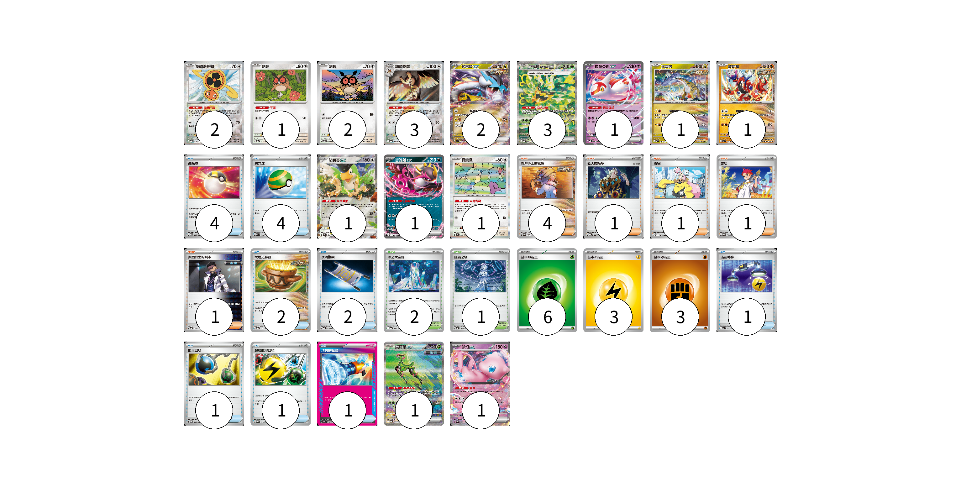 牌組構築方案 以此牌組為基礎新構築牌組 顯示卡面 顯示列表 寶可夢卡(21) 2 1 2 3 2 3 1 1 1 1 1 1 1 1 物品卡(16) 4 4 2 2 1 1 1 1 支援者卡(8) 4 1 1 1 1 競技場卡(3) 2 1 能量卡(12) 6 3 3 寶可夢卡(21) 卡牌名稱 張數 卡牌名稱 張數 旋轉洛托姆 SV8a 131/187 02 咕咕 SV8a 127/187 01 咕咕 SV7 076/102 02 貓頭夜鷹 SV8a 128/187 03 猛雷鼓ex SV5K 053/071 02 厄鬼椪 碧草面具ex SV6 125/101 03 拉帝亞斯ex MBD 003/022 01 猛雷鼓 SV7 075/102 01 故勒頓 SV8 069/106 01 怒鸚哥ex SV4a 154/190 01 吉雉雞ex SVOD 004/020 01 百變怪 SV4a 144/190 01 鐵斑葉ex SV5M 093/071 01 夢幻ex SVK 001/042 01 物品卡(16) 卡牌名稱 張數 卡牌名稱 張數 高級球 MBD 014/022 04 巢穴球 SVM 133/175 04 大地之容器 SV8a 143/187 02 夜間擔架 MBD 016/022 02 能量轉移 SVM 127/175 01 能量回收 SVQL 012/022 01 超級能量回收 SV8a 141/187 01 頂尖捕捉器 MBG 014/022 01 支援者卡(8) 卡牌名稱 張數 卡牌名稱 張數 奧琳博士的氣魄 SV8a 167/187 04 老大的指令 MBD 020/022 01 奇樹 SVOD 016/020 01 赤松 SV8a 163/187 01 弗圖博士的劇本 SV8a 175/187 01 競技場卡(3) 卡牌名稱 張數 卡牌名稱 張數 零之大空洞 SV8a 182/187 02 阻礙之塔 SV8a 181/187 01 能量卡(12) 卡牌名稱 張數 卡牌名稱 張數 基本草能量 sv-p GRA 06 基本雷能量 sv-p LIG 03 基本鬥能量 sv-p FIG 03 以此牌組為基礎新構築牌組 牌組編碼 FxzXEV-FUtJMs-AKhakl copy 列印牌組單 牌組編碼已複製 分享至SNS