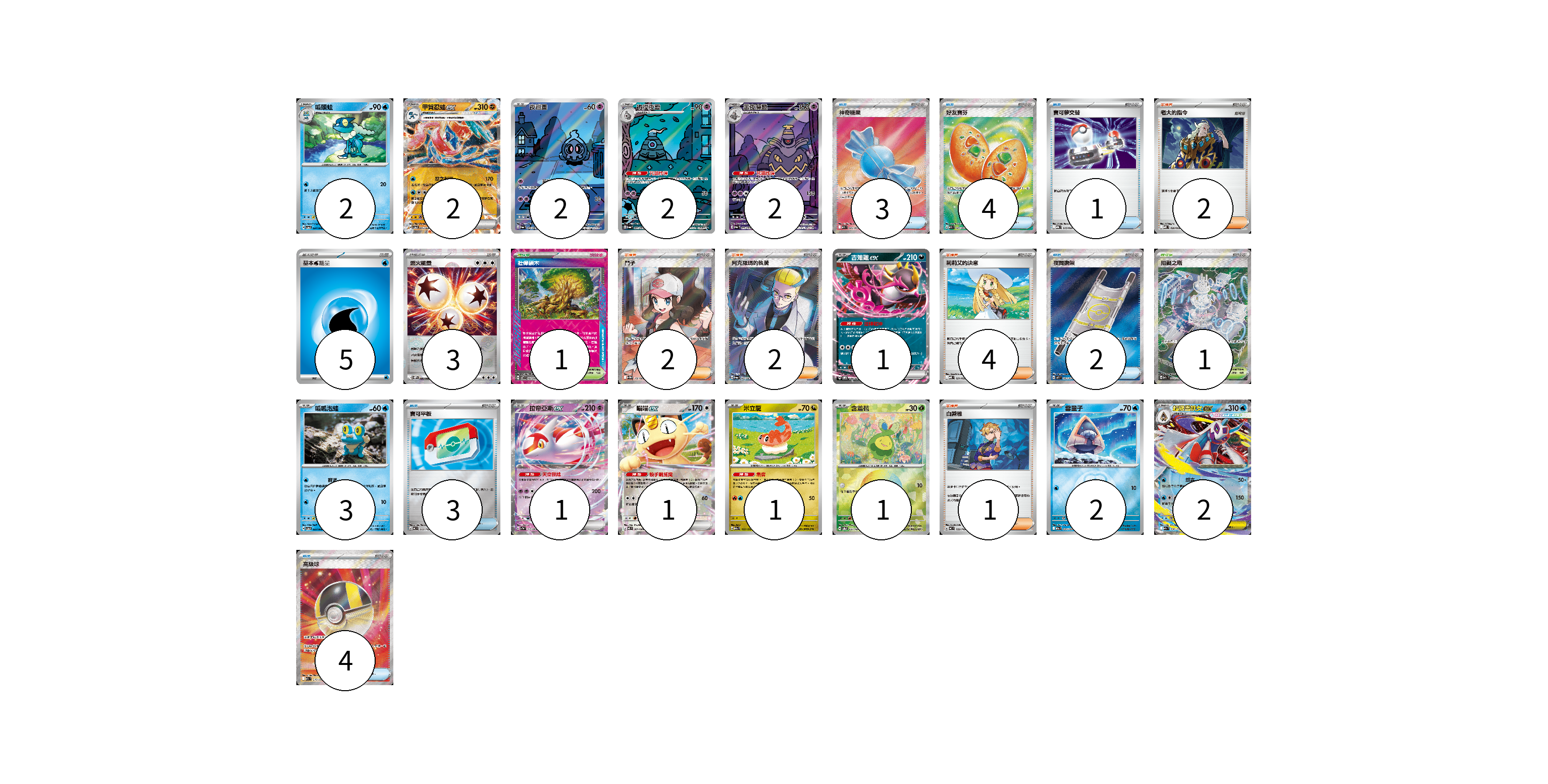 牌組構築方案 以此牌組為基礎新構築牌組 顯示卡面 顯示列表 寶可夢卡(22) 2 2 2 2 2 1 3 1 1 1 1 2 2 物品卡(17) 3 4 1 2 3 4 支援者卡(11) 2 2 2 4 1 競技場卡(2) 1 1 能量卡(8) 5 3 寶可夢卡(22) 卡牌名稱 張數 卡牌名稱 張數 呱頭蛙 SV5a 024/066 02 甲賀忍蛙ex SV5a 045/066 02 夜巡靈 SV6a 068/064 02 彷徨夜靈 SV6a 069/064 02 黑夜魔靈 SV6a 070/064 02 吉雉雞ex SVOM 009/021 01 呱呱泡蛙 SV5a 023/066 03 拉帝亞斯ex SV7a 019/064 01 喵喵ex M3 061/080 01 米立龍 M2a 135/193 01 含羞苞 SV8a 001/187 01 雪童子 M2a 035/193 02 超級雪妖女ex M2a 036/193 02 物品卡(17) 卡牌名稱 張數 卡牌名稱 張數 神奇糖果 M1S 082/063 03 好友寶芬 M1S 081/063 04 寶可夢交替 MBG 015/022 01 夜間擔架 M1L 083/063 02 寶可平板 MC 662/742 03 高級球 M2a 216/193 04 支援者卡(11) 卡牌名稱 張數 卡牌名稱 張數 老大的指令 MBD 020/022 02 鬥子 SV11W 166/086 02 阿克羅瑪的執著 SV6a 083/064 02 莉莉艾的決意 MBD 021/022 04 白蕾雅 MC 722/742 01 競技場卡(2) 卡牌名稱 張數 卡牌名稱 張數 壯偉碩木 SV7 101/102 01 阻礙之塔 M2a 222/193 01 能量卡(8) 卡牌名稱 張數 卡牌名稱 張數 基本水能量 sv-p WAT 05 燃火能量 SV11W 086/086 03 以此牌組為基礎新構築牌組 牌組編碼 FzstNe-RMpmFx-uaJsRk copy 列印牌組單 牌組編碼已複製 分享至SNS