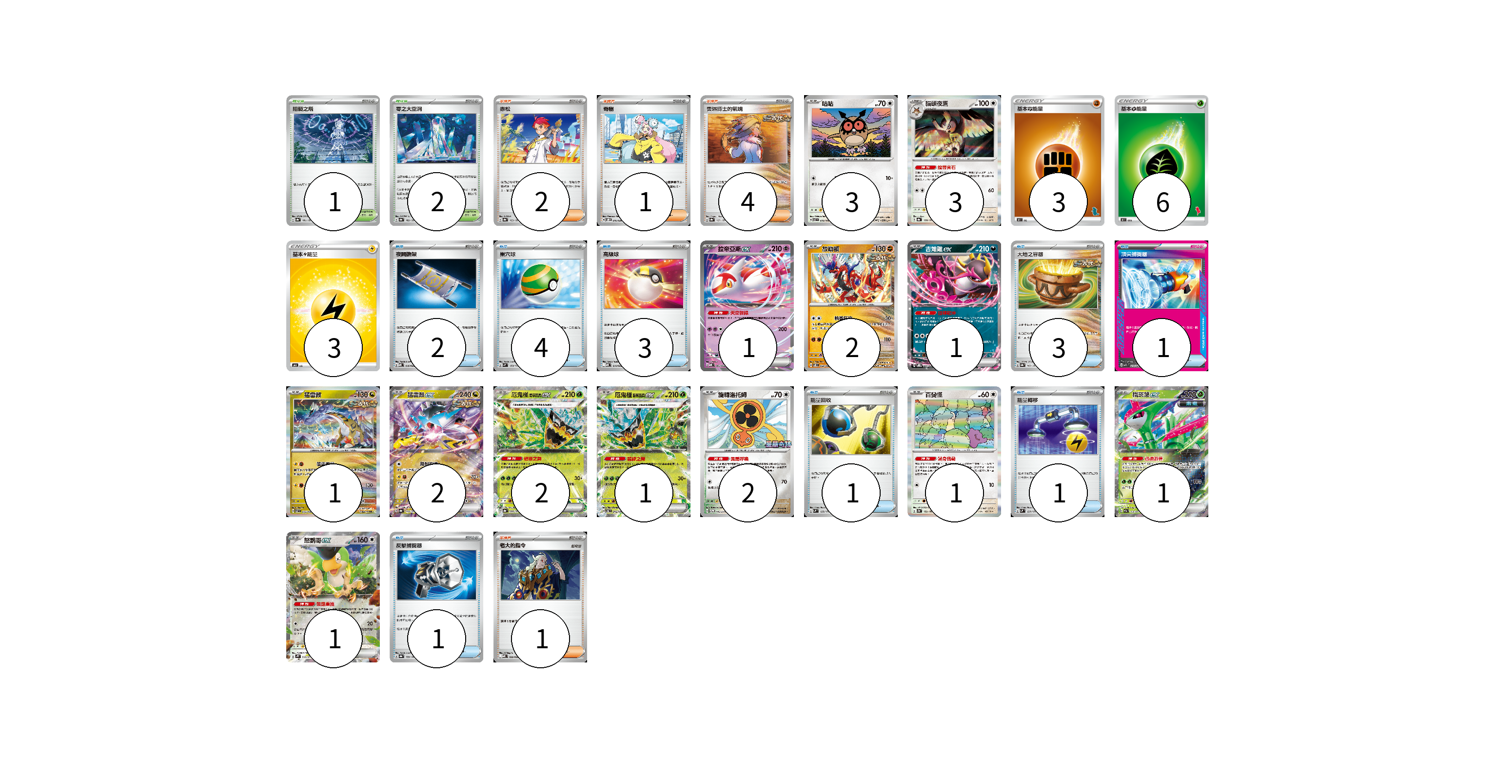 牌組構築方案 以此牌組為基礎新構築牌組 顯示卡面 顯示列表 寶可夢卡(21) 3 3 1 2 1 1 2 2 1 2 1 1 1 物品卡(16) 2 4 3 3 1 1 1 1 支援者卡(8) 2 1 4 1 競技場卡(3) 1 2 能量卡(12) 3 6 3 寶可夢卡(21) 卡牌名稱 張數 卡牌名稱 張數 咕咕 SV7 076/102 03 貓頭夜鷹 SV8a 128/187 03 拉帝亞斯ex MBD 003/022 01 故勒頓 SV8 069/106 02 吉雉雞ex SVOD 004/020 01 猛雷鼓 SV7 075/102 01 猛雷鼓ex SV8a 124/187 02 厄鬼椪 碧草面具ex SV8a 020/187 02 厄鬼椪 碧草面具ex SV6 016/101 01 旋轉洛托姆 SV-P 146/SV-P 02 百變怪 SV2a 132/165 01 鐵斑葉ex SV5M 016/071 01 怒鸚哥ex SV2P 065/071 01 物品卡(16) 卡牌名稱 張數 卡牌名稱 張數 夜間擔架 MBD 016/022 02 巢穴球 SVM 133/175 04 高級球 MBD 014/022 03 大地之容器 SV8a 143/187 03 頂尖捕捉器 MBG 014/022 01 能量回收 SVM 125/175 01 能量轉移 SVM 127/175 01 反擊捕捉器 SV8a 139/187 01 支援者卡(8) 卡牌名稱 張數 卡牌名稱 張數 赤松 SV8a 163/187 02 奇樹 SVOD 016/020 01 奧琳博士的氣魄 SV8a 167/187 04 老大的指令 MBD 020/022 01 競技場卡(3) 卡牌名稱 張數 卡牌名稱 張數 阻礙之塔 SV8a 181/187 01 零之大空洞 SV8a 182/187 02 能量卡(12) 卡牌名稱 張數 卡牌名稱 張數 基本鬥能量 SH FIG 03 基本草能量 SH GRA 06 基本雷能量 SN LIG 03 以此牌組為基礎新構築牌組 牌組編碼 GBEiQs-IRsJzH-WjwRFs copy 列印牌組單 牌組編碼已複製 分享至SNS