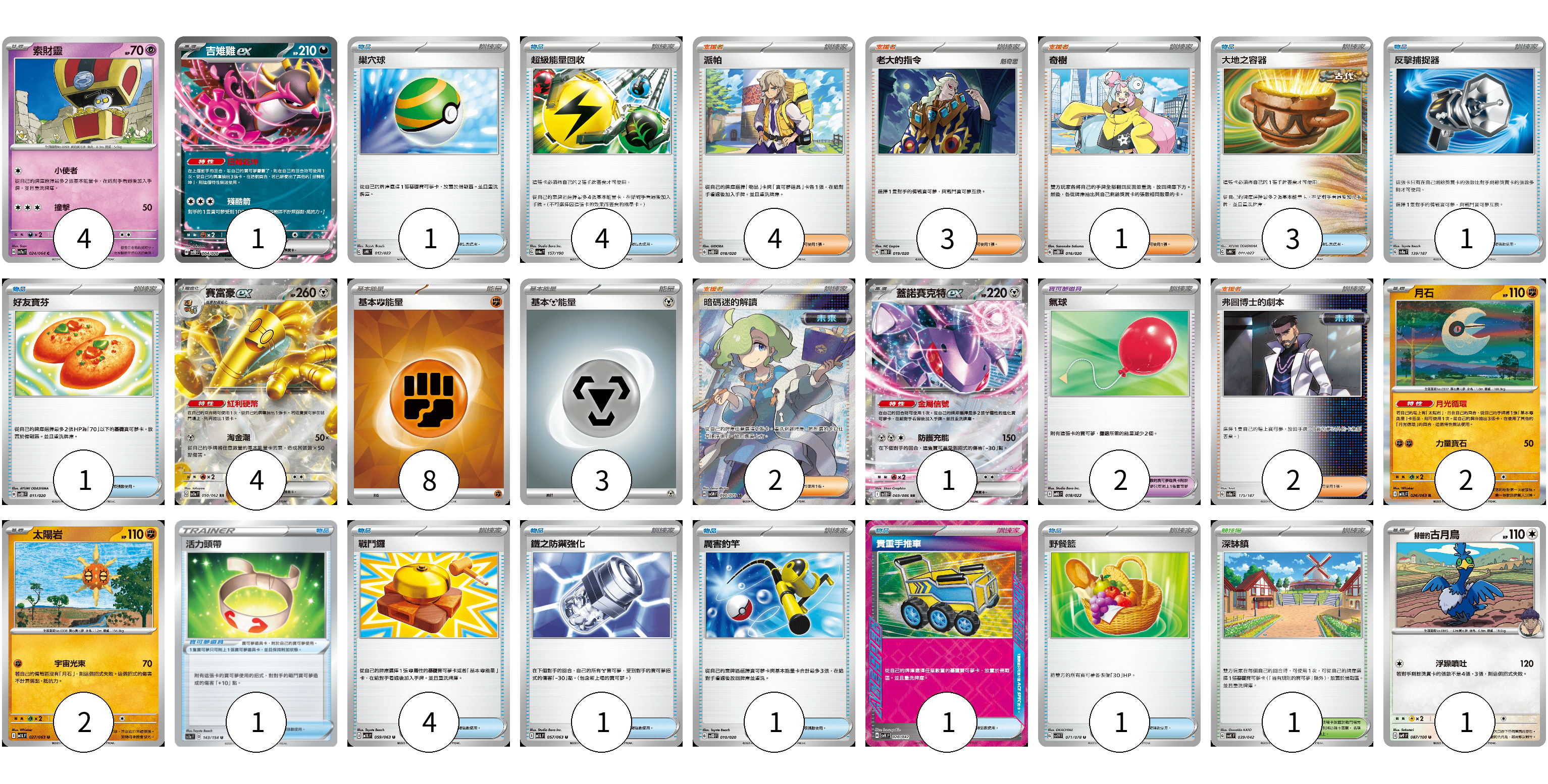 牌組構築方案 以此牌組為基礎新構築牌組 顯示卡面 顯示列表 寶可夢卡(15) 4 1 4 1 2 2 1 寶可夢道具(3) 2 1 物品卡(18) 1 4 3 1 1 4 1 1 1 1 支援者卡(12) 4 3 1 2 2 競技場卡(1) 1 能量卡(11) 8 3 寶可夢卡(15) 卡牌名稱 張數 卡牌名稱 張數 索財靈 SV7a 024/064 04 吉雉雞ex SVOD 004/020 01 賽富豪ex SV3a 050/062 04 蓋諾賽克特ex SV11B 069/086 01 月石 M1L 026/063 02 太陽岩 M1L 027/063 02 赫普的古月鳥 SV9 087/100 01 寶可夢道具(3) 卡牌名稱 張數 卡牌名稱 張數 氣球 MBD 018/022 02 活力頭帶 SC1a 143/154 01 物品卡(18) 卡牌名稱 張數 卡牌名稱 張數 巢穴球 SVHK 012/022 01 超級能量回收 SV4a 157/190 04 大地之容器 SVHK 011/022 03 反擊捕捉器 SV8a 139/187 01 好友寶芬 SVOD 011/020 01 戰鬥鑼 M1L 059/063 04 鐵之防禦強化 M1L 057/063 01 厲害釣竿 SVOD 010/020 01 貴重手推車 SVK 020/042 01 野餐籃 SV1V 071/078 01 支援者卡(12) 卡牌名稱 張數 卡牌名稱 張數 派帕 SVOD 018/020 04 老大的指令 SVOD 019/020 03 奇樹 SVOD 016/020 01 暗碼迷的解讀 SV5M 090/071 02 弗圖博士的劇本 SV8a 175/187 02 競技場卡(1) 卡牌名稱 張數 卡牌名稱 張數 深缽鎮 SVK 039/042 01 能量卡(11) 卡牌名稱 張數 卡牌名稱 張數 基本【鬥】能量 SVK FIG 08 基本【鋼】能量 SVTH MET 03 以此牌組為基礎新構築牌組 牌組編碼 GChcUg-HZviIi-vPnhNj copy 列印牌組單 牌組編碼已複製 分享至SNS