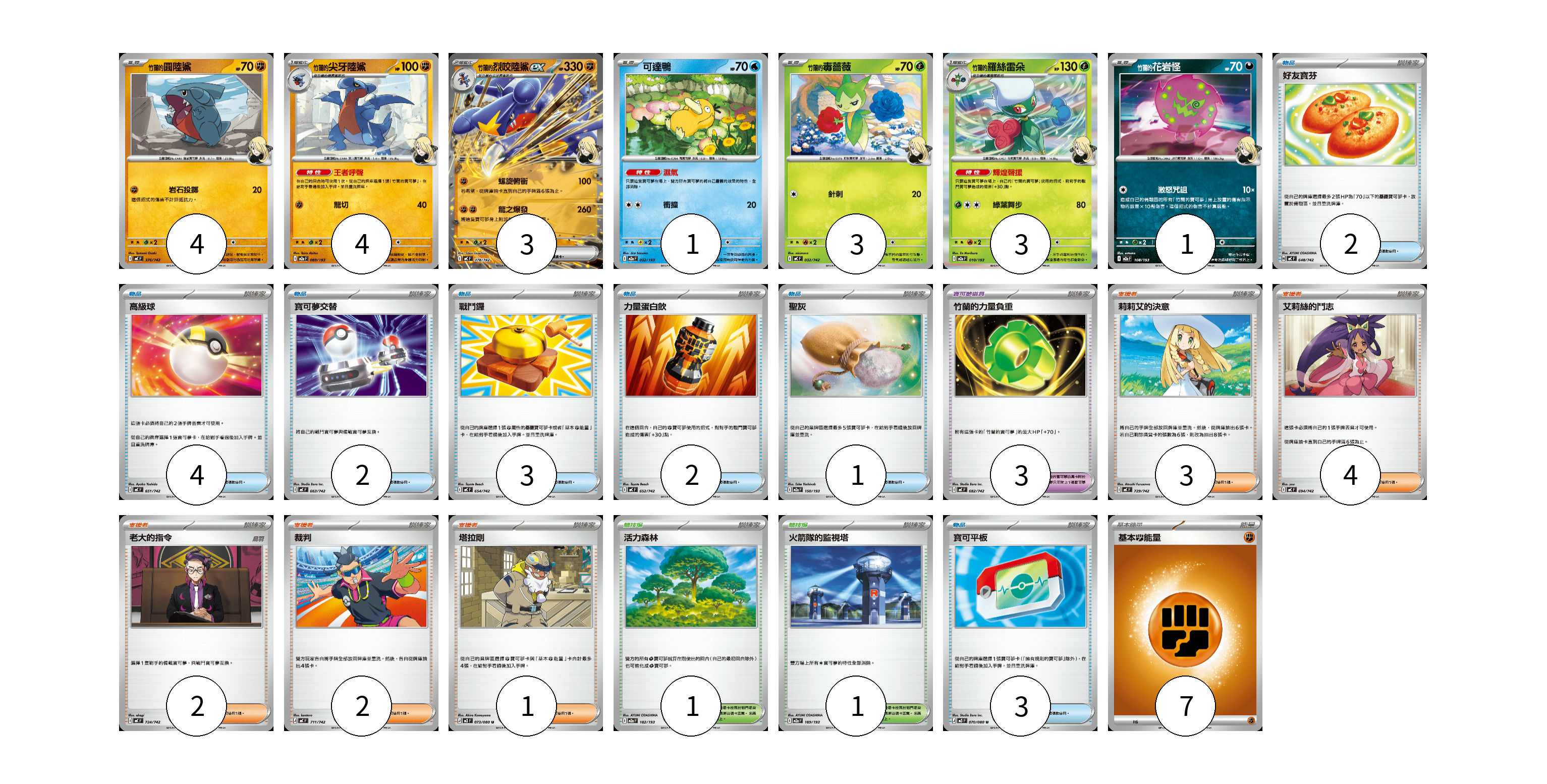 牌組構築方案 以此牌組為基礎新構築牌組 顯示卡面 顯示列表 寶可夢卡(19) 4 4 3 1 3 3 1 寶可夢道具(3) 3 物品卡(17) 2 4 2 3 2 1 3 支援者卡(12) 3 4 2 2 1 競技場卡(2) 1 1 能量卡(7) 7 寶可夢卡(19) 卡牌名稱 張數 卡牌名稱 張數 <竹蘭的>圓陸鯊 MC 376/742 04 竹蘭的尖牙陸鯊 M2a 089/193 04 <竹蘭的>烈咬陸鯊ex MC 378/742 03 可達鴨 M2a 032/193 01 竹蘭的毒薔薇 MC 032/742 03 <竹蘭的>羅絲雷朵 M2a 010/193 03 <竹蘭的>花岩怪 M2a 108/193 01 寶可夢道具(3) 卡牌名稱 張數 卡牌名稱 張數 竹蘭的力量負重 MC 682/742 03 物品卡(17) 卡牌名稱 張數 卡牌名稱 張數 好友寶芬 MC 648/742 02 高級球 MC 651/742 04 寶可夢交替 MC 663/742 02 戰鬥鑼 MC 654/742 03 力量蛋白飲 MC 652/742 02 聖灰 M2a 150/193 01 寶可平板 M3 070/080 03 支援者卡(12) 卡牌名稱 張數 卡牌名稱 張數 莉莉艾的決意 MC 729/742 03 艾莉絲的鬥志 MC 694/742 04 老大的指令 MC 724/742 02 裁判 MC 711/742 02 塔拉剛 M3 073/080 01 競技場卡(2) 卡牌名稱 張數 卡牌名稱 張數 活力森林 M2a 182/193 01 火箭隊的監視塔 M2a 189/193 01 能量卡(7) 卡牌名稱 張數 卡牌名稱 張數 基本【鬥】能量 MC FIG 07 以此牌組為基礎新構築牌組 牌組編碼 GCidzV-NzHNtu-MIbWjL copy 列印牌組單 牌組編碼已複製 分享至SNS