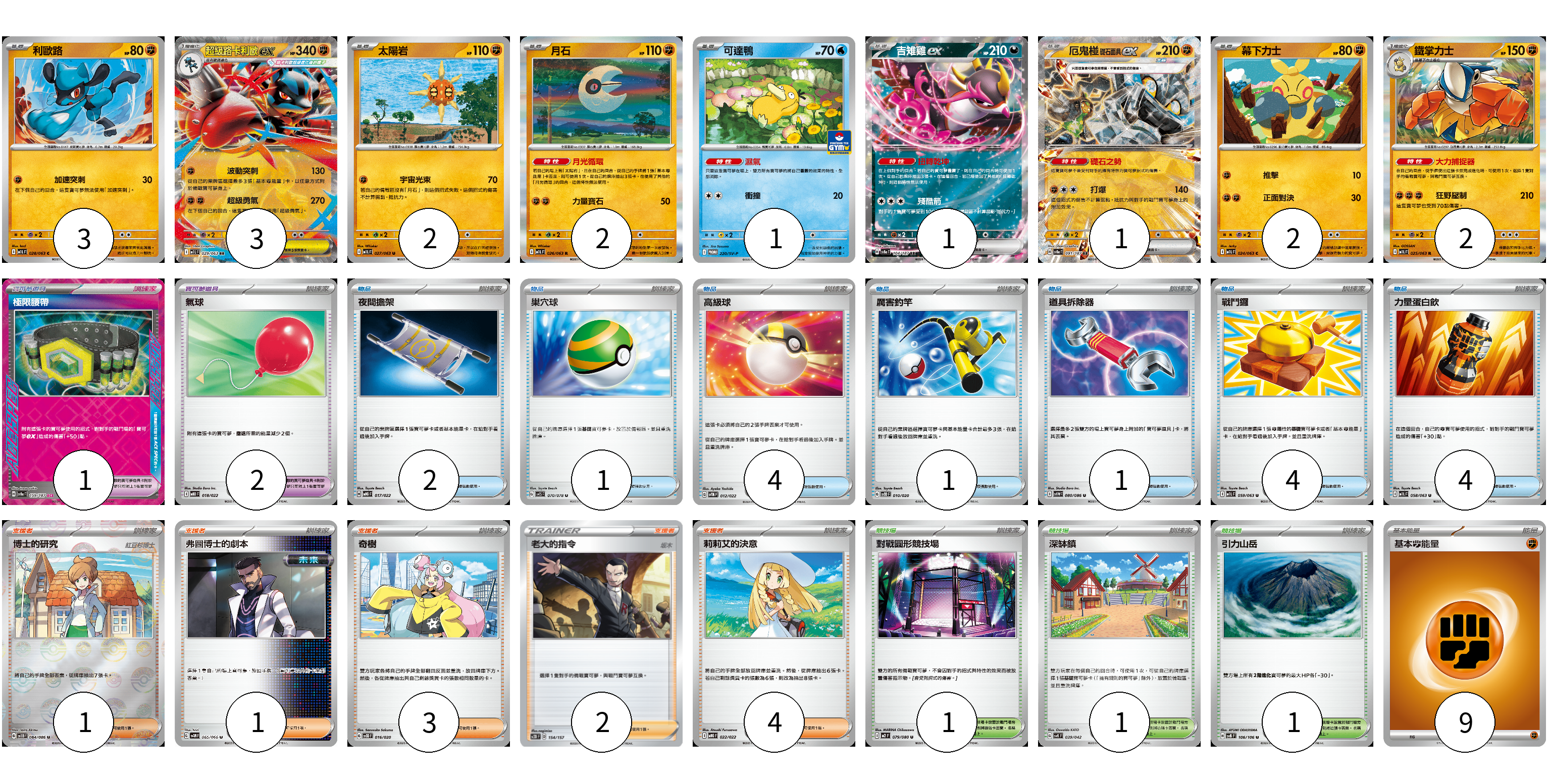 牌組構築方案 以此牌組為基礎新構築牌組 顯示卡面 顯示列表 寶可夢卡(17) 3 3 2 2 1 1 1 2 2 寶可夢道具(3) 1 2 物品卡(17) 2 1 4 1 1 4 4 支援者卡(11) 1 1 3 2 4 競技場卡(3) 1 1 1 能量卡(9) 9 寶可夢卡(17) 卡牌名稱 張數 卡牌名稱 張數 利歐路 M1L 028/063 03 超級路卡利歐ex M1L 029/063 03 太陽岩 M1L 027/063 02 月石 M1L 026/063 02 可達鴨 SV-P 220/SV-P 01 吉雉雞ex SV8a 104/187 01 厄鬼椪 礎石面具ex SV8a 091/187 01 幕下力士 M1L 024/063 02 鐵掌力士 M1L 025/063 02 寶可夢道具(3) 卡牌名稱 張數 卡牌名稱 張數 極限腰帶 SV8a 159/187 01 氣球 MBD 018/022 02 物品卡(17) 卡牌名稱 張數 卡牌名稱 張數 夜間擔架 MBG 017/022 02 巢穴球 SV1S 070/078 01 高級球 SVTM 012/022 04 厲害釣竿 SVOD 010/020 01 道具拆除器 SV11W 080/086 01 戰鬥鑼 M1L 059/063 04 力量蛋白飲 M1L 058/063 04 支援者卡(11) 卡牌名稱 張數 卡牌名稱 張數 博士的研究 SV11B 084/086 01 弗圖博士的劇本 SV4M 065/066 01 奇樹 SVOD 016/020 03 老大的指令(坂木) SC2D 154/157 02 莉莉艾的決意 MBG 022/022 04 競技場卡(3) 卡牌名稱 張數 卡牌名稱 張數 對戰圓形競技場 M2 079/080 01 深缽鎮 SVK 039/042 01 引力山岳 SV8 106/106 01 能量卡(9) 卡牌名稱 張數 卡牌名稱 張數 基本鬥能量 sv-p FIG 09 以此牌組為基礎新構築牌組 牌組編碼 GDXhke-wQFcWb-AwQrRu copy 列印牌組單 牌組編碼已複製 分享至SNS
