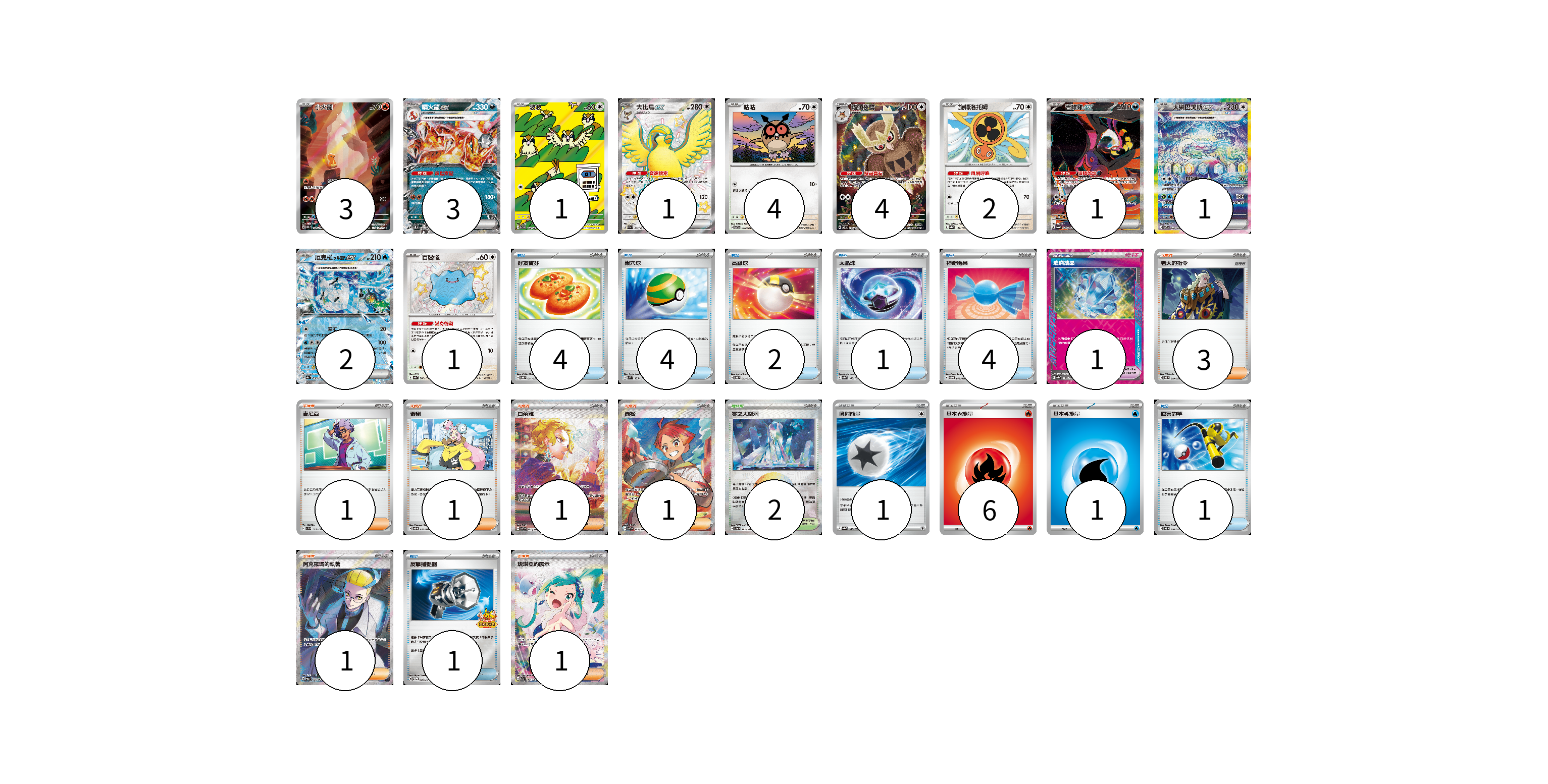 牌組構築方案 以此牌組為基礎新構築牌組 顯示卡面 顯示列表 寶可夢卡(23) 3 3 1 1 4 4 2 1 1 2 1 寶可夢道具(1) 1 物品卡(17) 4 4 2 1 4 1 1 支援者卡(9) 3 1 1 1 1 1 1 競技場卡(2) 2 能量卡(8) 1 6 1 寶可夢卡(23) 卡牌名稱 張數 卡牌名稱 張數 小火龍 SV2a 168/165 03 噴火龍ex SVTL 006/021 03 波波 SV3 118/108 01 大比鳥ex SV4a 335/190 01 咕咕 SV7 076/102 04 貓頭夜鷹 SV7 114/102 04 旋轉洛托姆 SV8a 131/187 02 吉雉雞ex SV6a 089/064 01 太樂巴戈斯ex SV7 130/102 01 厄鬼椪 水井面具ex SV8a 050/187 02 百變怪 SV4a 309/190 01 寶可夢道具(1) 卡牌名稱 張數 卡牌名稱 張數 璀璨結晶 SV8a 152/187 01 物品卡(17) 卡牌名稱 張數 卡牌名稱 張數 好友寶芬 SVOD 011/020 04 巢穴球 SVM 133/175 04 高級球 SVOD 012/020 02 太晶珠 SV8a 145/187 01 神奇糖果 SVOD 013/020 04 厲害釣竿 SVOD 010/020 01 反擊捕捉器 SV-P 083/SV-P 01 支援者卡(9) 卡牌名稱 張數 卡牌名稱 張數 老大的指令 SVOD 019/020 03 吉尼亞 SVD 129/139 01 奇樹 SVOD 016/020 01 白蕾雅 SV7 132/102 01 赤松 SV7 123/102 01 阿克羅瑪的執著 SV6a 083/064 01 琉琪亞的展示 SV7a 091/064 01 競技場卡(2) 卡牌名稱 張數 卡牌名稱 張數 零之大空洞 SV8a 182/187 02 能量卡(8) 卡牌名稱 張數 卡牌名稱 張數 噴射能量 SV8a 185/187 01 基本火能量 sv-p FIR 06 基本水能量 sv-p WAT 01 以此牌組為基礎新構築牌組 牌組編碼 GFjadm-SlSuRd-xIMyMj copy 列印牌組單 牌組編碼已複製 分享至SNS