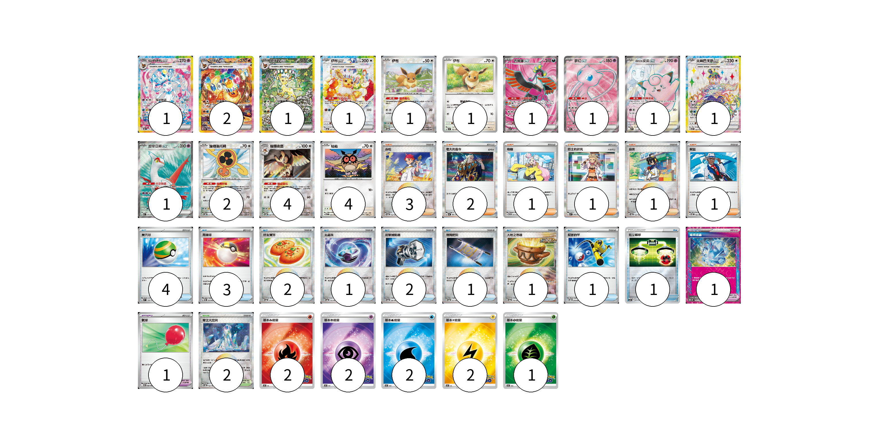 牌組構築方案 以此牌組為基礎新構築牌組 顯示卡面 顯示列表 寶可夢卡(22) 1 2 1 1 1 1 1 1 1 1 1 2 4 4 寶可夢道具(2) 1 1 物品卡(16) 4 3 2 1 2 1 1 1 1 支援者卡(9) 3 2 1 1 1 1 競技場卡(2) 2 能量卡(9) 2 2 2 2 1 寶可夢卡(22) 卡牌名稱 張數 卡牌名稱 張數 仙子伊布ex SV8a 212/187 01 火伊布ex SV8a 202/187 02 葉伊布ex SV8a 200/187 01 伊布ex SV8a 224/187 01 伊布 SV8a 125/187 01 伊布 SV2a 133/165 01 吉雉雞ex SV6a 081/064 01 夢幻ex SV2a 195/165 01 莉莉艾的皮皮ex SV9 115/100 01 太樂巴戈斯ex SV7 122/102 01 拉帝亞斯ex SV7a 078/064 01 旋轉洛托姆 SV8a 131/187 02 貓頭夜鷹 SV8a 128/187 04 咕咕 SV7 076/102 04 寶可夢道具(2) 卡牌名稱 張數 卡牌名稱 張數 璀璨結晶 SV8a 152/187 01 氣球 SV11B 082/086 01 物品卡(16) 卡牌名稱 張數 卡牌名稱 張數 巢穴球 SVM 133/175 04 高級球 SVQL 015/022 03 好友寶芬 SV8a 147/187 02 太晶珠 SV8a 145/187 01 反擊捕捉器 SV8a 139/187 02 夜間擔架 SV8a 151/187 01 大地之容器 SV8a 143/187 01 厲害釣竿 SVOD 010/020 01 能量轉移 SO 017/030 01 支援者卡(9) 卡牌名稱 張數 卡牌名稱 張數 赤松 SV8a 163/187 03 老大的指令 SV4a 181/190 02 奇樹 SVTG 017/019 01 博士的研究(奧琳博士) SV1S 076/078 01 烏栗 SV8a 169/187 01 席藍 SV8 102/106 01 競技場卡(2) 卡牌名稱 張數 卡牌名稱 張數 零之大空洞 SV8a 182/187 02 能量卡(9) 卡牌名稱 張數 卡牌名稱 張數 基本火能量 S10b FIR 02 基本超能量 S10b PSY 02 基本水能量 S10b WAT 02 基本雷能量 S10b LIG 02 基本草能量 S10b GRA 01 以此牌組為基礎新構築牌組 牌組編碼 GILYMA-pbxamB-djTANO copy 列印牌組單 牌組編碼已複製 分享至SNS