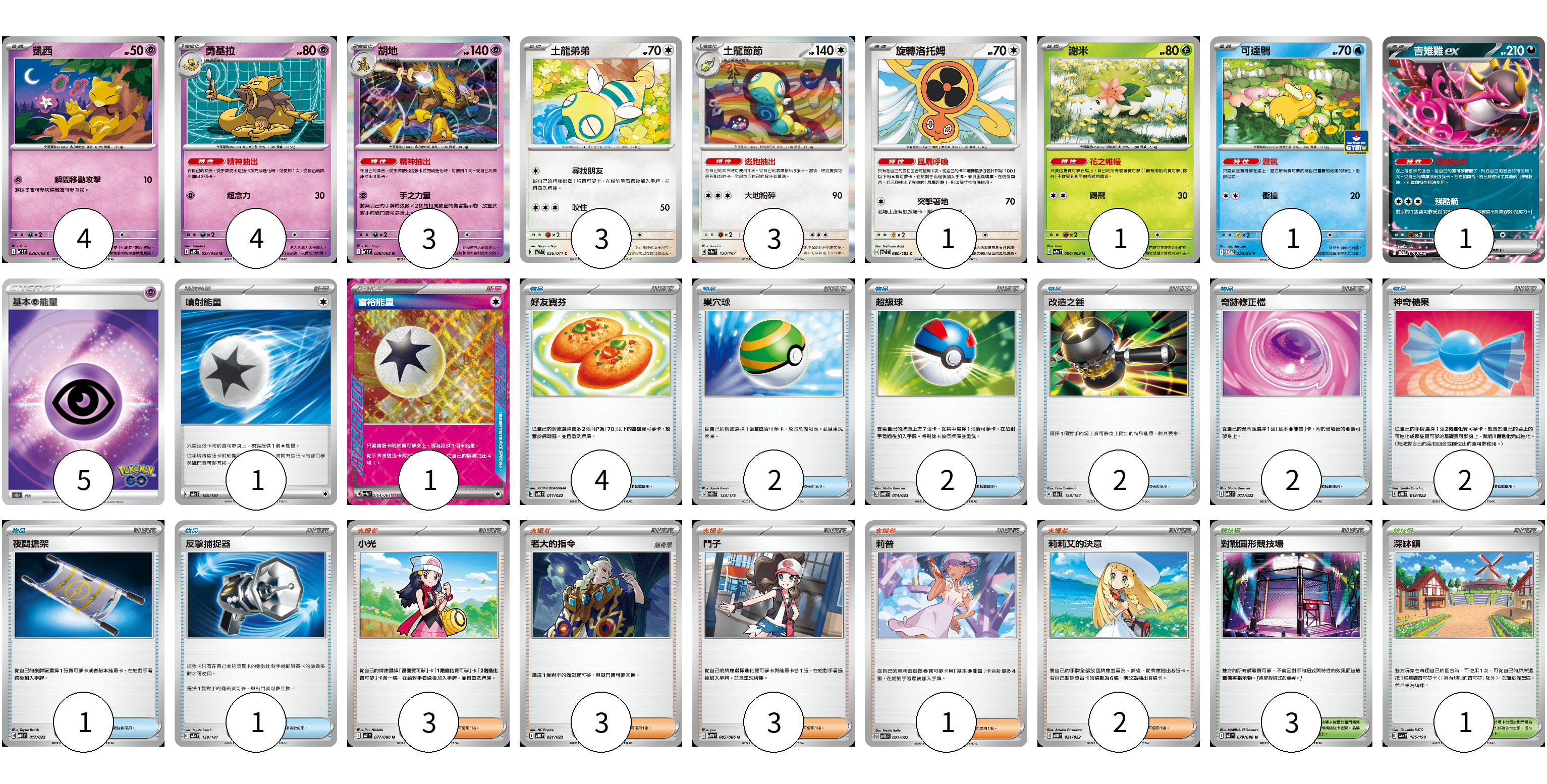 牌組構築方案 以此牌組為基礎新構築牌組 顯示卡面 顯示列表 寶可夢卡(21) 4 4 3 3 3 1 1 1 1 物品卡(16) 4 2 2 2 2 2 1 1 支援者卡(12) 3 3 3 1 2 競技場卡(4) 3 1 能量卡(7) 5 1 1 寶可夢卡(21) 卡牌名稱 張數 卡牌名稱 張數 凱西 M1S 036/063 04 勇基拉 M1S 037/063 04 胡地 M1S 038/063 03 土龍弟弟 SV2P 056/071 03 土龍節節 SV8a 130/187 03 旋轉洛托姆 SV7 080/102 01 謝米 SV9a 006/063 01 可達鴨 SV-P 220/SV-P 01 吉雉雞ex SVOM 009/021 01 物品卡(16) 卡牌名稱 張數 卡牌名稱 張數 好友寶芬 MBG 011/022 04 巢穴球 SVM 133/175 02 超級球 SVQP 014/023 02 改造之錘 SV8a 138/187 02 奇跡修正檔 MBD 017/022 02 神奇糖果 MBG 013/022 02 夜間擔架 MBG 017/022 01 反擊捕捉器 SV8a 139/187 01 支援者卡(12) 卡牌名稱 張數 卡牌名稱 張數 小光 M2 077/080 03 老大的指令 MBG 021/022 03 鬥子 SV11W 085/086 03 莉普 SVTS 021/022 01 莉莉艾的決意 MBD 021/022 02 競技場卡(4) 卡牌名稱 張數 卡牌名稱 張數 對戰圓形競技場 M2 079/080 03 深缽鎮 SV4a 185/190 01 能量卡(7) 卡牌名稱 張數 卡牌名稱 張數 基本超能量 S10b PSY 05 噴射能量 SV8a 185/187 01 富裕能量 SV7a 064/064 01 以此牌組為基礎新構築牌組 牌組編碼 GKOGZK-OQTLpb-QxRVce copy 列印牌組單 牌組編碼已複製 分享至SNS