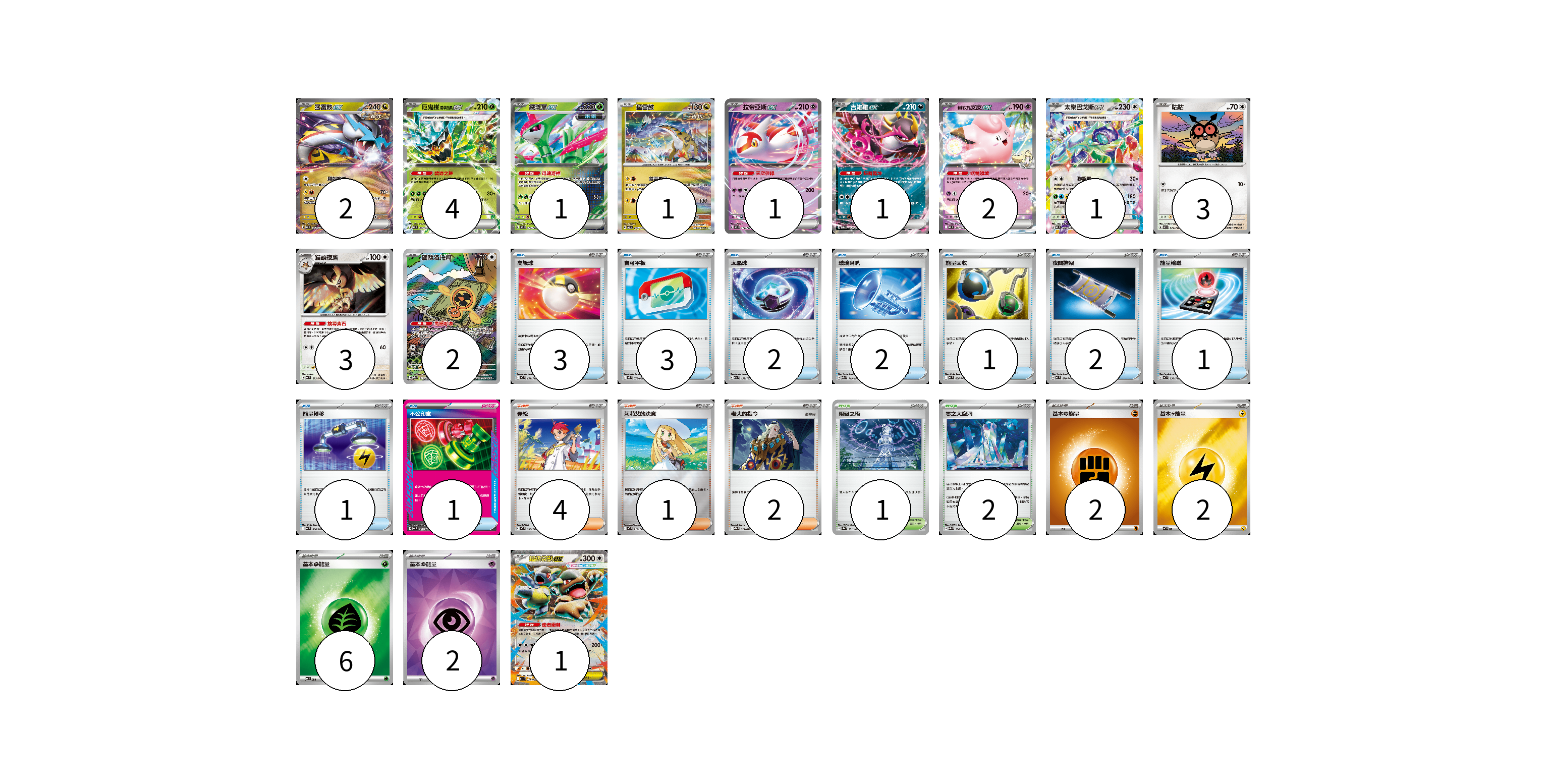牌組構築方案 以此牌組為基礎新構築牌組 顯示卡面 顯示列表 寶可夢卡(22) 2 4 1 1 1 1 2 1 3 3 2 1 物品卡(16) 3 3 2 2 1 2 1 1 1 支援者卡(7) 4 1 2 競技場卡(3) 1 2 能量卡(12) 2 2 6 2 寶可夢卡(22) 卡牌名稱 張數 卡牌名稱 張數 猛雷鼓ex MC 554/742 02 厄鬼椪 碧草面具ex MC 082/742 04 鐵斑葉ex MC 077/742 01 猛雷鼓 SV7 075/102 01 拉帝亞斯ex MC 312/742 01 吉雉雞ex M2a 114/193 01 <莉莉艾的>皮皮ex MC 287/742 02 太樂巴戈斯ex MC 630/742 01 咕咕 MC 572/742 03 貓頭夜鷹 MC 573/742 03 旋轉洛托姆 M2a 213/193 02 超級袋獸ex M1S 051/063 01 物品卡(16) 卡牌名稱 張數 卡牌名稱 張數 高級球 MC 651/742 03 寶可平板 M3 070/080 03 太晶珠 M2a 152/193 02 玻璃喇叭 M2a 149/193 02 能量回收 MC 636/742 01 夜間擔架 MC 670/742 02 能量輸送 MC 639/742 01 能量轉移 MC 638/742 01 不公印章 MC 633/742 01 支援者卡(7) 卡牌名稱 張數 卡牌名稱 張數 赤松 MC 696/742 04 莉莉艾的決意 MC 729/742 01 老大的指令 MBG 021/022 02 競技場卡(3) 卡牌名稱 張數 卡牌名稱 張數 阻礙之塔 SV8a 181/187 01 零之大空洞 M2a 184/193 02 能量卡(12) 卡牌名稱 張數 卡牌名稱 張數 基本【鬥】能量 MC FIG 02 基本【雷】能量 MC LIG 02 基本【草】能量 MC GRA 06 基本【超】能量 SVOD PSY 02 以此牌組為基礎新構築牌組 牌組編碼 GNwLcj-OayvXI-VPvSBx copy 列印牌組單 牌組編碼已複製 分享至SNS
