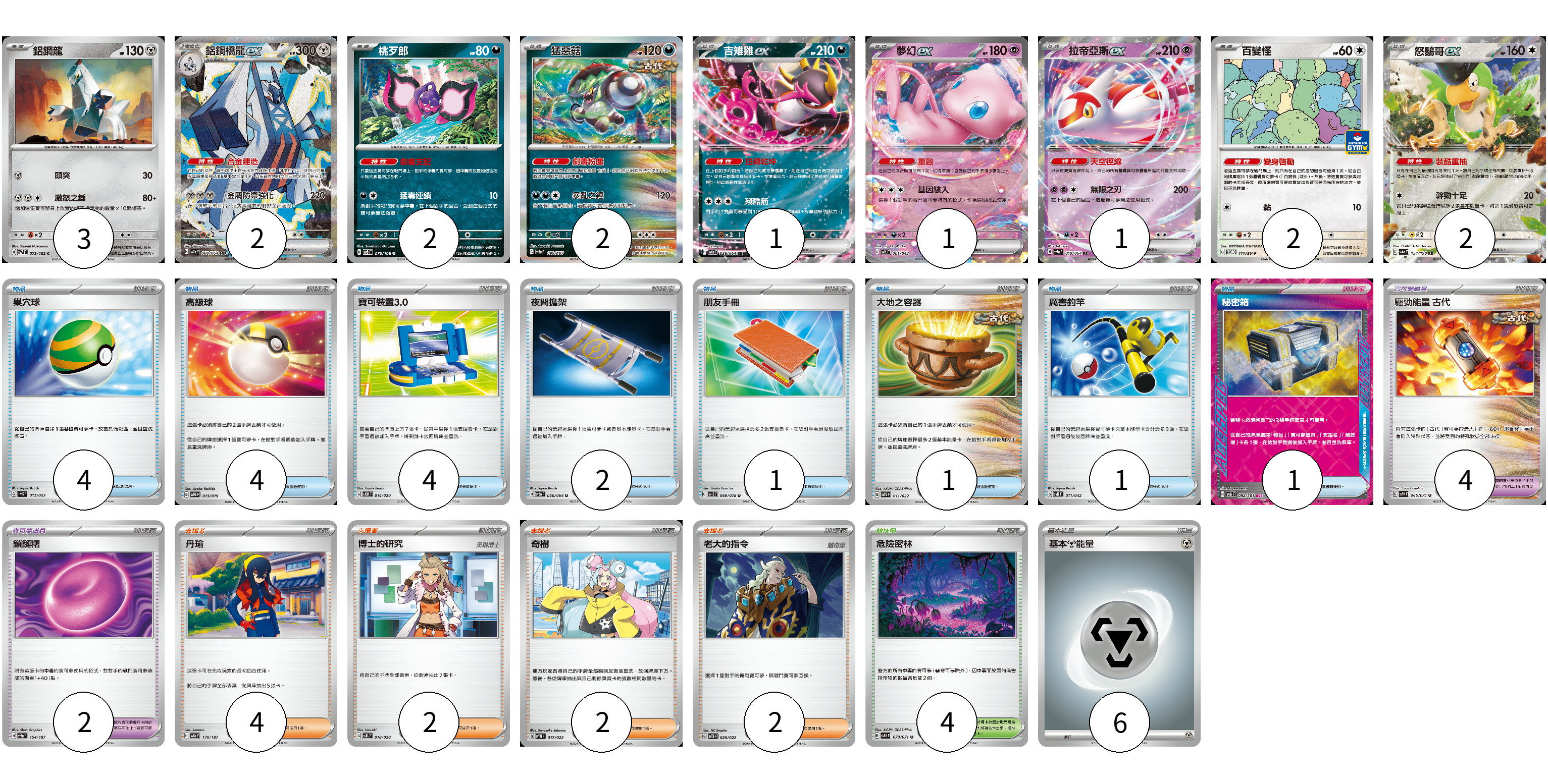 牌組構築方案 以此牌組為基礎新構築牌組 顯示卡面 顯示列表 寶可夢卡(16) 3 2 2 2 1 1 1 2 2 寶可夢道具(6) 4 2 物品卡(18) 4 4 4 2 1 1 1 1 支援者卡(10) 4 2 2 2 競技場卡(4) 4 能量卡(6) 6 寶可夢卡(16) 卡牌名稱 張數 卡牌名稱 張數 鋁鋼龍 SV7 072/102 03 鋁鋼橋龍ex SV7a 088/064 02 桃歹郎 SV8 075/106 02 猛惡菇 SV8a 099/187 02 吉雉雞ex SV6a 038/064 01 夢幻ex SVK 001/042 01 拉帝亞斯ex SV7a 019/064 01 百變怪 SV-P 111/SV-P 02 怒鸚哥ex SV4a 154/190 02 寶可夢道具(6) 卡牌名稱 張數 卡牌名稱 張數 驅勁能量 古代 SV5K 065/071 04 鎖鏈糬 SV8a 154/187 02 物品卡(18) 卡牌名稱 張數 卡牌名稱 張數 巢穴球 SVHK 012/022 04 高級球 SVTG 013/019 04 寶可裝置3.0 SVEM 014/020 04 夜間擔架 SV6a 056/064 02 朋友手冊 SV1S 069/078 01 大地之容器 SVTS 011/022 01 厲害釣竿 SVK 011/042 01 秘密箱 SV6 092/101 01 支援者卡(10) 卡牌名稱 張數 卡牌名稱 張數 丹瑜 SV8a 170/187 04 博士的研究 SVEL 018/020 02 奇樹 SVTM 017/022 02 老大的指令 SVTS 020/022 02 競技場卡(4) 卡牌名稱 張數 卡牌名稱 張數 危險密林 SV5K 070/071 04 能量卡(6) 卡牌名稱 張數 卡牌名稱 張數 基本鋼能量 sv-p MET 06 以此牌組為基礎新構築牌組 牌組編碼 GOXqDH-BjzOGX-DZOcUK copy 列印牌組單 牌組編碼已複製 分享至SNS
