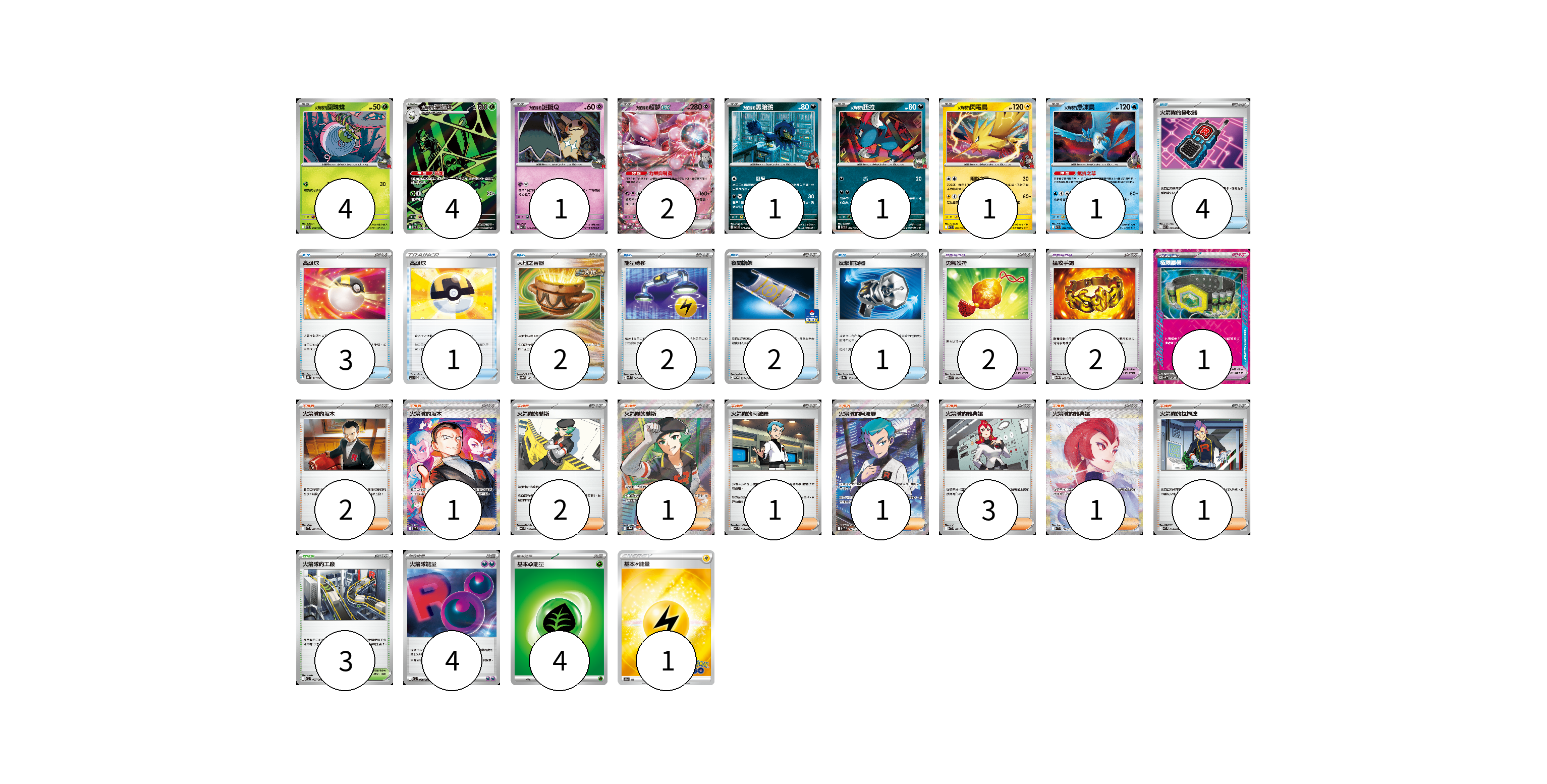 牌組構築方案 以此牌組為基礎新構築牌組 顯示卡面 顯示列表 寶可夢卡(15) 4 4 1 2 1 1 1 1 寶可夢道具(5) 2 2 1 物品卡(15) 4 3 1 2 2 2 1 支援者卡(13) 2 1 2 1 1 1 3 1 1 競技場卡(3) 3 能量卡(9) 4 4 1 寶可夢卡(15) 卡牌名稱 張數 卡牌名稱 張數 <火箭隊的>團珠蛛 SV10 008/098 04 <火箭隊的>操陷蛛 SV10 099/098 04 <火箭隊的>謎擬Q SV10 042/098 01 <火箭隊的>超夢ex SV10 039/098 02 <火箭隊的>黑暗鴉 SV10 071/098 01 <火箭隊的>狃拉 SV10 072/098 01 <火箭隊的>閃電鳥 SV10 033/098 01 <火箭隊的>急凍鳥 SV10 022/098 01 寶可夢道具(5) 卡牌名稱 張數 卡牌名稱 張數 勇氣護符 SVK 024/042 02 猛攻手鐲 SV11W 082/086 02 極限腰帶 SV5K 066/071 01 物品卡(15) 卡牌名稱 張數 卡牌名稱 張數 火箭隊的接收器 SV10 090/098 04 高級球 SVHK 013/022 03 高級球 S12a 138/172 01 大地之容器 SV8a 143/187 02 能量轉移 SVK 008/042 02 夜間擔架 SV-P 227/SV-P 02 反擊捕捉器 SV8a 139/187 01 支援者卡(13) 卡牌名稱 張數 卡牌名稱 張數 火箭隊的坂木 SV10 093/098 02 火箭隊的坂木 SV10 129/098 01 火箭隊的蘭斯 SV10 095/098 02 火箭隊的蘭斯 SV10 123/098 01 火箭隊的阿波羅 SV10 092/098 01 火箭隊的阿波羅 SV10 120/098 01 火箭隊的雅典娜 SV10 091/098 03 火箭隊的雅典娜 SV10 128/098 01 火箭隊的拉姆達 SV10 094/098 01 競技場卡(3) 卡牌名稱 張數 卡牌名稱 張數 火箭隊的工廠 SV10 097/098 03 能量卡(9) 卡牌名稱 張數 卡牌名稱 張數 火箭隊能量 SV10 098/098 04 基本草能量 sv-p GRA 04 基本雷能量 S10b LIG 01 以此牌組為基礎新構築牌組 牌組編碼 GOkspi-AWefRn-NoDIgR copy 列印牌組單 牌組編碼已複製 分享至SNS