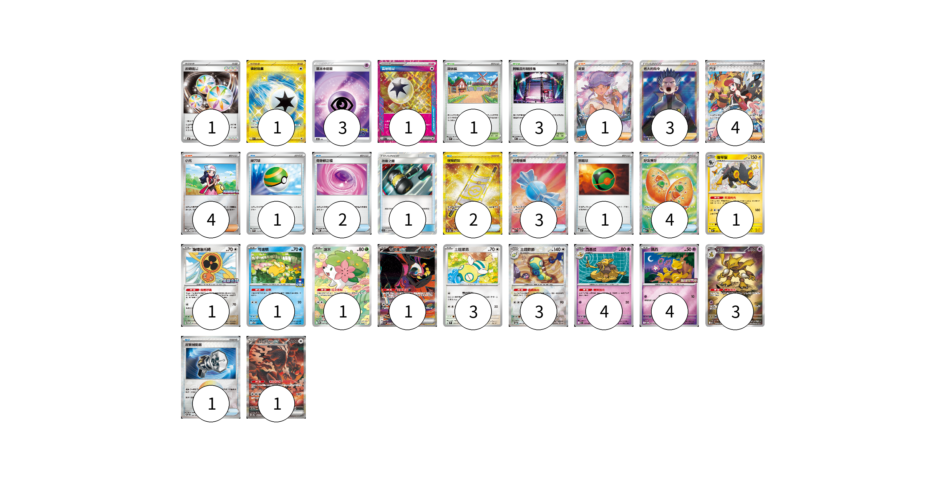 牌組構築方案 以此牌組為基礎新構築牌組 顯示卡面 顯示列表 寶可夢卡(23) 1 1 1 1 1 3 3 4 4 3 1 物品卡(15) 1 2 1 2 3 1 4 1 支援者卡(12) 1 3 4 4 競技場卡(4) 1 3 能量卡(6) 1 1 3 1 寶可夢卡(23) 卡牌名稱 張數 卡牌名稱 張數 倫琴貓 SV4a 242/190 01 旋轉洛托姆 SV-P 146/SV-P 01 可達鴨 SV-P 220/SV-P 01 謝米 SV9a 066/063 01 吉雉雞ex SV6a 089/064 01 土龍弟弟 SV2P 056/071 03 土龍節節 SV8a 130/187 03 勇基拉 M1S 037/063 04 凱西 M-P 004/M-P 04 胡地 M1S 071/063 03 月月熊 赫月ex SV8a 225/187 01 物品卡(15) 卡牌名稱 張數 卡牌名稱 張數 巢穴球 SVAW 014/023 01 奇跡修正檔 MBD 017/022 02 改造之錘 AS5a 177/184 01 夜間擔架 SV8 137/106 02 神奇糖果 M1S 082/063 03 黑暗球 SV7a 054/064 01 好友寶芬 M1S 081/063 04 反擊捕捉器 SV8a 139/187 01 支援者卡(12) 卡牌名稱 張數 卡牌名稱 張數 莉普 SV4M 087/066 01 老大的指令(赤日) S12a 250/172 03 鬥子 SV11W 173/086 04 小光 M-P 028/M-P 04 競技場卡(4) 卡牌名稱 張數 卡牌名稱 張數 深缽鎮 SVK 039/042 01 對戰圓形競技場 M2 079/080 03 能量卡(6) 卡牌名稱 張數 卡牌名稱 張數 反轉能量 SV4a 189/190 01 噴射能量 SV7a 094/064 01 基本超能量 S10b PSY 03 富裕能量 SV7a 064/064 01 以此牌組為基礎新構築牌組 牌組編碼 GQJlXK-cqjBQB-wHLdbK copy 列印牌組單 牌組編碼已複製 分享至SNS