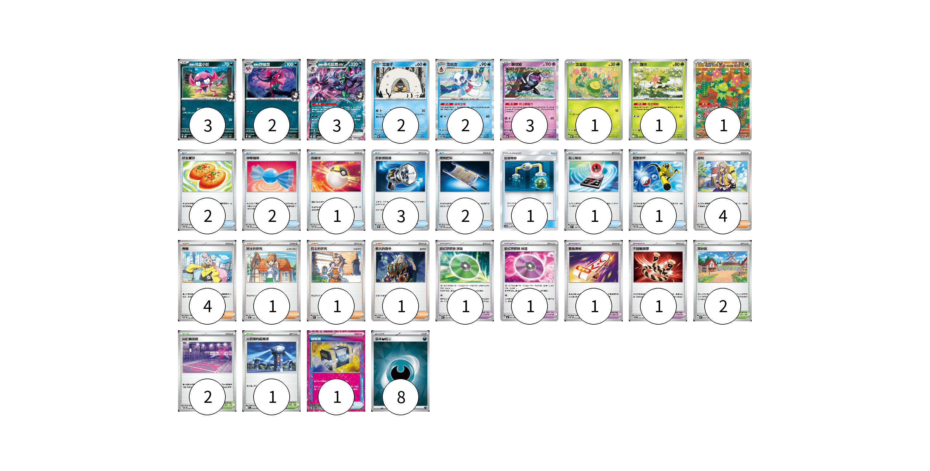 牌組構築方案 以此牌組為基礎新構築牌組 顯示卡面 顯示列表 寶可夢卡(18) 3 2 3 2 2 3 1 1 1 寶可夢道具(4) 1 1 1 1 物品卡(14) 2 2 1 3 2 1 1 1 1 支援者卡(11) 4 4 1 1 1 競技場卡(5) 2 2 1 能量卡(8) 8 寶可夢卡(18) 卡牌名稱 張數 卡牌名稱 張數 <瑪俐的>搗蛋小妖 SVOM 005/021 03 <瑪俐的>詐唬魔 SVOM 006/021 02 <瑪俐的>長毛巨魔ex SVOM 007/021 03 雪童子 SV8a 037/187 02 雪妖女 SV6 033/101 02 願增猿 SV8a 075/187 03 含羞苞 SV8a 001/187 01 謝米 SV9a 006/063 01 沙鈴仙人掌 SV9 101/100 01 寶可夢道具(4) 卡牌名稱 張數 卡牌名稱 張數 招式學習器 演進 SVK 025/042 01 招式學習器 衰退 SV4K 063/066 01 緊急滑板 SVOD 015/020 01 不服輸頭帶 SVTL 016/021 01 物品卡(14) 卡牌名稱 張數 卡牌名稱 張數 好友寶芬 SVOD 011/020 02 神奇糖果 SVOD 013/020 02 高級球 SVOD 012/020 01 反擊捕捉器 SV8a 139/187 03 夜間擔架 SVOM 016/021 02 能量轉移 AS6D 142/168 01 能量輸送 SVM 128/175 01 厲害釣竿 SVOD 010/020 01 秘密箱 SV6 092/101 01 支援者卡(11) 卡牌名稱 張數 卡牌名稱 張數 派帕 SVOD 018/020 04 奇樹 SVOD 016/020 04 博士的研究 SVM 166/175 01 博士的研究 SVM 170/175 01 老大的指令 SVTR 019/021 01 競技場卡(5) 卡牌名稱 張數 卡牌名稱 張數 深缽鎮 SVK 039/042 02 尖釘鎮道館 SVOM 021/021 02 火箭隊的監視塔 SV10 096/098 01 能量卡(8) 卡牌名稱 張數 卡牌名稱 張數 基本【惡】能量 SVOM DAR 08 以此牌組為基礎新構築牌組 牌組編碼 GVLIxC-dqSlgf-EdTFNQ copy 列印牌組單 牌組編碼已複製 分享至SNS