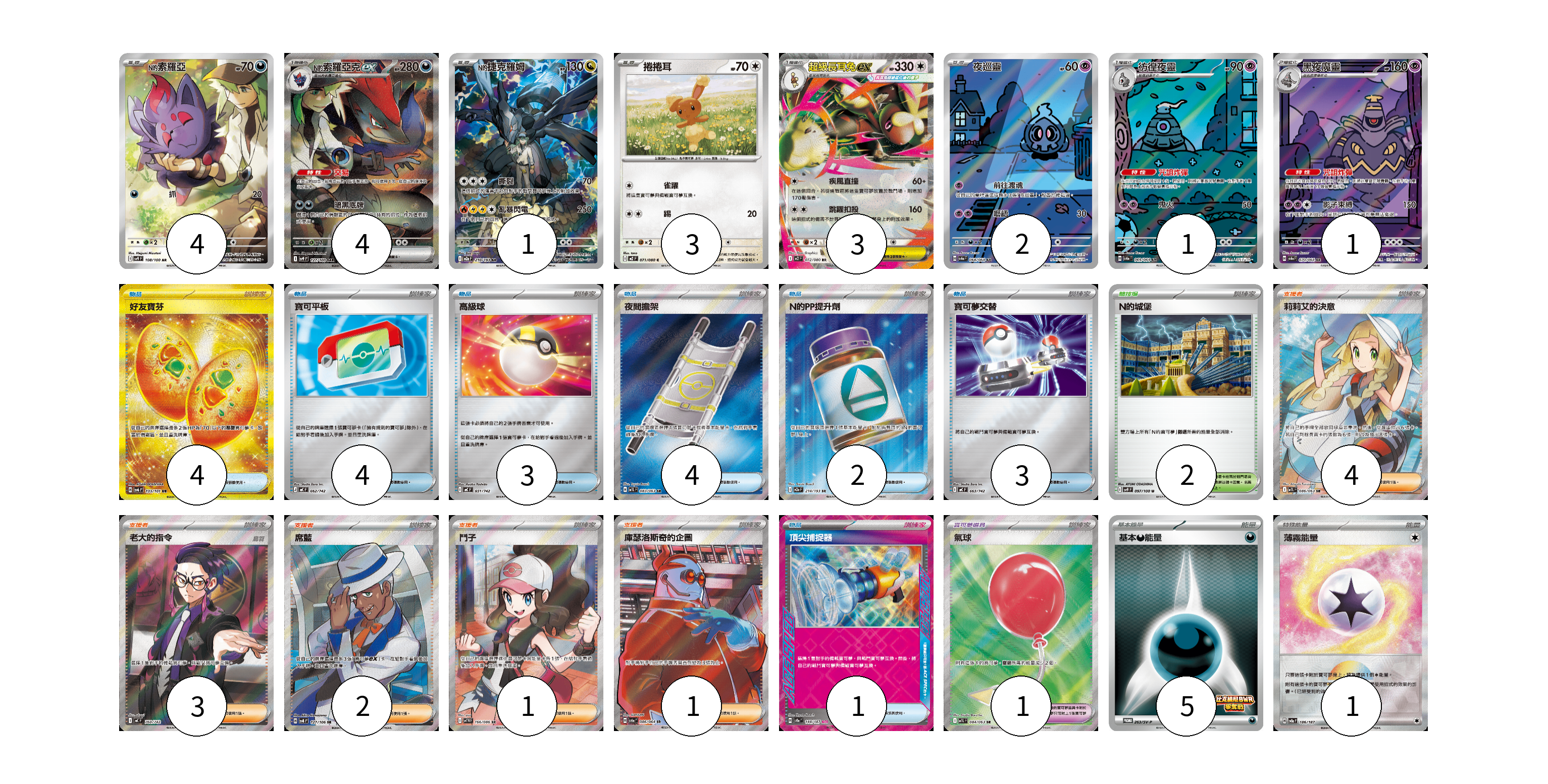 牌組構築方案 以此牌組為基礎新構築牌組 顯示卡面 顯示列表 寶可夢卡(19) 4 4 1 3 3 2 1 1 寶可夢道具(1) 1 物品卡(21) 4 4 3 4 2 3 1 支援者卡(11) 4 3 2 1 1 競技場卡(2) 2 能量卡(6) 5 1 寶可夢卡(19) 卡牌名稱 張數 卡牌名稱 張數 N的索羅亞 SV9 108/100 04 N的索羅亞克ex SV9 127/100 04 N的捷克羅姆 M2a 210/193 01 捲捲耳 M2 071/080 03 超級長耳兔ex M2 072/080 03 夜巡靈 SV6a 068/064 02 彷徨夜靈 SV6a 069/064 01 黑夜魔靈 SV6a 070/064 01 寶可夢道具(1) 卡牌名稱 張數 卡牌名稱 張數 氣球 M1L 084/063 01 物品卡(21) 卡牌名稱 張數 卡牌名稱 張數 好友寶芬 SV6 133/101 04 寶可平板 MC 662/742 04 高級球 MC 651/742 03 夜間擔架 M1L 083/063 04 N的PP提升劑 M2a 214/193 02 寶可夢交替 MC 663/742 03 頂尖捕捉器 SV8a 148/187 01 支援者卡(11) 卡牌名稱 張數 卡牌名稱 張數 莉莉艾的決意 M1L 086/063 04 老大的指令(烏羽) MC 760/742 03 席藍 SV8 127/106 02 鬥子 SV11W 166/086 01 庫瑟洛斯奇的企圖 SV6a 086/064 01 競技場卡(2) 卡牌名稱 張數 卡牌名稱 張數 N的城堡 SV9 097/100 02 能量卡(6) 卡牌名稱 張數 卡牌名稱 張數 基本【惡】能量 SV-P 263/SV-P 05 薄霧能量 SV8a 186/187 01 以此牌組為基礎新構築牌組 牌組編碼 GVjixk-CTBWoH-LDjrPg copy 列印牌組單 牌組編碼已複製 分享至SNS