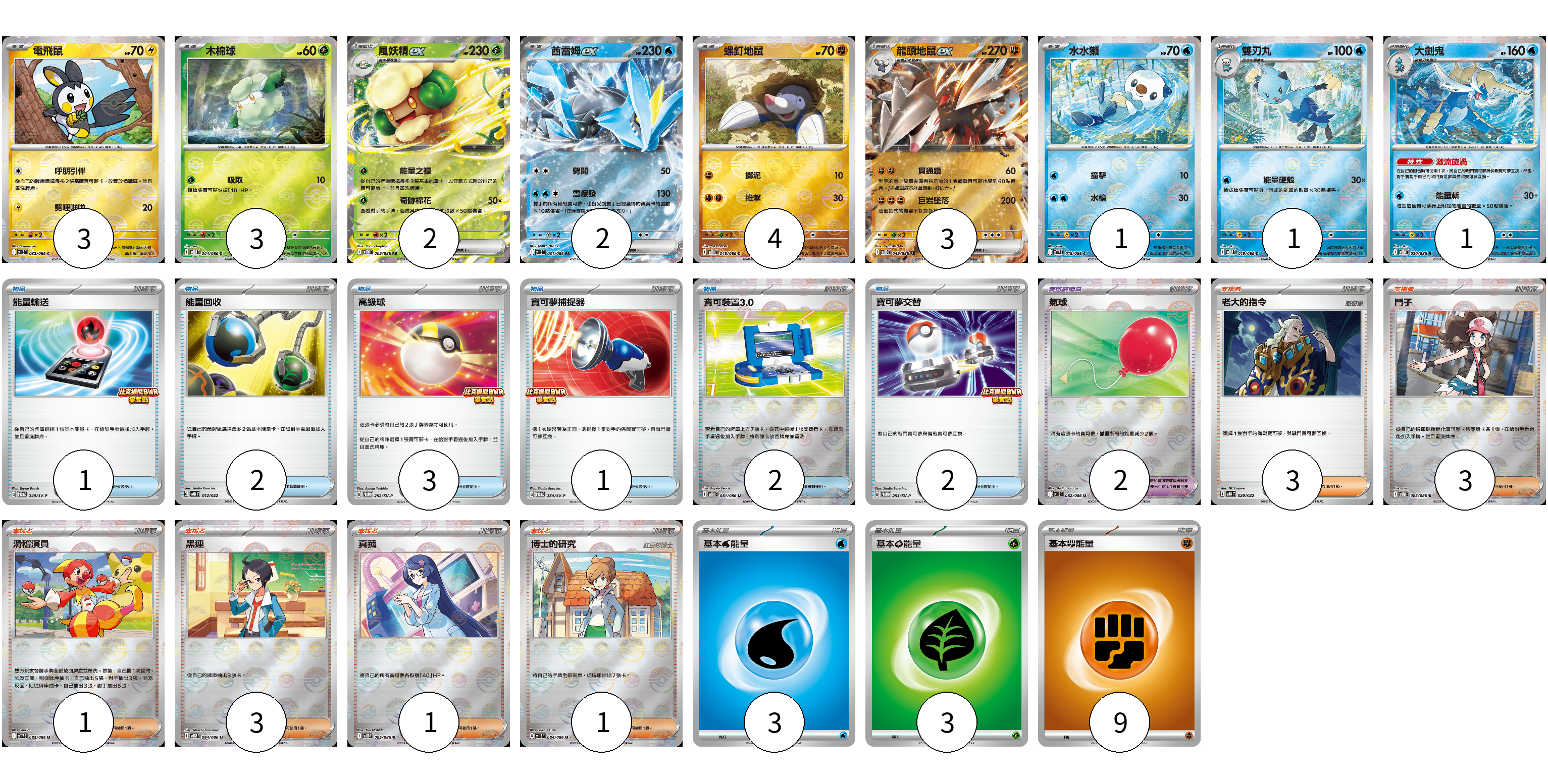 牌組構築方案 以此牌組為基礎新構築牌組 顯示卡面 顯示列表 寶可夢卡(20) 3 3 2 2 4 3 1 1 1 寶可夢道具(2) 2 物品卡(11) 1 2 3 1 2 2 支援者卡(12) 3 3 1 3 1 1 能量卡(15) 3 3 9 寶可夢卡(20) 卡牌名稱 張數 卡牌名稱 張數 電飛鼠 SV11B 032/086 03 木棉球 SV11W 004/086 03 風妖精ex SV11W 005/086 02 酋雷姆ex SV11B 031/086 02 螺釘地鼠 SV11B 048/086 04 龍頭地鼠ex SV11B 049/086 03 水水獺 SV11W 018/086 01 雙刃丸 SV11W 019/086 01 大劍鬼 SV11W 020/086 01 寶可夢道具(2) 卡牌名稱 張數 卡牌名稱 張數 氣球 SV11B 082/086 02 物品卡(11) 卡牌名稱 張數 卡牌名稱 張數 能量輸送 SV-P 249/SV-P 01 能量回收 SVQL 012/022 02 高級球 SV-P 252/SV-P 03 寶可夢捕捉器 SV-P 254/SV-P 01 寶可裝置3.0 SV11B 081/086 02 寶可夢交替 SV-P 253/SV-P 02 支援者卡(12) 卡牌名稱 張數 卡牌名稱 張數 老大的指令 MBD 020/022 03 鬥子 SV11W 085/086 03 滑稽演員 SV11W 083/086 01 黑連 SV11W 084/086 03 真菰 SV11B 085/086 01 博士的研究 SV11B 084/086 01 能量卡(15) 卡牌名稱 張數 卡牌名稱 張數 基本水能量 sv-p WAT 03 基本草能量 sv-p GRA 03 基本【鬥】能量 SVAM FIG 09 以此牌組為基礎新構築牌組 牌組編碼 GWanFJ-IUVkdo-GLksAM copy 列印牌組單 牌組編碼已複製 分享至SNS