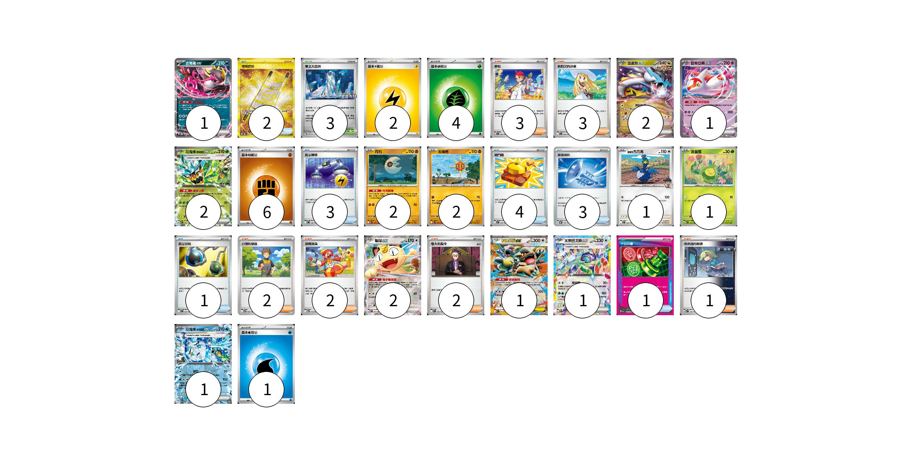 牌組構築方案 以此牌組為基礎新構築牌組 顯示卡面 顯示列表 寶可夢卡(17) 1 2 1 2 2 2 1 1 2 1 1 1 物品卡(14) 2 3 4 3 1 1 支援者卡(13) 3 3 2 2 2 1 競技場卡(3) 3 能量卡(13) 2 4 6 1 寶可夢卡(17) 卡牌名稱 張數 卡牌名稱 張數 吉雉雞ex SVOD 004/020 01 猛雷鼓ex MC 554/742 02 拉帝亞斯ex MC 312/742 01 厄鬼椪 碧草面具ex MC 082/742 02 月石 MC 371/742 02 太陽岩 MC 372/742 02 <赫普的>古月鳥 MC 624/742 01 含羞苞 M2a 011/193 01 喵喵ex M3 061/080 02 超級袋獸ex M1S 051/063 01 太樂巴戈斯ex MC 630/742 01 厄鬼椪 水井面具ex MC 224/742 01 物品卡(14) 卡牌名稱 張數 卡牌名稱 張數 夜間擔架 SV8 137/106 02 能量轉移 MC 638/742 03 戰鬥鑼 MC 654/742 04 玻璃喇叭 SV8a 140/187 03 能量回收 MC 636/742 01 不公印章 MC 633/742 01 支援者卡(13) 卡牌名稱 張數 卡牌名稱 張數 赤松 MC 696/742 03 莉莉艾的決意 MC 729/742 03 小剛的發掘 SV9 096/100 02 滑稽演員 SVQL 019/022 02 老大的指令 MC 724/742 02 暗碼迷的解讀 MC 698/742 01 競技場卡(3) 卡牌名稱 張數 卡牌名稱 張數 零之大空洞 SV-P 151/SV-P 03 能量卡(13) 卡牌名稱 張數 卡牌名稱 張數 基本【雷】能量 MC LIG 02 基本【草】能量 MC GRA 04 基本【鬥】能量 MC FIG 06 基本【水】能量 MC WAT 01 以此牌組為基礎新構築牌組 牌組編碼 GWyfvz-wGhGuV-VeEgCg copy 列印牌組單 牌組編碼已複製 分享至SNS