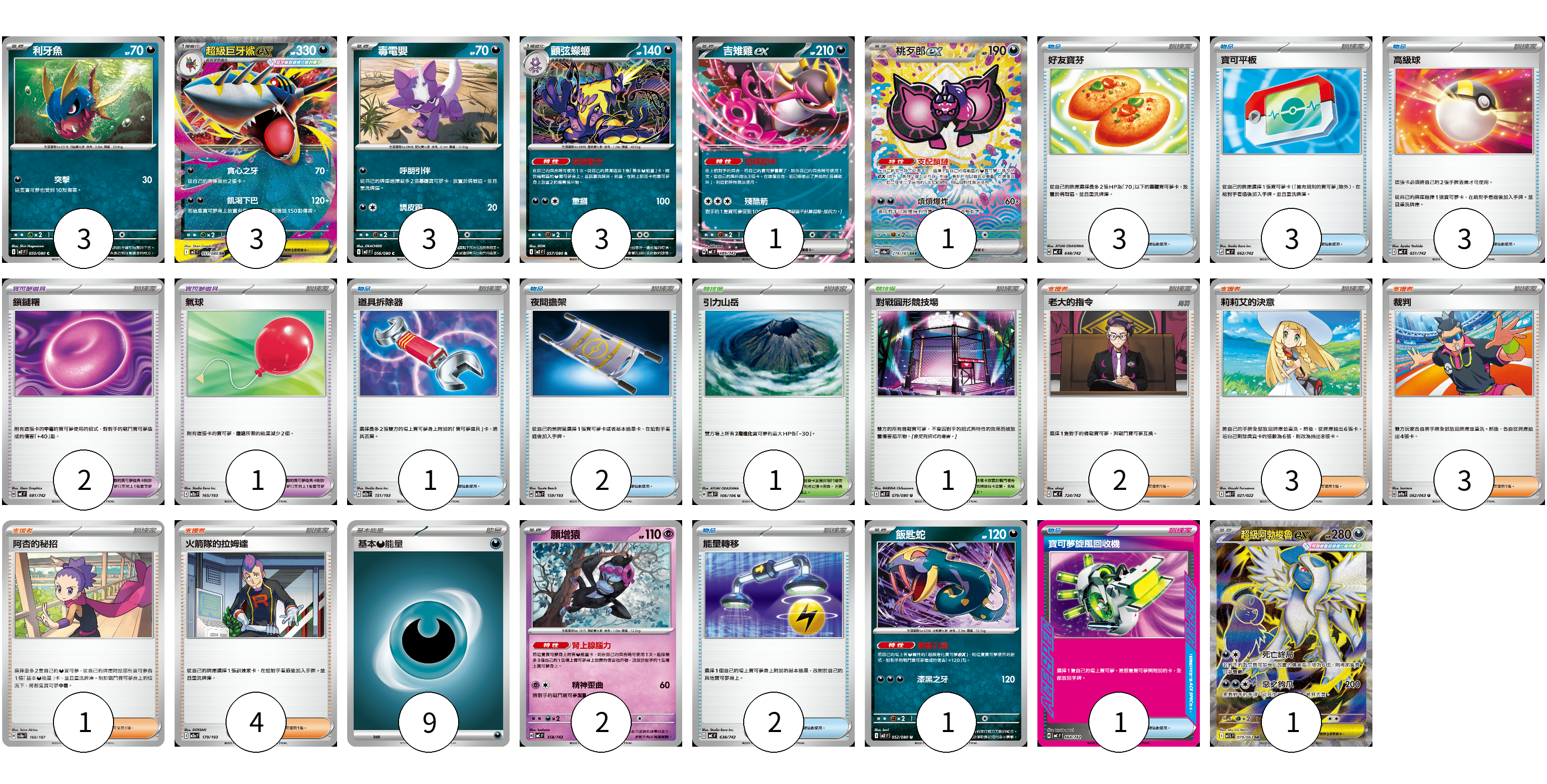 牌組構築方案 以此牌組為基礎新構築牌組 顯示卡面 顯示列表 寶可夢卡(18) 3 3 3 3 1 1 2 1 1 寶可夢道具(3) 2 1 物品卡(15) 3 3 3 1 2 2 1 支援者卡(13) 2 3 3 1 4 競技場卡(2) 1 1 能量卡(9) 9 寶可夢卡(18) 卡牌名稱 張數 卡牌名稱 張數 利牙魚 M2 050/080 03 超級巨牙鯊ex M2 051/080 03 毒電嬰 M2 056/080 03 顫弦蠑螈 M2 057/080 03 吉雉雞ex MC 489/742 01 桃歹郎ex SV8a 219/187 01 願增猿 MC 358/742 02 飯匙蛇 M2 052/080 01 超級阿勃梭魯ex M1L 079/063 01 寶可夢道具(3) 卡牌名稱 張數 卡牌名稱 張數 鎖鏈糬 MC 681/742 02 氣球 M2a 165/193 01 物品卡(15) 卡牌名稱 張數 卡牌名稱 張數 好友寶芬 MC 648/742 03 寶可平板 MC 662/742 03 高級球 MC 651/742 03 道具拆除器 M2a 151/193 01 夜間擔架 M2a 159/193 02 能量轉移 MC 638/742 02 寶可夢旋風回收機 MC 664/742 01 支援者卡(13) 卡牌名稱 張數 卡牌名稱 張數 老大的指令 MC 724/742 02 莉莉艾的決意 MBD 021/022 03 裁判 SV9a 062/063 03 阿杏的秘招 SV8a 166/187 01 火箭隊的拉姆達 M2a 179/193 04 競技場卡(2) 卡牌名稱 張數 卡牌名稱 張數 引力山岳 SV8 106/106 01 對戰圓形競技場 M2 079/080 01 能量卡(9) 卡牌名稱 張數 卡牌名稱 張數 基本惡能量 sv-p DAR 09 以此牌組為基礎新構築牌組 牌組編碼 GYAbQO-SxoYBM-VNMlzE copy 列印牌組單 牌組編碼已複製 分享至SNS