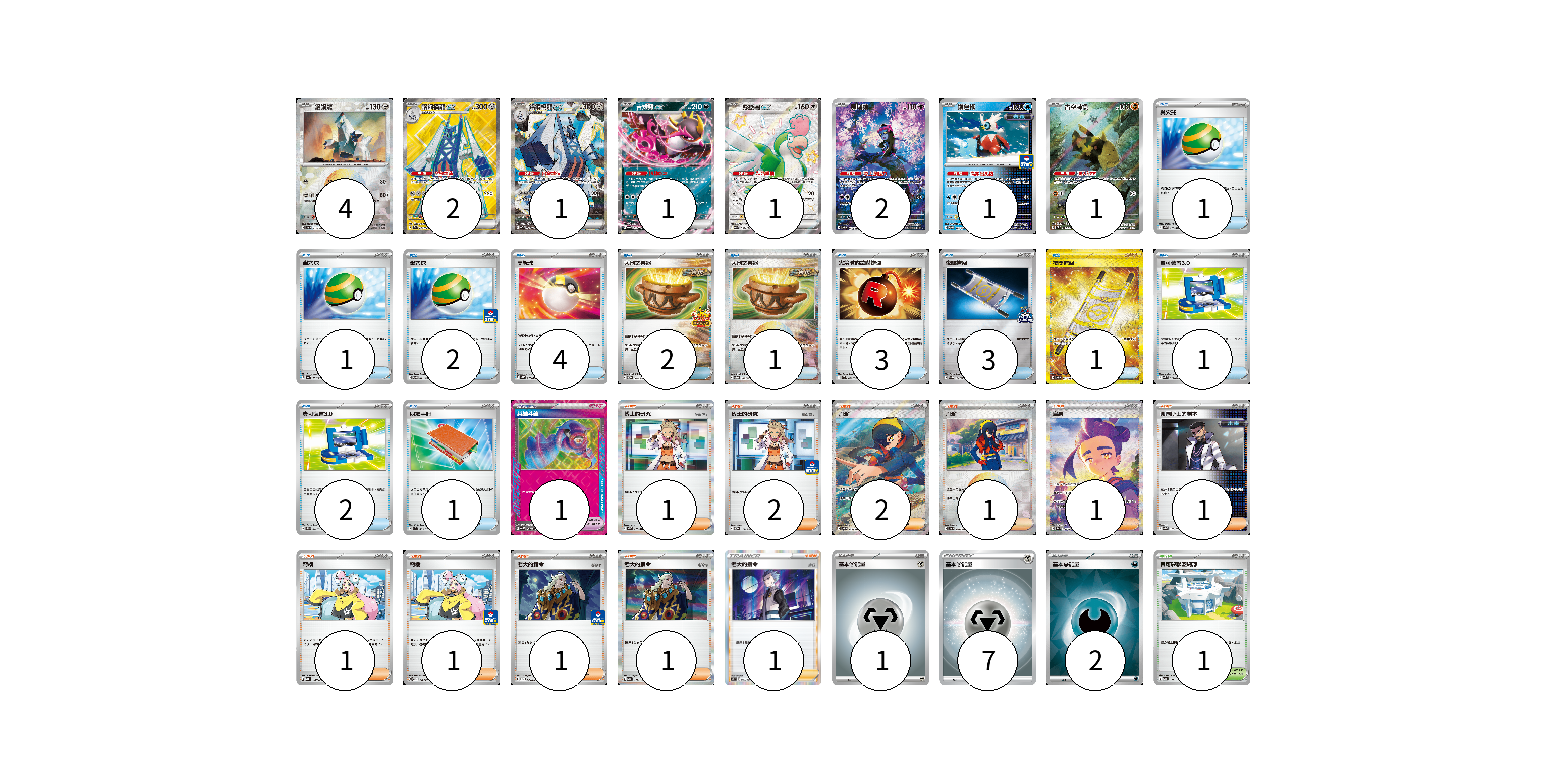 牌組構築方案 以此牌組為基礎新構築牌組 顯示卡面 顯示列表 寶可夢卡(13) 4 2 1 1 1 2 1 1 寶可夢道具(1) 1 物品卡(22) 1 1 2 4 2 1 3 3 1 1 2 1 支援者卡(13) 1 2 2 1 1 1 1 1 1 1 1 競技場卡(1) 1 能量卡(10) 1 7 2 寶可夢卡(13) 卡牌名稱 張數 卡牌名稱 張數 鋁鋼龍 SV8a 112/187 04 鋁鋼橋龍ex SV7a 080/064 02 鋁鋼橋龍ex SV7a 088/064 01 吉雉雞ex SV6a 038/064 01 怒鸚哥ex SV4a 337/190 01 願增猿 SV6 107/101 02 鐵包袱 SV-P 175/SV-P 01 古空棘魚 SV5K 077/071 01 寶可夢道具(1) 卡牌名稱 張數 卡牌名稱 張數 英雄斗篷 SV5M 064/071 01 物品卡(22) 卡牌名稱 張數 卡牌名稱 張數 巢穴球 SV1S 070/078 01 巢穴球 SV4a 159/190 01 巢穴球 SV-P 091/SV-P 02 高級球 SVHK 013/022 04 大地之容器 SV-P 084/SV-P 02 大地之容器 SV8a 143/187 01 火箭隊的驚嚇炸彈 SV10 089/098 03 夜間擔架 SV-P 204/SV-P 03 夜間擔架 SV8 137/106 01 寶可裝置3.0 SVK 021/042 01 寶可裝置3.0 SVEL 014/020 02 朋友手冊 SV1S 069/078 01 支援者卡(13) 卡牌名稱 張數 卡牌名稱 張數 博士的研究(奧琳博士) SV1S 076/078 01 博士的研究 SV-P 113/SV-P 02 丹瑜 SV6 123/101 02 丹瑜 SV8a 170/187 01 烏栗 SV8a 230/187 01 弗圖博士的劇本 SV8a 175/187 01 奇樹 SVHK 019/022 01 奇樹 SV-P 106/SV-P 01 老大的指令 SV-P 178/SV-P 01 老大的指令 SV4a 181/190 01 老大的指令(赤日) S9 097/100 01 競技場卡(1) 卡牌名稱 張數 卡牌名稱 張數 寶可夢聯盟總部 SV4a 186/190 01 能量卡(10) 卡牌名稱 張數 卡牌名稱 張數 基本【鋼】能量 SVB MET 01 基本【鋼】能量 SI MET 07 基本【惡】能量 SVK DAR 02 以此牌組為基礎新構築牌組 牌組編碼 GYzIbD-qBcvJA-VMNipy copy 列印牌組單 牌組編碼已複製 分享至SNS