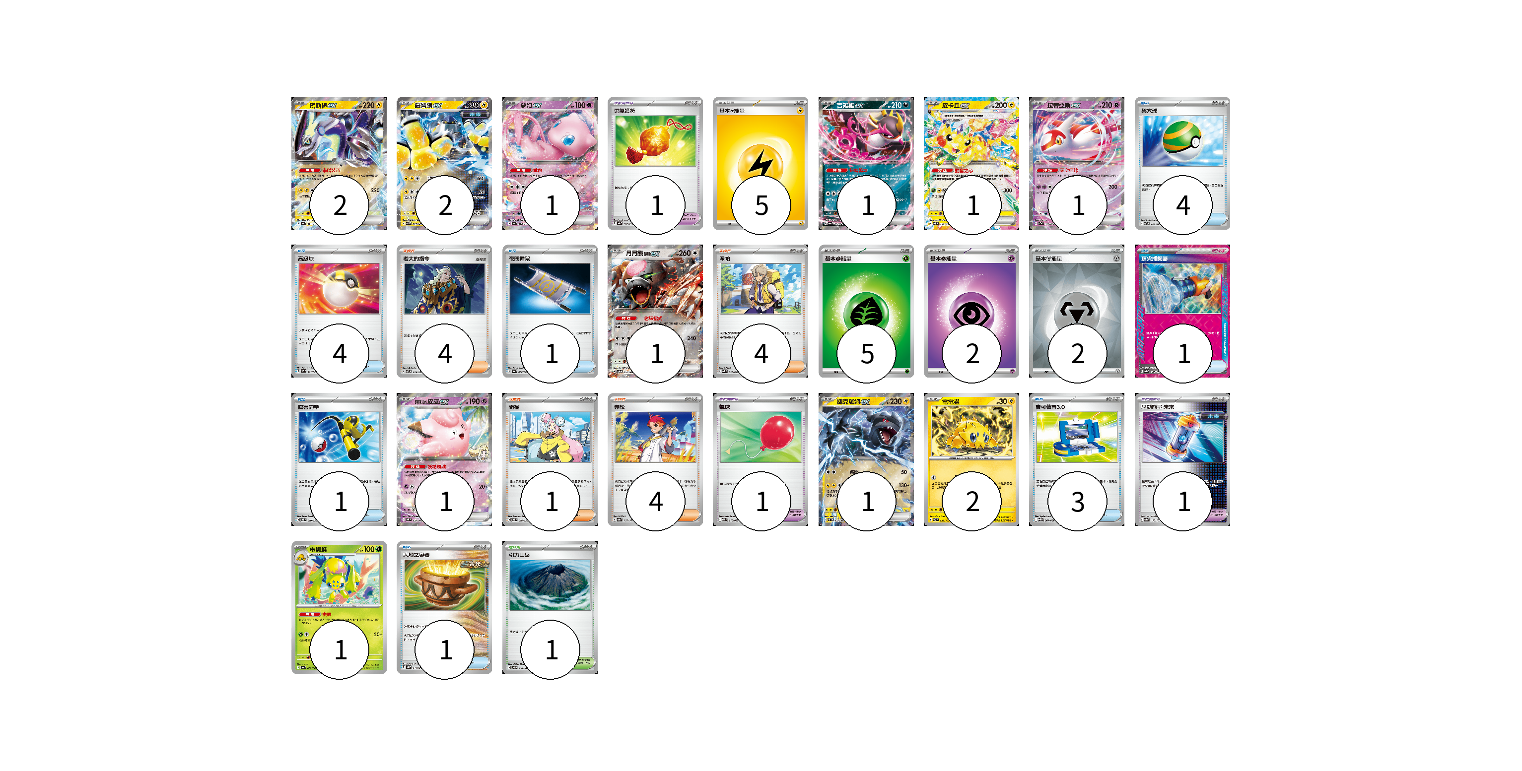 牌組構築方案 以此牌組為基礎新構築牌組 顯示卡面 顯示列表 寶可夢卡(14) 2 2 1 1 1 1 1 1 1 2 1 寶可夢道具(3) 1 1 1 物品卡(15) 4 4 1 1 1 3 1 支援者卡(13) 4 4 1 4 競技場卡(1) 1 能量卡(14) 5 5 2 2 寶可夢卡(14) 卡牌名稱 張數 卡牌名稱 張數 密勒頓ex SV4a 071/190 02 鐵臂膀ex SV4M 027/066 02 夢幻ex SV4a 076/190 01 吉雉雞ex SV6a 038/064 01 皮卡丘ex SV8 033/106 01 拉帝亞斯ex SV7a 019/064 01 月月熊 赫月 ex SV5a 052/066 01 莉莉艾的皮皮ex SV9 033/100 01 捷克羅姆ex SV11B 037/086 01 電電蟲 SV7 032/102 02 電蜘蛛 SV6a 002/064 01 寶可夢道具(3) 卡牌名稱 張數 卡牌名稱 張數 勇氣護符 SV4a 169/190 01 氣球 MBD 018/022 01 驅勁能量 未來 SV8a 158/187 01 物品卡(15) 卡牌名稱 張數 卡牌名稱 張數 巢穴球 SVTR 013/021 04 高級球 SVHM 013/022 04 夜間擔架 SV6a 056/064 01 頂尖捕捉器 SV8a 148/187 01 厲害釣竿 SVOD 010/020 01 寶可裝置3.0 SV11B 081/086 03 大地之容器 SVHK 011/022 01 支援者卡(13) 卡牌名稱 張數 卡牌名稱 張數 老大的指令 SVTR 019/021 04 派帕 SVK 035/042 04 奇樹 SVOD 016/020 01 赤松 SV8a 163/187 04 競技場卡(1) 卡牌名稱 張數 卡牌名稱 張數 引力山岳 SV8 106/106 01 能量卡(14) 卡牌名稱 張數 卡牌名稱 張數 基本雷能量 sv-p LIG 05 基本【草】能量 M-P GRA 05 基本【超】能量 M-P PSY 02 基本【鋼】能量 SVOD MET 02 以此牌組為基礎新構築牌組 牌組編碼 GZfeAh-poreYh-awDGUO copy 列印牌組單 牌組編碼已複製 分享至SNS