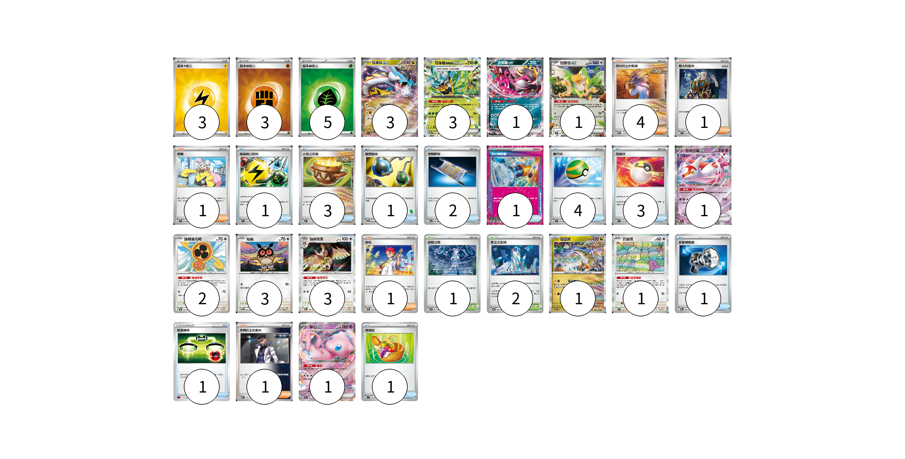 牌組構築方案 以此牌組為基礎新構築牌組 顯示卡面 顯示列表 寶可夢卡(20) 3 3 1 1 1 2 3 3 1 1 1 物品卡(18) 1 3 1 2 1 4 3 1 1 1 支援者卡(8) 4 1 1 1 1 競技場卡(3) 1 2 能量卡(11) 3 3 5 寶可夢卡(20) 卡牌名稱 張數 卡牌名稱 張數 猛雷鼓ex SV5K 053/071 03 厄鬼椪 碧草面具ex SV6 016/101 03 吉雉雞ex SV6a 038/064 01 怒鸚哥ex SVK 006/042 01 拉帝亞斯ex SV7a 019/064 01 旋轉洛托姆 SV8a 131/187 02 咕咕 SV7 076/102 03 貓頭夜鷹 SV8a 128/187 03 猛雷鼓 SV7 075/102 01 百變怪 SV4a 144/190 01 夢幻ex SV2a 151/165 01 物品卡(18) 卡牌名稱 張數 卡牌名稱 張數 超級能量回收 SVK 010/042 01 大地之容器 SVK 012/042 03 能量回收 SVI 049/066 01 夜間擔架 SV6a 056/064 02 頂尖捕捉器 SV5M 062/071 01 巢穴球 SVK 016/042 04 高級球 SVK 018/042 03 反擊捕捉器 SV8a 139/187 01 能量轉移 SDL 011/021 01 野餐籃 SV1V 071/078 01 支援者卡(8) 卡牌名稱 張數 卡牌名稱 張數 奧琳博士的氣魄 SVHK 017/022 04 老大的指令 SVK 036/042 01 奇樹 SVK 031/042 01 赤松 SV8a 163/187 01 弗圖博士的劇本 SV8a 175/187 01 競技場卡(3) 卡牌名稱 張數 卡牌名稱 張數 阻礙之塔 SV8a 181/187 01 零之大空洞 SV8a 182/187 02 能量卡(11) 卡牌名稱 張數 卡牌名稱 張數 基本【雷】能量 SVK LIG 03 基本【鬥】能量 SVK FIG 03 基本【草】能量 SVK GRA 05 以此牌組為基礎新構築牌組 牌組編碼 GZhuiG-mEMKfw-JhnkIW copy 列印牌組單 牌組編碼已複製 分享至SNS