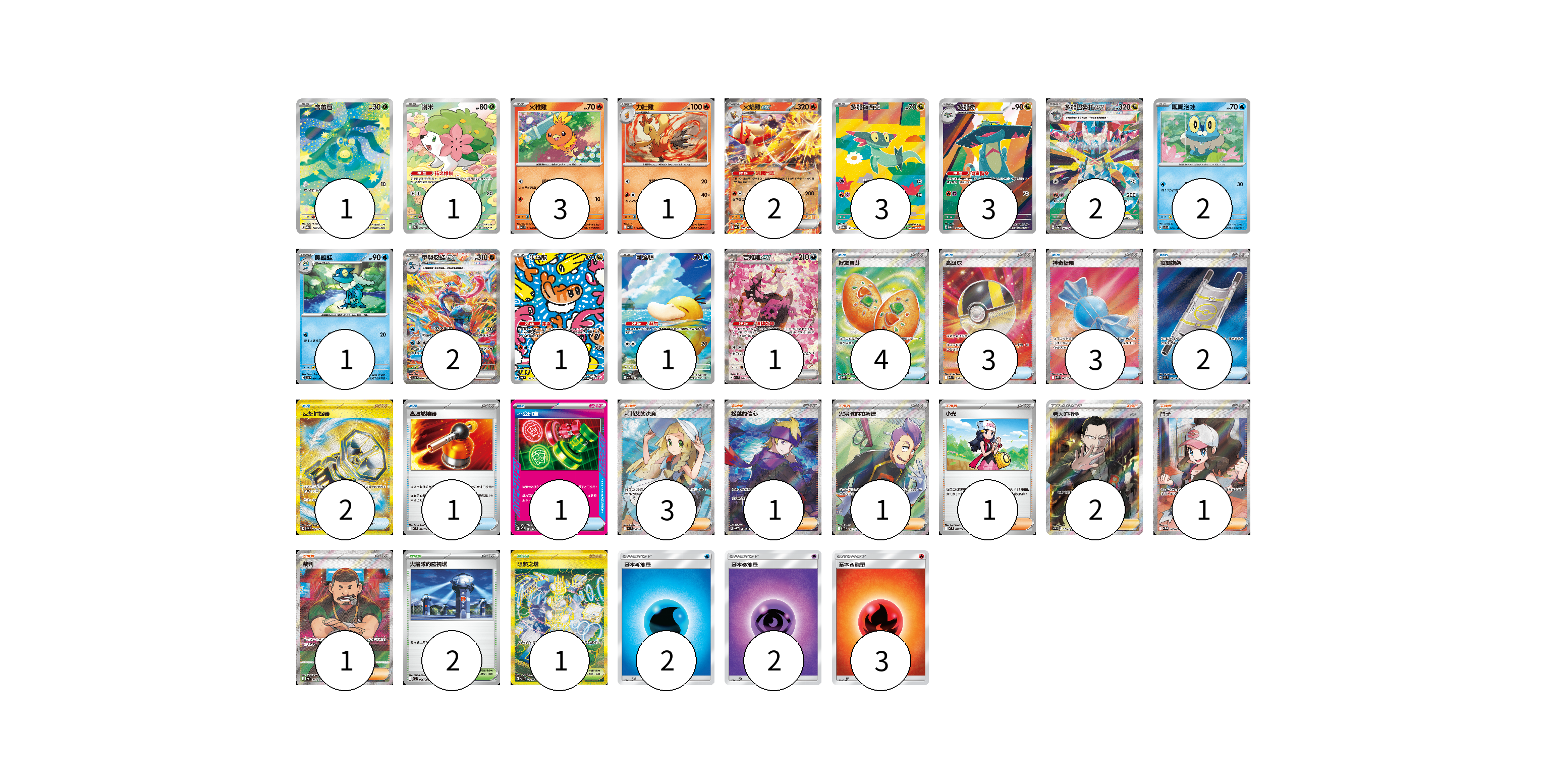 牌組構築方案 以此牌組為基礎新構築牌組 顯示卡面 顯示列表 寶可夢卡(24) 1 1 3 1 2 3 3 2 2 1 2 1 1 1 物品卡(16) 4 3 3 2 2 1 1 支援者卡(10) 3 1 1 1 2 1 1 競技場卡(3) 2 1 能量卡(7) 2 2 3 寶可夢卡(24) 卡牌名稱 張數 卡牌名稱 張數 含羞苞 M2a 196/193 01 謝米 SV9a 066/063 01 火稚雞 SV10 018/098 03 力壯雞 SV10 019/098 01 火焰雞ex SVM 016/175 02 多龍梅西亞 M2a 211/193 03 多龍奇 M2a 212/193 03 多龍巴魯托ex SV8a 221/187 02 呱呱泡蛙 SVD 027/139 02 呱頭蛙 SV5a 024/066 01 甲賀忍蛙ex SV5a 090/066 02 米立龍 SV6 112/101 01 可達鴨 M2a 199/193 01 吉雉雞ex M2a 244/193 01 物品卡(16) 卡牌名稱 張數 卡牌名稱 張數 好友寶芬 M1S 081/063 04 高級球 M2a 216/193 03 神奇糖果 M1S 082/063 03 夜間擔架 M1L 083/063 02 反擊捕捉器 SV4M 094/066 02 高溫燃燒器 M2 074/080 01 不公印章 MC 633/742 01 支援者卡(10) 卡牌名稱 張數 卡牌名稱 張數 莉莉艾的決意 M1L 086/063 03 松葉的信心 SV5K 092/071 01 火箭隊的拉姆達 SV10 122/098 01 小光 M2 077/080 01 老大的指令(坂木) SC1b 170/153 02 鬥子 SV11W 166/086 01 裁判 SV4a 342/190 01 競技場卡(3) 卡牌名稱 張數 卡牌名稱 張數 火箭隊的監視塔 SV10 096/098 02 阻礙之塔 SV10 132/098 01 能量卡(7) 卡牌名稱 張數 卡牌名稱 張數 基本水能量 AS6D WAT 02 基本超能量 AS6D PSY 02 基本火能量 AS6D FIR 03 以此牌組為基礎新構築牌組 牌組編碼 GaMWgl-ZXfixj-witoxt copy 列印牌組單 牌組編碼已複製 分享至SNS