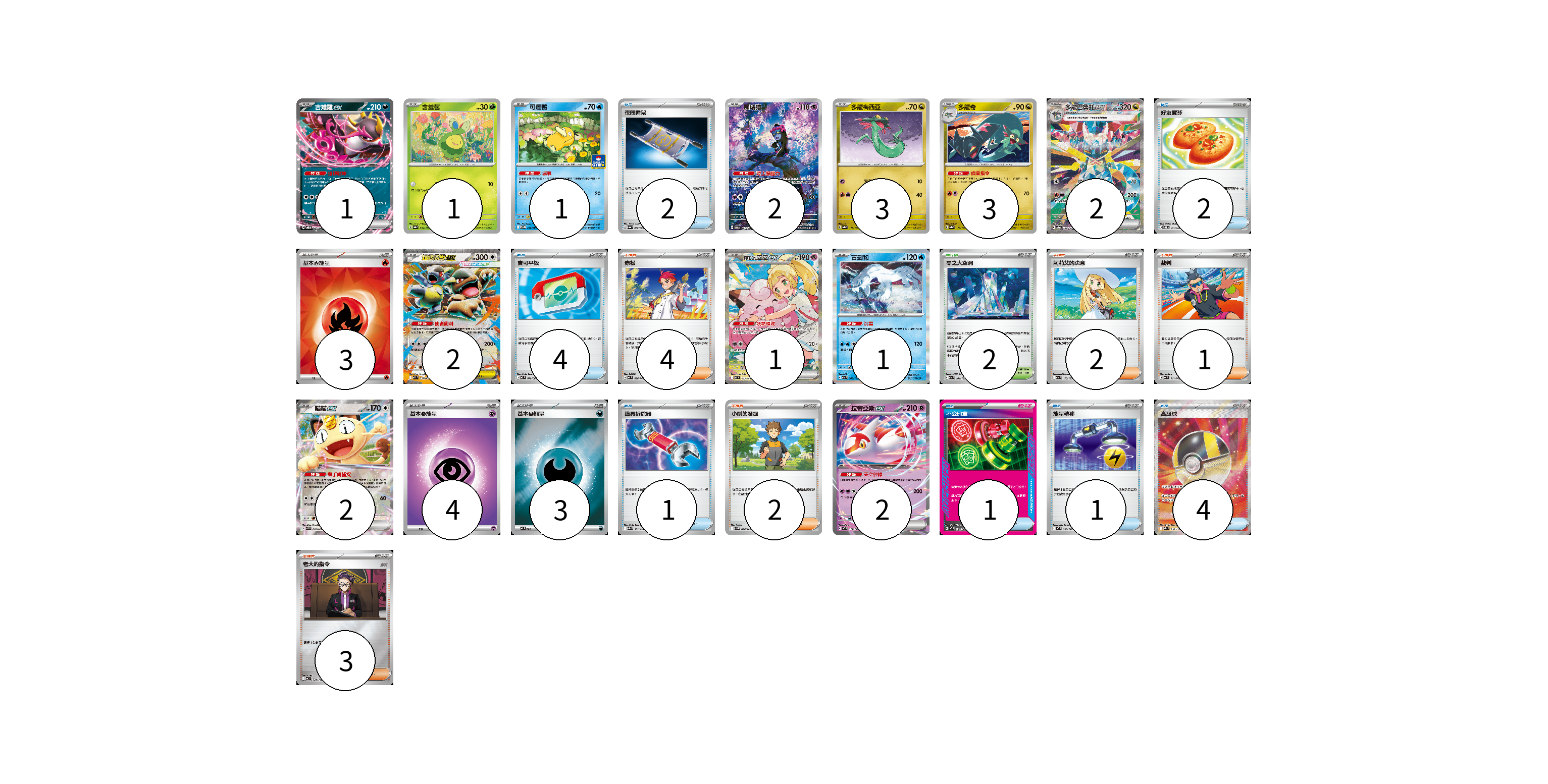 牌組構築方案 以此牌組為基礎新構築牌組 顯示卡面 顯示列表 寶可夢卡(21) 1 1 1 2 3 3 2 2 1 1 2 2 物品卡(15) 2 2 4 1 1 1 4 支援者卡(12) 4 2 1 2 3 競技場卡(2) 2 能量卡(10) 3 4 3 寶可夢卡(21) 卡牌名稱 張數 卡牌名稱 張數 吉雉雞ex SVOD 004/020 01 含羞苞 SV8a 001/187 01 可達鴨 SV-P 220/SV-P 01 願增猿 SV6 107/101 02 多龍梅西亞 SV8a 118/187 03 多龍奇 SV8a 119/187 03 多龍巴魯托ex SV8a 221/187 02 超級袋獸ex M1S 051/063 02 莉莉艾的皮皮ex MC 765/742 01 古劍豹 M2a 043/193 01 喵喵ex M3 061/080 02 拉帝亞斯ex MC 312/742 02 物品卡(15) 卡牌名稱 張數 卡牌名稱 張數 夜間擔架 SV6a 056/064 02 好友寶芬 SVOD 011/020 02 寶可平板 M3 070/080 04 道具拆除器 M2a 151/193 01 不公印章 MC 633/742 01 能量轉移 MC 638/742 01 高級球 M2a 216/193 04 支援者卡(12) 卡牌名稱 張數 卡牌名稱 張數 赤松 MC 696/742 04 莉莉艾的決意 M2a 175/193 02 裁判 MC 711/742 01 小剛的發掘 SV9 096/100 02 老大的指令 MC 724/742 03 競技場卡(2) 卡牌名稱 張數 卡牌名稱 張數 零之大空洞 M2a 184/193 02 能量卡(10) 卡牌名稱 張數 卡牌名稱 張數 基本【火】能量 SVM FIR 03 基本【超】能量 MC PSY 04 基本【惡】能量 MC DAR 03 以此牌組為基礎新構築牌組 牌組編碼 GcxknY-sbhpDn-kYtMXE copy 列印牌組單 牌組編碼已複製 分享至SNS