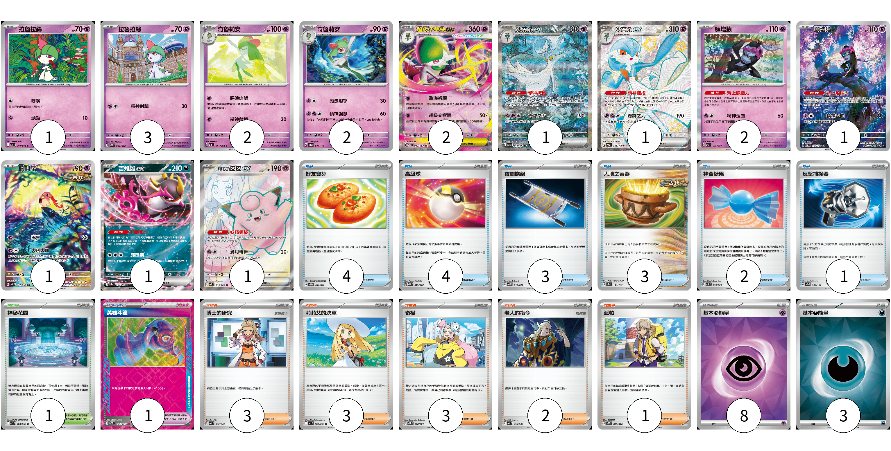 牌組構築方案 以此牌組為基礎新構築牌組 顯示卡面 顯示列表 寶可夢卡(18) 1 3 2 2 2 1 1 2 1 1 1 1 寶可夢道具(1) 1 物品卡(17) 4 4 3 3 2 1 支援者卡(12) 3 3 3 2 1 競技場卡(1) 1 能量卡(11) 8 3 寶可夢卡(18) 卡牌名稱 張數 卡牌名稱 張數 拉魯拉絲 M1S 040/063 01 拉魯拉絲 SVTS 002/022 03 奇魯莉安 M1S 041/063 02 奇魯莉安 SV4a 081/190 02 超級沙奈朵ex M1S 042/063 02 沙奈朵ex SV4a 348/190 01 沙奈朵ex SV4a 328/190 01 願增猿 SV8a 075/187 02 願增猿 SV6 107/101 01 吼叫尾 SV4K 071/066 01 吉雉雞ex SV8a 104/187 01 莉莉艾的皮皮ex SV9 115/100 01 寶可夢道具(1) 卡牌名稱 張數 卡牌名稱 張數 英雄斗篷 SV5M 064/071 01 物品卡(17) 卡牌名稱 張數 卡牌名稱 張數 好友寶芬 SVTG 011/019 04 高級球 SVQL 015/022 04 夜間擔架 SVOM 016/021 03 大地之容器 SV8a 143/187 03 神奇糖果 SVOD 013/020 02 反擊捕捉器 SV8a 139/187 01 支援者卡(12) 卡牌名稱 張數 卡牌名稱 張數 博士的研究 SVK 032/042 03 莉莉艾的決意 M1L 062/063 03 奇樹 SVOM 018/021 03 老大的指令 SVK 036/042 02 派帕 SVOD 018/020 01 競技場卡(1) 卡牌名稱 張數 卡牌名稱 張數 神秘花園 M1S 063/063 01 能量卡(11) 卡牌名稱 張數 卡牌名稱 張數 基本【超】能量 SVOD PSY 08 基本【惡】能量 SVOM DAR 03 以此牌組為基礎新構築牌組 牌組編碼 GdXAFP-rDnANt-jrkVfz copy 列印牌組單 牌組編碼已複製 分享至SNS
