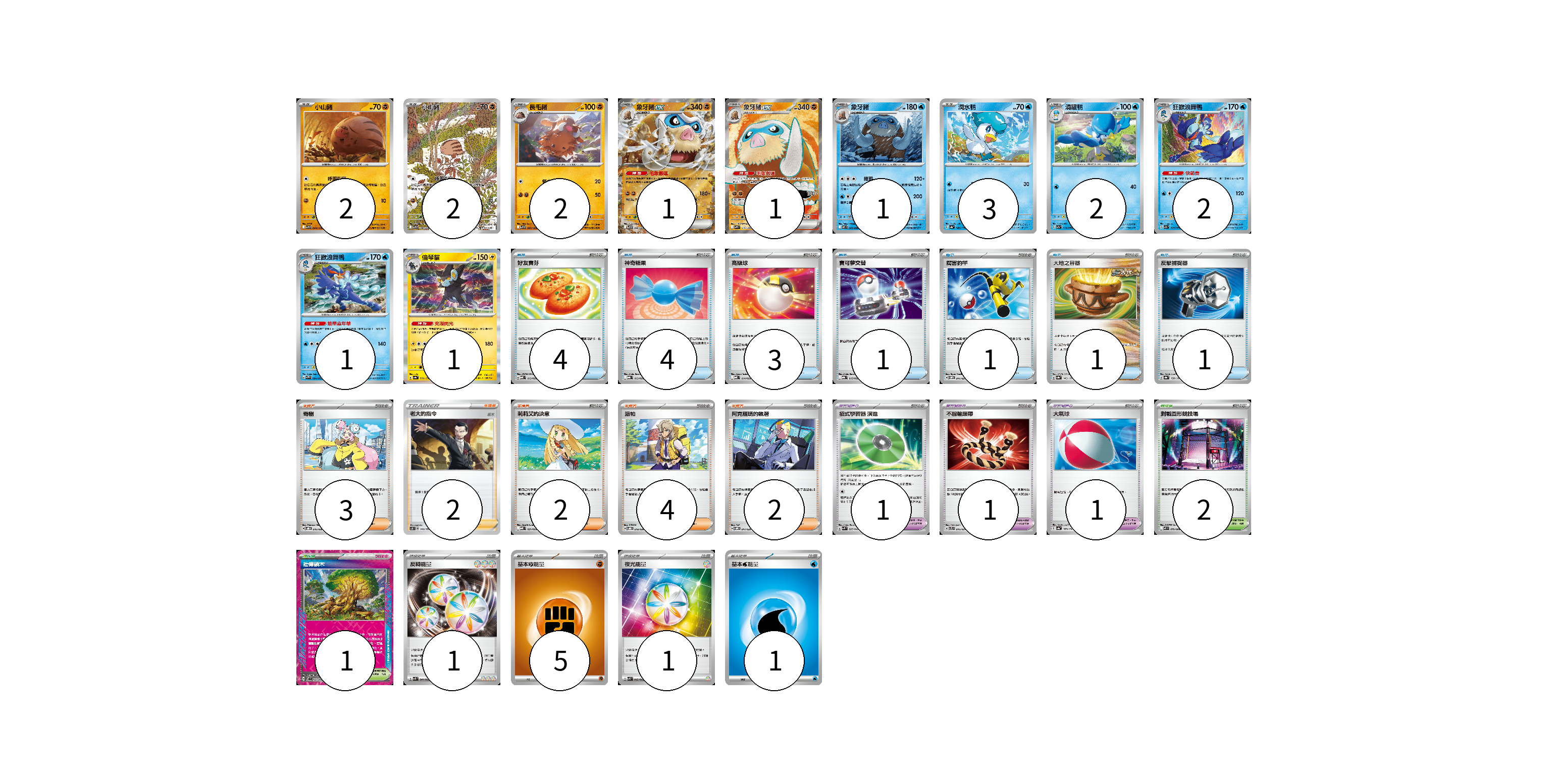 牌組構築方案 以此牌組為基礎新構築牌組 顯示卡面 顯示列表 寶可夢卡(18) 2 2 2 1 1 1 3 2 2 1 1 寶可夢道具(3) 1 1 1 物品卡(15) 4 4 3 1 1 1 1 支援者卡(13) 3 2 2 4 2 競技場卡(3) 2 1 能量卡(8) 1 5 1 1 寶可夢卡(18) 卡牌名稱 張數 卡牌名稱 張數 小山豬 SV9 044/100 02 小山豬 SV9 106/100 02 長毛豬 SV9 045/100 02 象牙豬ex SV9 046/100 01 象牙豬ex SV9 116/100 01 象牙豬 M2 025/080 01 潤水鴨 SV4a 041/190 03 湧躍鴨 SV7a 014/064 02 狂歡浪舞鴨 SV7a 015/064 02 狂歡浪舞鴨 SVAW 004/023 01 倫琴貓 SV4a 061/190 01 寶可夢道具(3) 卡牌名稱 張數 卡牌名稱 張數 招式學習器 演進 SVK 025/042 01 不服輸頭帶 SVTL 016/021 01 大氣球 SV4a 165/190 01 物品卡(15) 卡牌名稱 張數 卡牌名稱 張數 好友寶芬 MBD 013/022 04 神奇糖果 MBG 013/022 04 高級球 MBD 014/022 03 寶可夢交替 MBG 015/022 01 厲害釣竿 SVOM 011/021 01 大地之容器 SV8a 143/187 01 反擊捕捉器 SV8a 139/187 01 支援者卡(13) 卡牌名稱 張數 卡牌名稱 張數 奇樹 SVOD 016/020 03 老大的指令(坂木) SCB 140/156 02 莉莉艾的決意 MBD 021/022 02 派帕 SVOD 018/020 04 阿克羅瑪的執著 SVOM 017/021 02 競技場卡(3) 卡牌名稱 張數 卡牌名稱 張數 對戰圓形競技場 M2 079/080 02 壯偉碩木 SV7 101/102 01 能量卡(8) 卡牌名稱 張數 卡牌名稱 張數 反轉能量 SVK 041/042 01 基本鬥能量 sv-p FIG 05 夜光能量 SVK 042/042 01 基本水能量 sv-p WAT 01 以此牌組為基礎新構築牌組 牌組編碼 GeElEI-mMuLYn-oyacuu copy 列印牌組單 牌組編碼已複製 分享至SNS