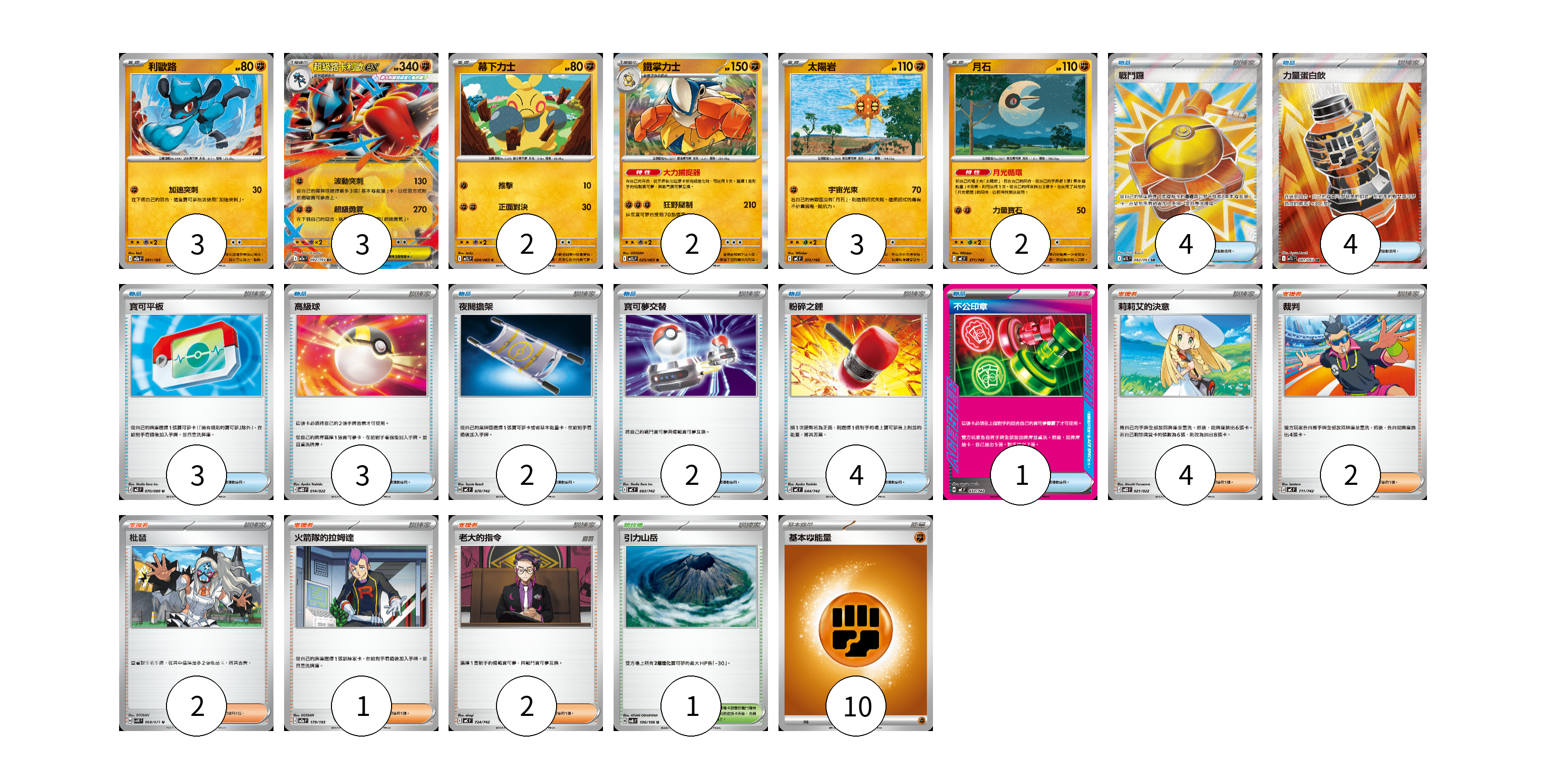 牌組構築方案 以此牌組為基礎新構築牌組 顯示卡面 顯示列表 寶可夢卡(15) 3 3 2 2 3 2 物品卡(23) 4 4 3 3 2 2 4 1 支援者卡(11) 4 2 2 1 2 競技場卡(1) 1 能量卡(10) 10 寶可夢卡(15) 卡牌名稱 張數 卡牌名稱 張數 利歐路 M2a 091/193 03 超級路卡利歐ex M2a 092/193 03 幕下力士 M1L 024/063 02 鐵掌力士 M1L 025/063 02 太陽岩 MC 372/742 03 月石 MC 371/742 02 物品卡(23) 卡牌名稱 張數 卡牌名稱 張數 戰鬥鑼 M1L 082/063 04 力量蛋白飲 M1L 081/063 04 寶可平板 M3 070/080 03 高級球 MBD 014/022 03 夜間擔架 MC 670/742 02 寶可夢交替 MC 663/742 02 粉碎之錘 MC 644/742 04 不公印章 MC 633/742 01 支援者卡(11) 卡牌名稱 張數 卡牌名稱 張數 莉莉艾的決意 MBD 021/022 04 裁判 MC 711/742 02 枇琶 SV5K 068/071 02 火箭隊的拉姆達 M2a 179/193 01 老大的指令 MC 724/742 02 競技場卡(1) 卡牌名稱 張數 卡牌名稱 張數 引力山岳 SV8 106/106 01 能量卡(10) 卡牌名稱 張數 卡牌名稱 張數 基本【鬥】能量 MC FIG 10 以此牌組為基礎新構築牌組 牌組編碼 GfGPfs-WOnDAO-idoJaH copy 列印牌組單 牌組編碼已複製 分享至SNS