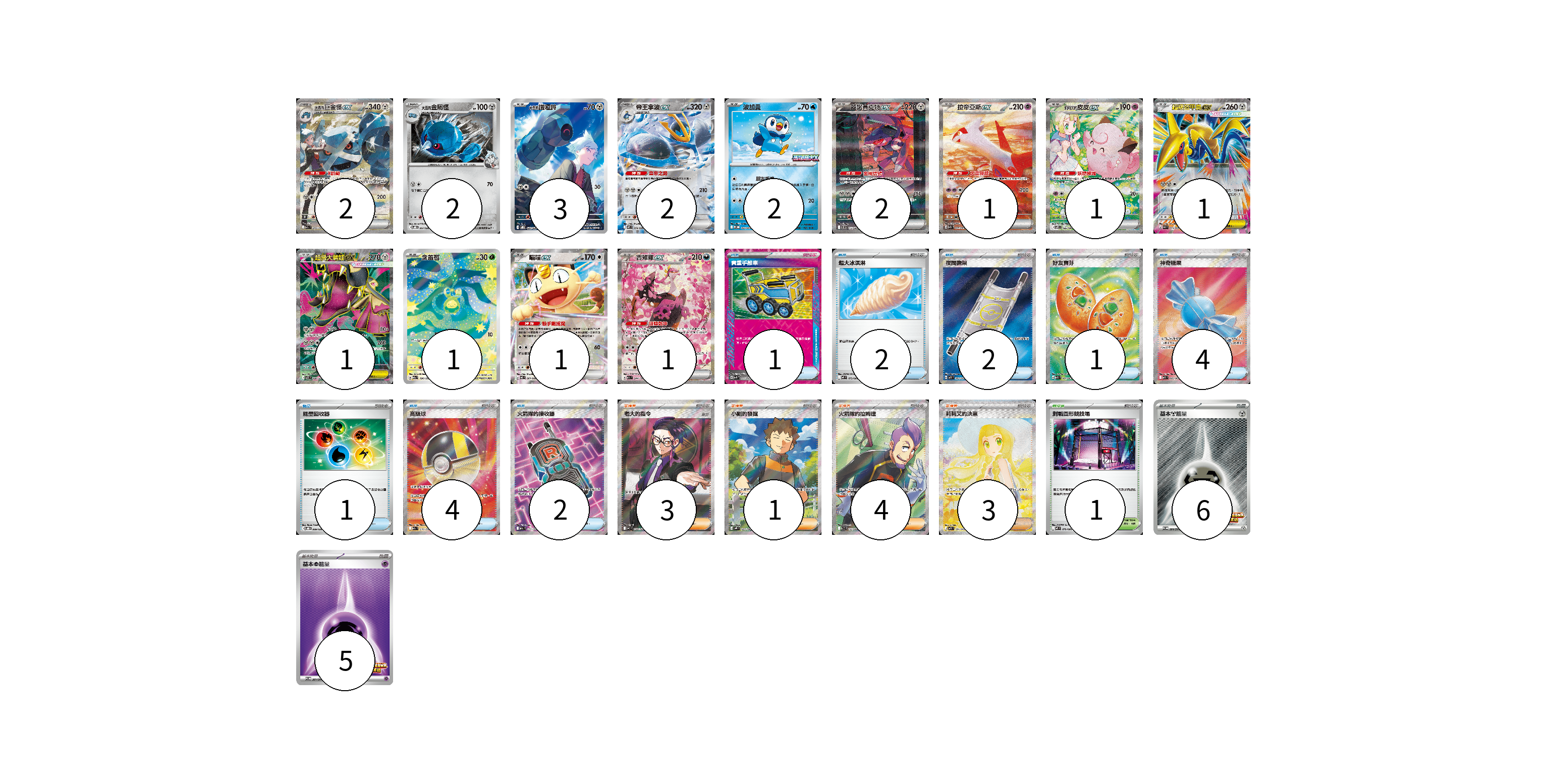 牌組構築方案 以此牌組為基礎新構築牌組 顯示卡面 顯示列表 寶可夢卡(20) 2 2 3 2 2 2 1 1 1 1 1 1 1 物品卡(17) 1 2 2 1 4 1 4 2 支援者卡(11) 3 1 4 3 競技場卡(1) 1 能量卡(11) 6 5 寶可夢卡(20) 卡牌名稱 張數 卡牌名稱 張數 <大吾的>巨金怪ex M2a 245/193 02 <大吾的>金屬怪 SVOD 007/020 02 <大吾的>鐵啞鈴 SVOD 021/020 03 帝王拿波ex M2 058/080 02 波加曼 M-P 023/M-P 02 蓋諾賽克特ex SV11B 172/086 02 拉帝亞斯ex SV7a 087/064 01 莉莉艾的皮皮ex SV9 126/100 01 超級盔甲鳥ex M3 054/080 01 超級大嘴娃ex M1L 080/063 01 含羞苞 M2a 196/193 01 喵喵ex M3 061/080 01 吉雉雞ex M2a 244/193 01 物品卡(17) 卡牌名稱 張數 卡牌名稱 張數 貴重手推車 SVK 020/042 01 超大冰淇淋 M2 073/080 02 夜間擔架 M1L 083/063 02 好友寶芬 M1S 081/063 01 神奇糖果 M1S 082/063 04 能量回收器 SVOD 009/020 01 高級球 M2a 216/193 04 火箭隊的接收器 M2a 217/193 02 支援者卡(11) 卡牌名稱 張數 卡牌名稱 張數 老大的指令(烏羽) MC 760/742 03 小剛的發掘 SV9 123/100 01 火箭隊的拉姆達 SV10 122/098 04 莉莉艾的決意 M1L 091/063 03 競技場卡(1) 卡牌名稱 張數 卡牌名稱 張數 對戰圓形競技場 M2 079/080 01 能量卡(11) 卡牌名稱 張數 卡牌名稱 張數 基本【鋼】能量 SV-P 264/SV-P 06 基本【超】能量 SV-P 261/SV-P 05 以此牌組為基礎新構築牌組 牌組編碼 GfSDxf-AWRsTm-qicVJj copy 列印牌組單 牌組編碼已複製 分享至SNS