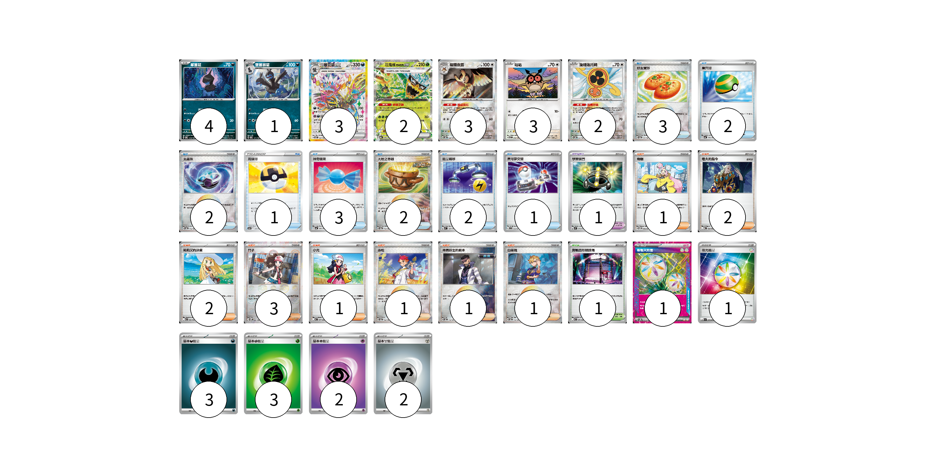 牌組構築方案 以此牌組為基礎新構築牌組 顯示卡面 顯示列表 寶可夢卡(18) 4 1 3 2 3 3 2 寶可夢道具(1) 1 物品卡(16) 3 2 2 1 3 2 2 1 支援者卡(12) 1 2 2 3 1 1 1 1 競技場卡(1) 1 能量卡(12) 1 1 3 3 2 2 寶可夢卡(18) 卡牌名稱 張數 卡牌名稱 張數 單首龍 SV8 070/106 04 雙首暴龍 SV8 071/106 01 三首惡龍ex SV8 124/106 03 厄鬼椪 碧草面具ex SV8a 020/187 02 貓頭夜鷹 SV8a 128/187 03 咕咕 SV7 076/102 03 旋轉洛托姆 SV8a 131/187 02 寶可夢道具(1) 卡牌名稱 張數 卡牌名稱 張數 學習裝置 SV1S 072/078 01 物品卡(16) 卡牌名稱 張數 卡牌名稱 張數 好友寶芬 SV8a 147/187 03 巢穴球 SV4a 159/190 02 太晶珠 SV8a 145/187 02 高級球 S12a 138/172 01 神奇糖果 SV4a 163/190 03 大地之容器 SV8a 143/187 02 能量轉移 SVM 127/175 02 寶可夢交替 SVC 016/021 01 支援者卡(12) 卡牌名稱 張數 卡牌名稱 張數 奇樹 SVOM 018/021 01 老大的指令 MBD 020/022 02 莉莉艾的決意 M1L 062/063 02 鬥子 SV11W 085/086 03 小光 M2 077/080 01 赤松 SV8a 163/187 01 弗圖博士的劇本 SV8a 175/187 01 白蕾雅 SV8a 176/187 01 競技場卡(1) 卡牌名稱 張數 卡牌名稱 張數 對戰圓形競技場 M2 079/080 01 能量卡(12) 卡牌名稱 張數 卡牌名稱 張數 新衝天能量 SV5K 071/071 01 夜光能量 SV1a 073/073 01 基本惡能量 sv-p DAR 03 基本草能量 sv-p GRA 03 基本超能量 sv-p PSY 02 基本鋼能量 sv-p MET 02 以此牌組為基礎新構築牌組 牌組編碼 GfsRpp-EssTMW-YacePL copy 列印牌組單 牌組編碼已複製 分享至SNS