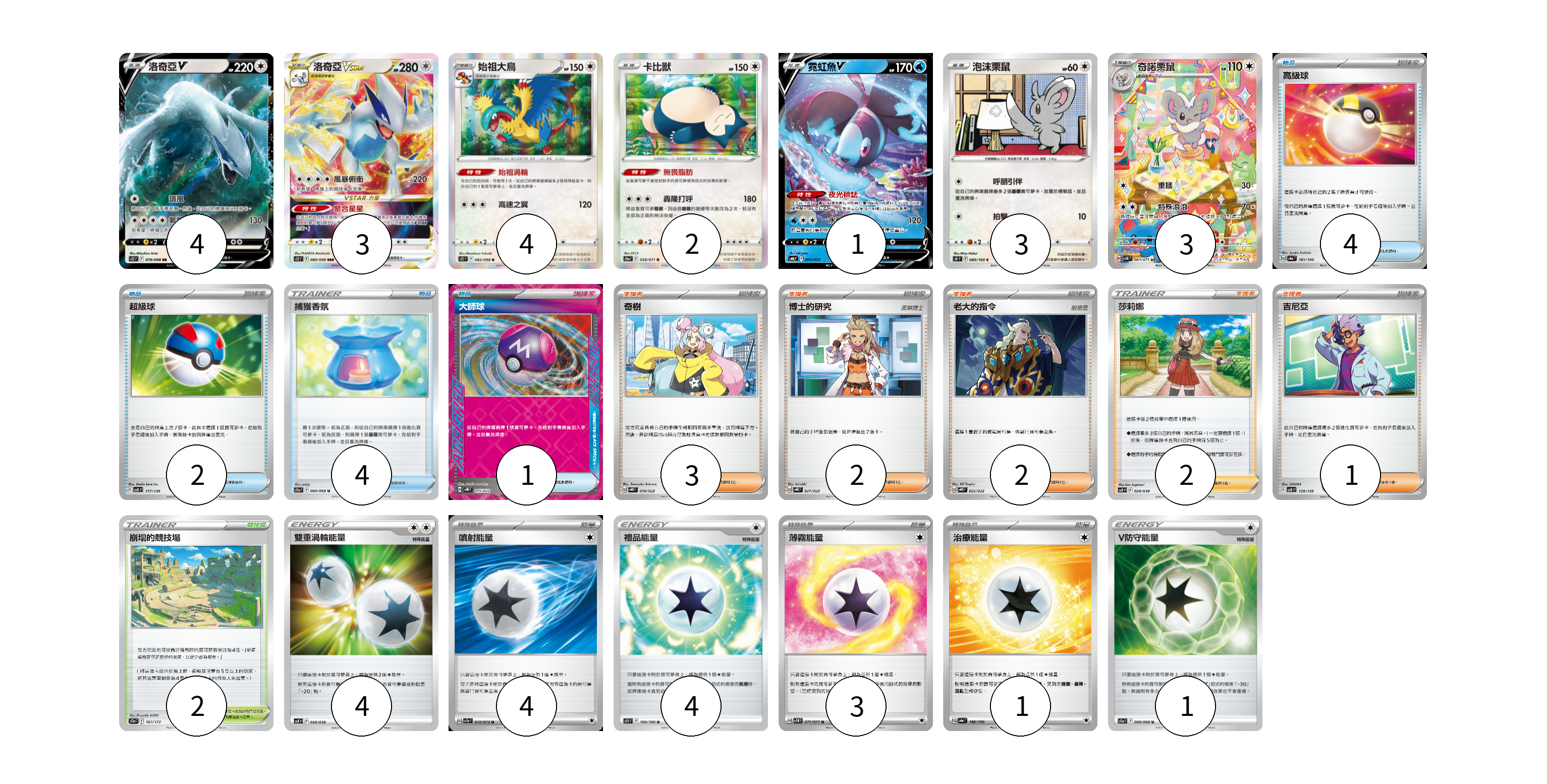 牌組構築方案 以此牌組為基礎新構築牌組 顯示卡面 顯示列表 寶可夢卡(20) 4 3 4 2 1 3 3 物品卡(11) 4 2 4 1 支援者卡(10) 3 2 2 2 1 競技場卡(2) 2 能量卡(17) 4 4 4 3 1 1 寶可夢卡(20) 卡牌名稱 張數 卡牌名稱 張數 洛奇亞V S12 079/098 04 洛奇亞VSTAR S12 080/098 03 始祖大鳥 S12 083/098 04 卡比獸 S10a 058/071 02 霓虹魚V SVHK 004/022 01 泡沫栗鼠 S9 085/100 03 奇諾栗鼠 SV5K 083/071 03 物品卡(11) 卡牌名稱 張數 卡牌名稱 張數 高級球 SV4a 161/190 04 超級球 SVD 117/139 02 捕獲香氛 S11a 060/068 04 大師球 SVHK 015/022 01 支援者卡(10) 卡牌名稱 張數 卡牌名稱 張數 奇樹 SVHK 019/022 03 博士的研究 SVHK 021/022 02 老大的指令 SVHK 022/022 02 莎莉娜 SVF 028/038 02 吉尼亞 SVD 129/139 01 競技場卡(2) 卡牌名稱 張數 卡牌名稱 張數 崩塌的競技場 S12a 167/172 02 能量卡(17) 卡牌名稱 張數 卡牌名稱 張數 雙重渦輪能量 SVF 038/038 04 噴射能量 SV1a 072/073 04 禮品能量 S11 100/100 04 薄霧能量 SV5M 071/071 03 治療能量 SV4a 188/190 01 V防守能量 S11a 068/068 01 以此牌組為基礎新構築牌組 牌組編碼 GhCJUO-PbgpfR-dXIGiu copy 列印牌組單 牌組編碼已複製 分享至SNS