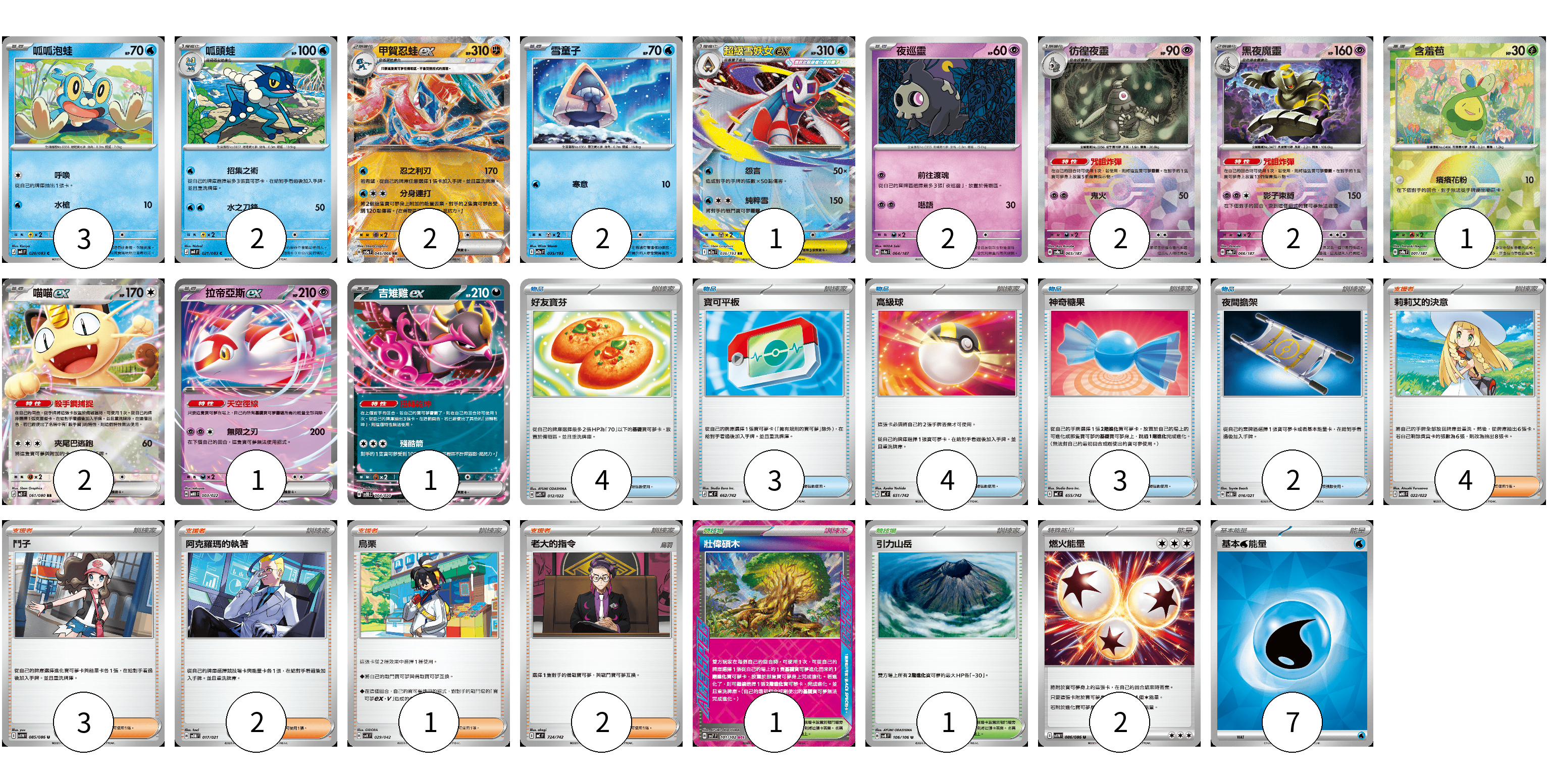 牌組構築方案 以此牌組為基礎新構築牌組 顯示卡面 顯示列表 寶可夢卡(21) 3 2 2 2 1 2 2 2 1 2 1 1 物品卡(16) 4 3 4 3 2 支援者卡(12) 4 3 2 1 2 競技場卡(2) 1 1 能量卡(9) 2 7 寶可夢卡(21) 卡牌名稱 張數 卡牌名稱 張數 呱呱泡蛙 M4 020/083 03 呱頭蛙 M4 021/083 02 甲賀忍蛙ex SV5a 045/066 02 雪童子 M2a 035/193 02 超級雪妖女ex M2a 036/193 01 夜巡靈 SV8a 064/187 02 彷徨夜靈 SV8a 065/187 02 黑夜魔靈 SV8a 066/187 02 含羞苞 SV8a 001/187 01 喵喵ex M3 061/080 02 拉帝亞斯ex MBD 003/022 01 吉雉雞ex SVOD 004/020 01 物品卡(16) 卡牌名稱 張數 卡牌名稱 張數 好友寶芬 SVTS 012/022 04 寶可平板 MC 662/742 03 高級球 MC 651/742 04 神奇糖果 MC 655/742 03 夜間擔架 SVOM 016/021 02 支援者卡(12) 卡牌名稱 張數 卡牌名稱 張數 莉莉艾的決意 MBG 022/022 04 鬥子 SV11W 085/086 03 阿克羅瑪的執著 SVOM 017/021 02 烏栗 SVK 029/042 01 老大的指令 MC 724/742 02 競技場卡(2) 卡牌名稱 張數 卡牌名稱 張數 壯偉碩木 SV7 101/102 01 引力山岳 SV8 106/106 01 能量卡(9) 卡牌名稱 張數 卡牌名稱 張數 燃火能量 SV11W 086/086 02 基本【水】能量 SVM WAT 07 以此牌組為基礎新構築牌組 牌組編碼 GiqsWh-wrtaxR-YmJUrh copy 列印牌組單 牌組編碼已複製 分享至SNS