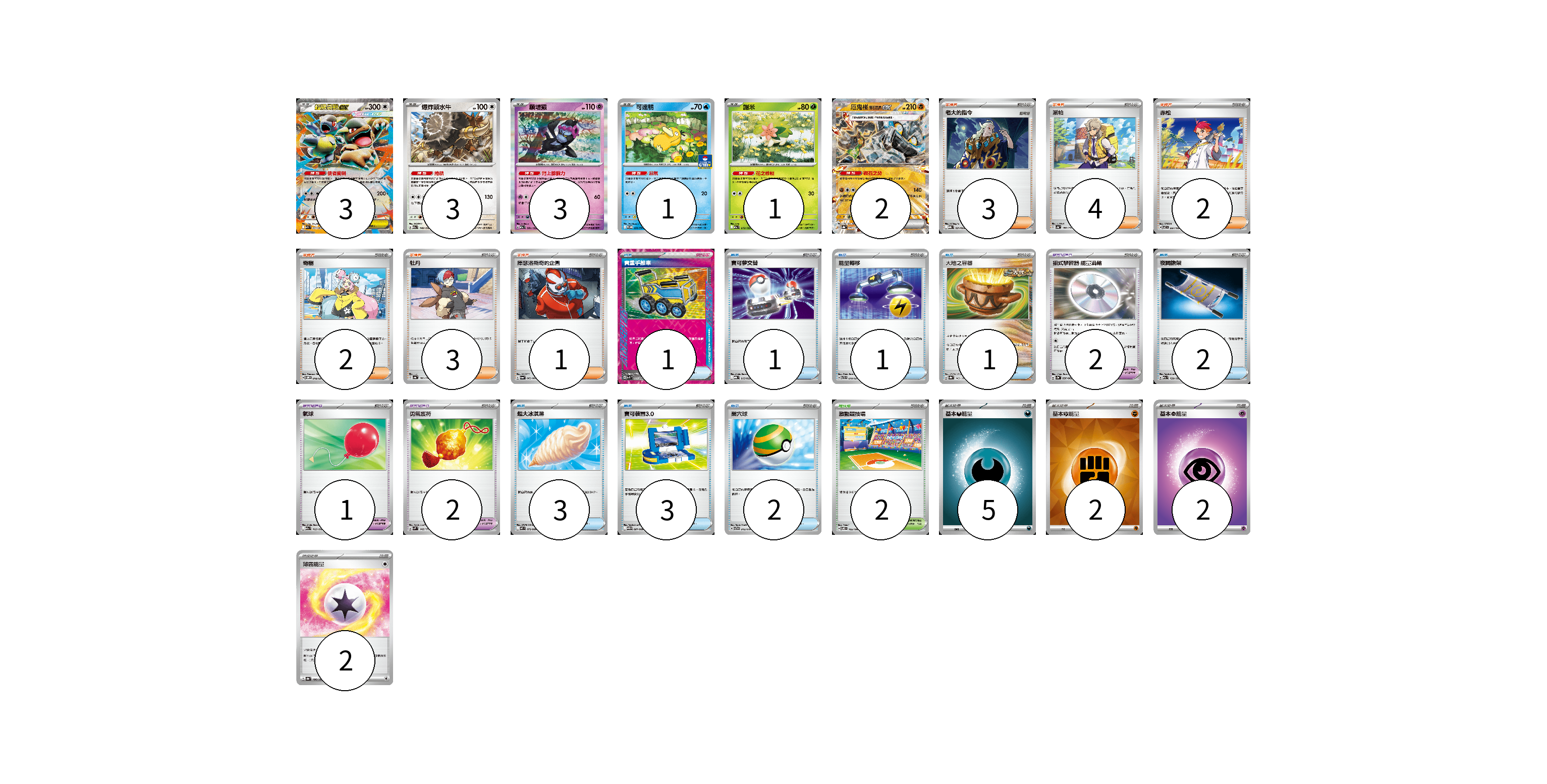 牌組構築方案 以此牌組為基礎新構築牌組 顯示卡面 顯示列表 寶可夢卡(13) 3 3 3 1 1 2 寶可夢道具(5) 2 1 2 物品卡(14) 1 1 1 1 2 3 3 2 支援者卡(15) 3 4 2 2 3 1 競技場卡(2) 2 能量卡(11) 5 2 2 2 寶可夢卡(13) 卡牌名稱 張數 卡牌名稱 張數 超級袋獸ex M1S 051/063 03 爆炸頭水牛 M2a 140/193 03 願增猿 M2a 081/193 03 可達鴨 SV-P 220/SV-P 01 謝米 M2a 012/193 01 厄鬼椪 礎石面具ex SV8a 091/187 02 寶可夢道具(5) 卡牌名稱 張數 卡牌名稱 張數 招式學習器 能量渦輪 SV3a 056/062 02 氣球 M2a 165/193 01 勇氣護符 SVM 142/175 02 物品卡(14) 卡牌名稱 張數 卡牌名稱 張數 貴重手推車 SVK 020/042 01 寶可夢交替 MBG 015/022 01 能量轉移 SVTR 010/021 01 大地之容器 SV8a 143/187 01 夜間擔架 M2a 159/193 02 超大冰淇淋 M2 073/080 03 寶可裝置3.0 SV11B 081/086 03 巢穴球 SVTG 012/019 02 支援者卡(15) 卡牌名稱 張數 卡牌名稱 張數 老大的指令 MBG 021/022 03 派帕 SV4a 180/190 04 赤松 SV7 097/102 02 奇樹 SVOM 018/021 02 牡丹 SV4a 182/190 03 庫瑟洛斯奇的企圖 SV6a 062/064 01 競技場卡(2) 卡牌名稱 張數 卡牌名稱 張數 激動競技場 SV8 105/106 02 能量卡(11) 卡牌名稱 張數 卡牌名稱 張數 基本【惡】能量 MBG DAR 05 基本【鬥】能量 SVM FIG 02 基本【超】能量 M-P PSY 02 薄霧能量 SV8a 186/187 02 以此牌組為基礎新構築牌組 牌組編碼 GkXGkB-CRrMxW-qahvsQ copy 列印牌組單 牌組編碼已複製 分享至SNS