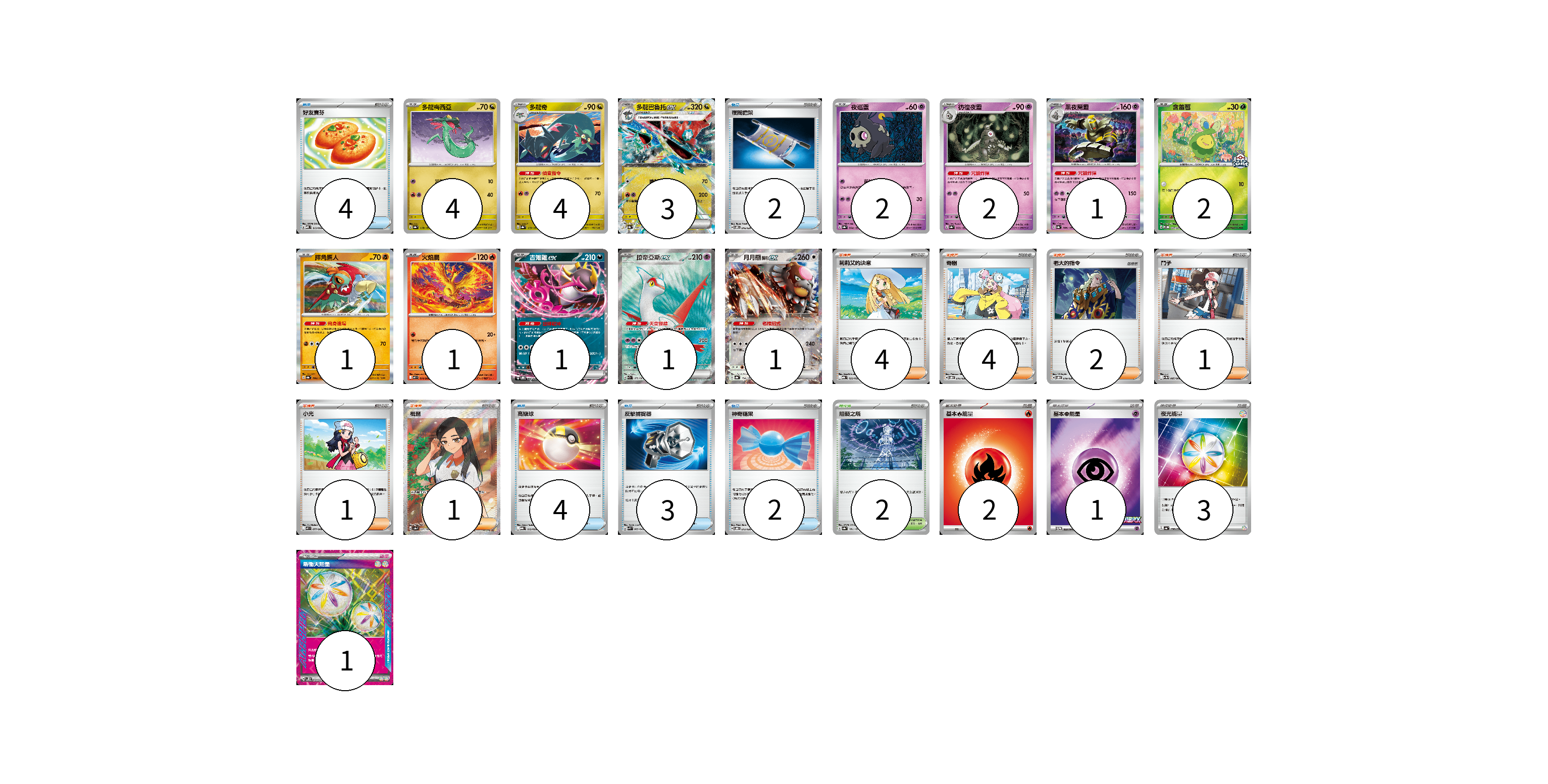 牌組構築方案 以此牌組為基礎新構築牌組 顯示卡面 顯示列表 寶可夢卡(23) 4 4 3 2 2 1 2 1 1 1 1 1 物品卡(15) 4 2 4 3 2 支援者卡(13) 4 4 2 1 1 1 競技場卡(2) 2 能量卡(7) 2 1 3 1 寶可夢卡(23) 卡牌名稱 張數 卡牌名稱 張數 多龍梅西亞 SV8a 118/187 04 多龍奇 SV8a 119/187 04 多龍巴魯托ex SV8a 120/187 03 夜巡靈 SV8a 064/187 02 彷徨夜靈 SV8a 065/187 02 黑夜魔靈 SV8a 066/187 01 含羞苞 M-P 037/M-P 02 摔角鷹人 SV8a 084/187 01 火焰鳥 M2 014/080 01 吉雉雞ex SVOD 004/020 01 拉帝亞斯ex SV7a 078/064 01 月月熊 赫月ex SV8a 134/187 01 物品卡(15) 卡牌名稱 張數 卡牌名稱 張數 好友寶芬 MBD 013/022 04 夜間擔架 SVOM 016/021 02 高級球 MBG 012/022 04 反擊捕捉器 SVK 009/042 03 神奇糖果 SVOD 013/020 02 支援者卡(13) 卡牌名稱 張數 卡牌名稱 張數 莉莉艾的決意 MBG 022/022 04 奇樹 SVOD 016/020 04 老大的指令 SVOD 019/020 02 鬥子 SV11W 085/086 01 小光 M2 077/080 01 枇琶 SV8a 197/187 01 競技場卡(2) 卡牌名稱 張數 卡牌名稱 張數 阻礙之塔 SV8a 181/187 02 能量卡(7) 卡牌名稱 張數 卡牌名稱 張數 基本【火】能量 M-P FIR 02 基本【超】能量 M-P 033/M-P 01 夜光能量 SV4a 190/190 03 新衝天能量 SV5K 071/071 01 以此牌組為基礎新構築牌組 牌組編碼 GkoZtj-eAOuoO-VCXEFV copy 列印牌組單 牌組編碼已複製 分享至SNS