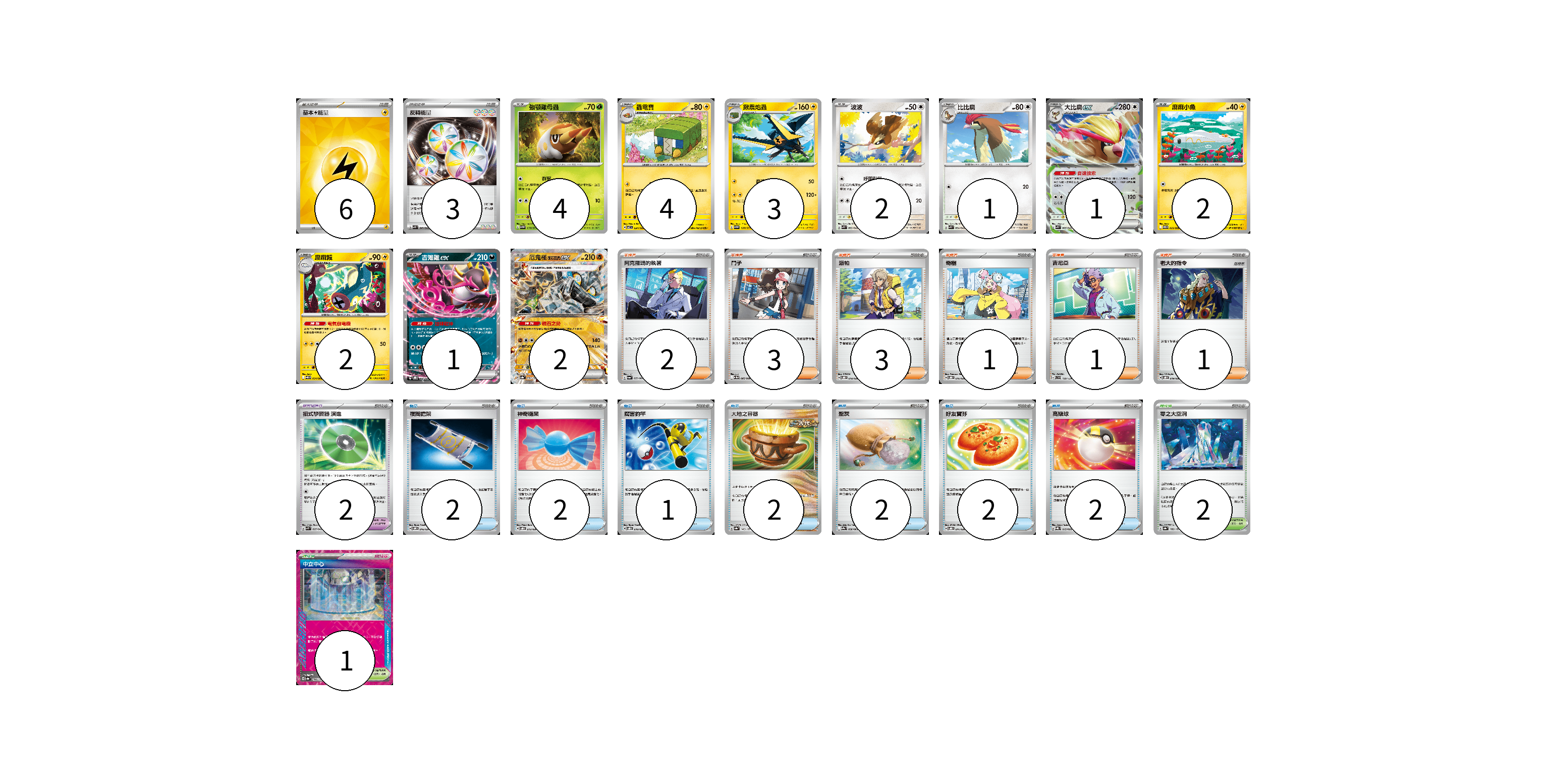 牌組構築方案 以此牌組為基礎新構築牌組 顯示卡面 顯示列表 寶可夢卡(22) 4 4 3 2 1 1 2 2 1 2 寶可夢道具(2) 2 物品卡(13) 2 2 1 2 2 2 2 支援者卡(11) 2 3 3 1 1 1 競技場卡(3) 2 1 能量卡(9) 6 3 寶可夢卡(22) 卡牌名稱 張數 卡牌名稱 張數 強顎雞母蟲 SV5M 010/071 04 蟲電寶 SV7 034/102 04 鍬農炮蟲 SV5M 028/071 03 波波 SVK 003/042 02 比比鳥 SVK 004/042 01 大比鳥ex SVK 005/042 01 麻麻小魚 SV11B 033/086 02 麻麻鰻 SV11B 034/086 02 吉雉雞ex SVOD 004/020 01 厄鬼椪 礎石面具ex SV8a 091/187 02 寶可夢道具(2) 卡牌名稱 張數 卡牌名稱 張數 招式學習器 演進 SVK 025/042 02 物品卡(13) 卡牌名稱 張數 卡牌名稱 張數 夜間擔架 SVOM 016/021 02 神奇糖果 SVOD 013/020 02 厲害釣竿 SVOD 010/020 01 大地之容器 SV8a 143/187 02 聖灰 SV9a 056/063 02 好友寶芬 SVOD 011/020 02 高級球 SVQL 015/022 02 支援者卡(11) 卡牌名稱 張數 卡牌名稱 張數 阿克羅瑪的執著 SV6a 059/064 02 鬥子 SV11W 085/086 03 派帕 SVOD 018/020 03 奇樹 SVOD 016/020 01 吉尼亞 SVD 129/139 01 老大的指令 SVOD 019/020 01 競技場卡(3) 卡牌名稱 張數 卡牌名稱 張數 零之大空洞 SV8a 182/187 02 中立中心 SV8a 184/187 01 能量卡(9) 卡牌名稱 張數 卡牌名稱 張數 基本【雷】能量 SVM LIG 06 反轉能量 SVK 041/042 03 以此牌組為基礎新構築牌組 牌組編碼 GkouyT-jzlDsy-MapxVY copy 列印牌組單 牌組編碼已複製 分享至SNS
