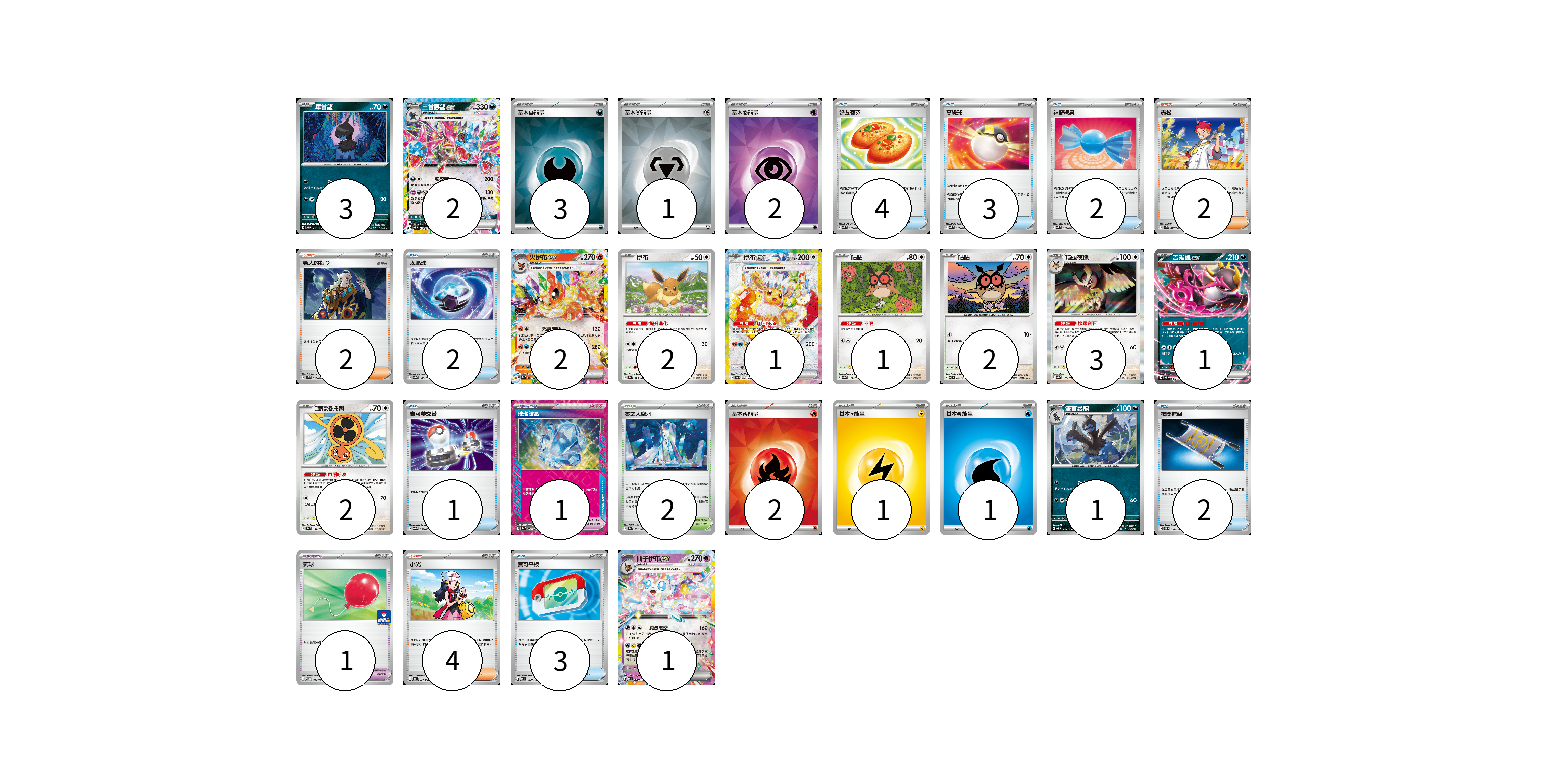 牌組構築方案 以此牌組為基礎新構築牌組 顯示卡面 顯示列表 寶可夢卡(21) 3 2 2 2 1 1 2 3 1 2 1 1 寶可夢道具(2) 1 1 物品卡(17) 4 3 2 2 1 2 3 支援者卡(8) 2 2 4 競技場卡(2) 2 能量卡(10) 3 1 2 2 1 1 寶可夢卡(21) 卡牌名稱 張數 卡牌名稱 張數 單首龍 SV8 070/106 03 三首惡龍ex SV8 072/106 02 火伊布ex SV8a 022/187 02 伊布 SV8a 125/187 02 伊布ex SV8a 224/187 01 咕咕 SV8a 127/187 01 咕咕 SV7 076/102 02 貓頭夜鷹 SV8a 128/187 03 吉雉雞ex SVOD 004/020 01 旋轉洛托姆 SV8a 131/187 02 雙首暴龍 SV8 071/106 01 仙子伊布ex MC 299/742 01 寶可夢道具(2) 卡牌名稱 張數 卡牌名稱 張數 璀璨結晶 SV8a 152/187 01 氣球 M-P 047/M-P 01 物品卡(17) 卡牌名稱 張數 卡牌名稱 張數 好友寶芬 SVK 015/042 04 高級球 SVK 018/042 03 神奇糖果 SVK 019/042 02 太晶珠 SV8a 145/187 02 寶可夢交替 SV9a 058/063 01 夜間擔架 SVOM 016/021 02 寶可平板 MC 662/742 03 支援者卡(8) 卡牌名稱 張數 卡牌名稱 張數 赤松 SVK 027/042 02 老大的指令 SVK 036/042 02 小光 M2 077/080 04 競技場卡(2) 卡牌名稱 張數 卡牌名稱 張數 零之大空洞 SV8a 182/187 02 能量卡(10) 卡牌名稱 張數 卡牌名稱 張數 基本【惡】能量 SVK DAR 03 基本【鋼】能量 SVK MET 01 基本【超】能量 SVK PSY 02 基本【火】能量 SVK FIR 02 基本【雷】能量 SVD LIG 01 基本【水】能量 SVF WAT 01 以此牌組為基礎新構築牌組 牌組編碼 GkqhsT-yOpIiM-rekmLU copy 列印牌組單 牌組編碼已複製 分享至SNS