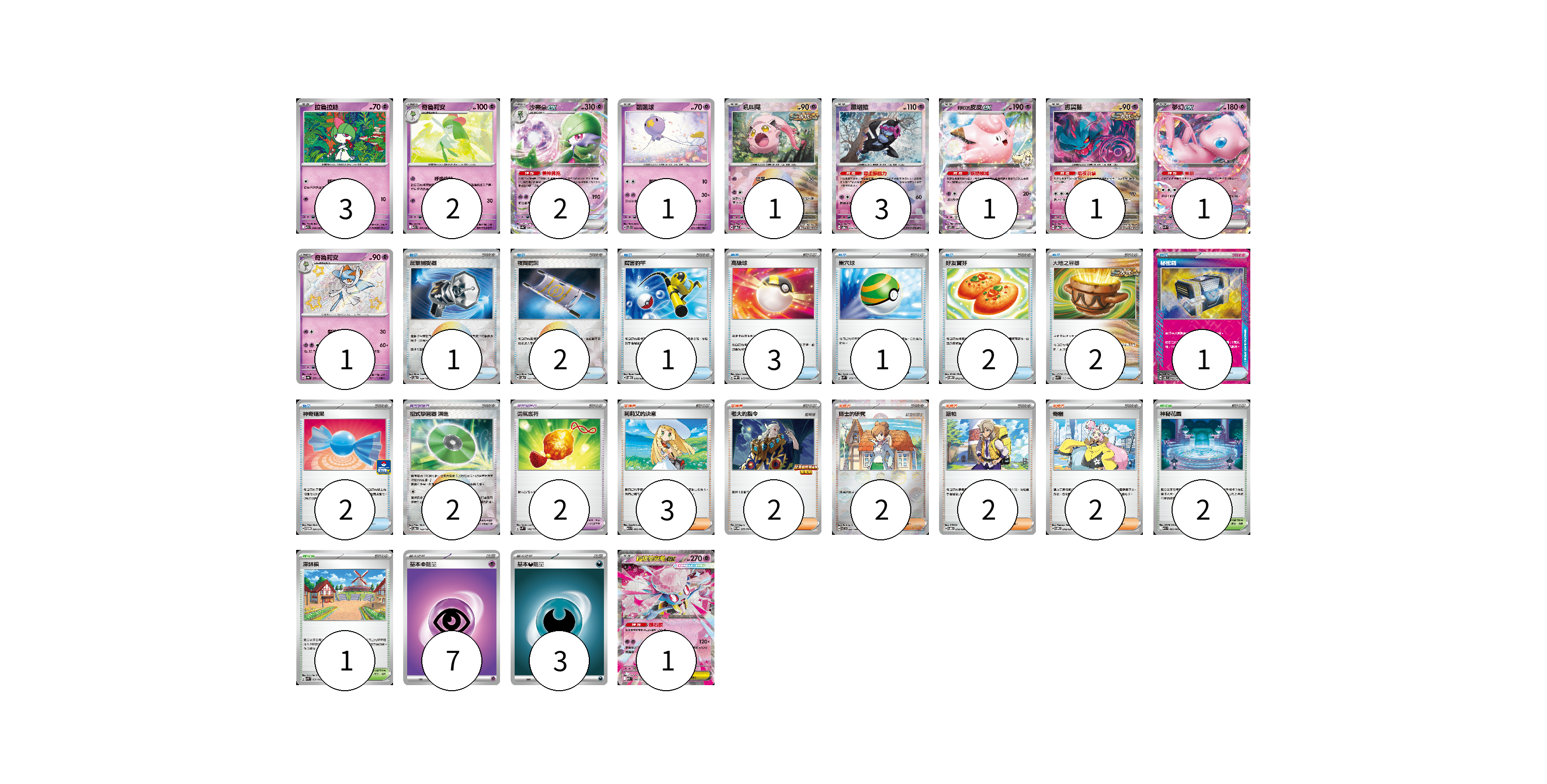 牌組構築方案 以此牌組為基礎新構築牌組 顯示卡面 顯示列表 寶可夢卡(17) 3 2 2 1 1 3 1 1 1 1 1 寶可夢道具(4) 2 2 物品卡(15) 1 2 1 3 1 2 2 1 2 支援者卡(11) 3 2 2 2 2 競技場卡(3) 2 1 能量卡(10) 7 3 寶可夢卡(17) 卡牌名稱 張數 卡牌名稱 張數 拉魯拉絲 M1S 040/063 03 奇魯莉安 M1S 041/063 02 沙奈朵ex SV4a 082/190 02 飄飄球 SVTS 005/022 01 吼叫尾 SV8a 071/187 01 願增猿 SV8a 075/187 03 莉莉艾的皮皮ex SV9 033/100 01 振翼髮 SV8a 072/187 01 夢幻ex SVK 001/042 01 奇魯莉安 SV4a 259/190 01 超級蒂安希ex MBD 006/022 01 寶可夢道具(4) 卡牌名稱 張數 卡牌名稱 張數 招式學習器 演進 SV8a 160/187 02 勇氣護符 SVM 142/175 02 物品卡(15) 卡牌名稱 張數 卡牌名稱 張數 反擊捕捉器 SV8a 139/187 01 夜間擔架 SV8a 151/187 02 厲害釣竿 SVOD 010/020 01 高級球 SVQP 015/023 03 巢穴球 SVM 133/175 01 好友寶芬 SVOM 012/021 02 大地之容器 SVK 012/042 02 秘密箱 SV6 092/101 01 神奇糖果 SV-P 104/SV-P 02 支援者卡(11) 卡牌名稱 張數 卡牌名稱 張數 莉莉艾的決意 M1L 062/063 03 老大的指令 SV-P 255/SV-P 02 博士的研究 SV11B 084/086 02 派帕 SVOD 018/020 02 奇樹 SVOM 018/021 02 競技場卡(3) 卡牌名稱 張數 卡牌名稱 張數 神秘花園 M1S 063/063 02 深缽鎮 SVK 039/042 01 能量卡(10) 卡牌名稱 張數 卡牌名稱 張數 基本超能量 sv-p PSY 07 基本惡能量 sv-p DAR 03 以此牌組為基礎新構築牌組 牌組編碼 GmREwD-Wpiuve-xCiNfE copy 列印牌組單 牌組編碼已複製 分享至SNS