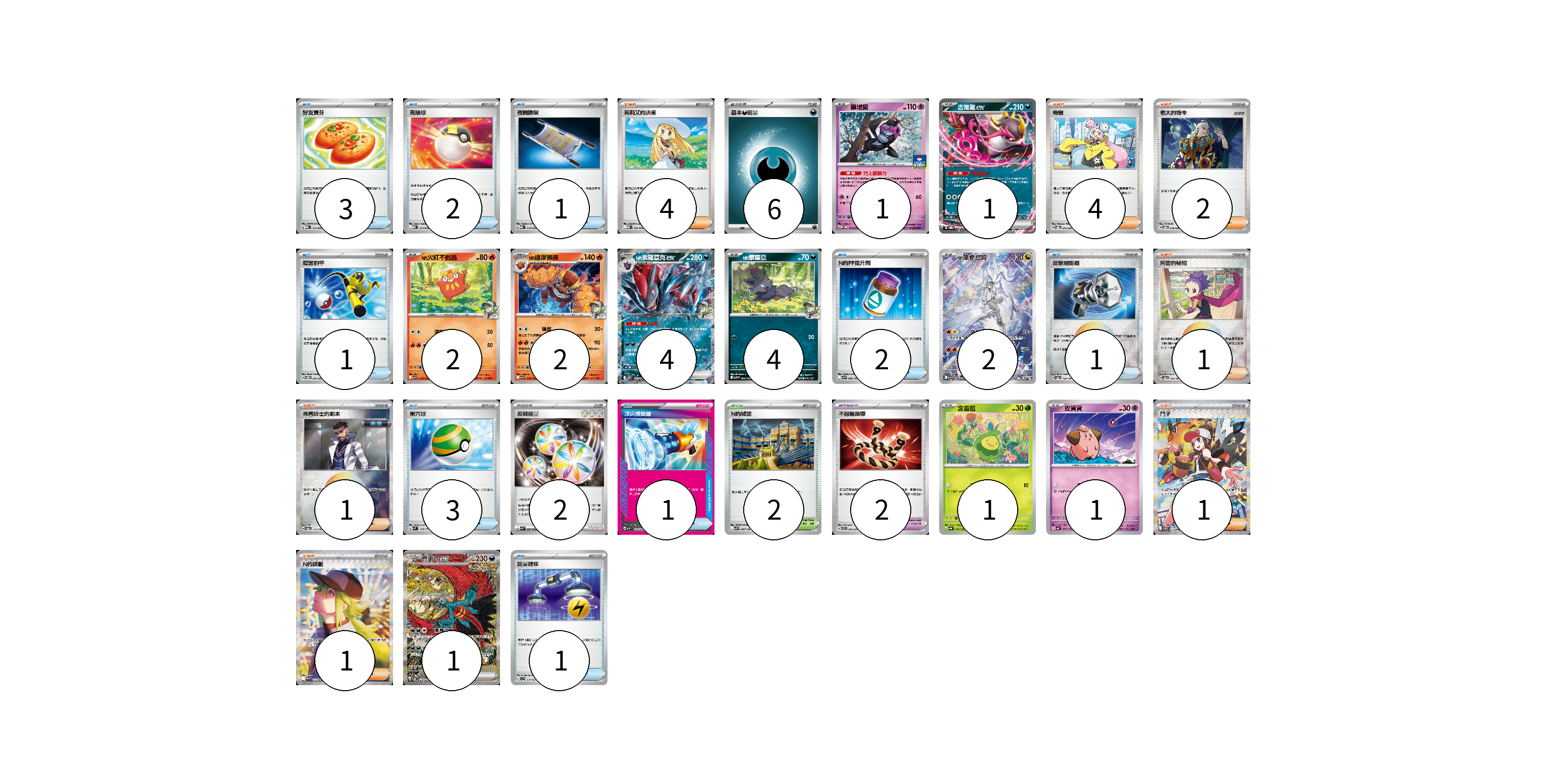 牌組構築方案 以此牌組為基礎新構築牌組 顯示卡面 顯示列表 寶可夢卡(19) 1 1 2 2 4 4 2 1 1 1 寶可夢道具(2) 2 物品卡(15) 3 2 1 1 2 1 3 1 1 支援者卡(14) 4 4 2 1 1 1 1 競技場卡(2) 2 能量卡(8) 6 2 寶可夢卡(19) 卡牌名稱 張數 卡牌名稱 張數 願增猿 M-P 014/M-P 01 吉雉雞ex SVOD 004/020 01 N的火紅不倒翁 SV9 015/100 02 N的達摩狒狒 SV9 016/100 02 N的索羅亞克ex SV9 061/100 04 N的索羅亞 SV9 060/100 04 N的萊希拉姆 SV9 109/100 02 含羞苞 SV8a 001/187 01 皮寶寶 SV4a 077/190 01 轟鳴月ex SV8a 218/187 01 寶可夢道具(2) 卡牌名稱 張數 卡牌名稱 張數 不服輸頭帶 SVTL 016/021 02 物品卡(15) 卡牌名稱 張數 卡牌名稱 張數 好友寶芬 MBD 013/022 03 高級球 MBD 014/022 02 夜間擔架 MBD 016/022 01 厲害釣竿 SVOM 011/021 01 N的PP提升劑 SV9 089/100 02 反擊捕捉器 SV8a 139/187 01 巢穴球 SVM 133/175 03 頂尖捕捉器 MBG 014/022 01 能量轉移 SVC 011/021 01 支援者卡(14) 卡牌名稱 張數 卡牌名稱 張數 莉莉艾的決意 MBD 021/022 04 奇樹 SVOD 016/020 04 老大的指令 SVOD 019/020 02 阿杏的秘招 SV8a 166/187 01 弗圖博士的劇本 SV8a 175/187 01 鬥子 SV11W 173/086 01 N的謀劃 SV11B 173/086 01 競技場卡(2) 卡牌名稱 張數 卡牌名稱 張數 N的城堡 SV9 097/100 02 能量卡(8) 卡牌名稱 張數 卡牌名稱 張數 基本【惡】能量 MBG DAR 06 反轉能量 SVK 041/042 02 以此牌組為基礎新構築牌組 牌組編碼 GnLeNs-wZGntZ-vvcLhW copy 列印牌組單 牌組編碼已複製 分享至SNS