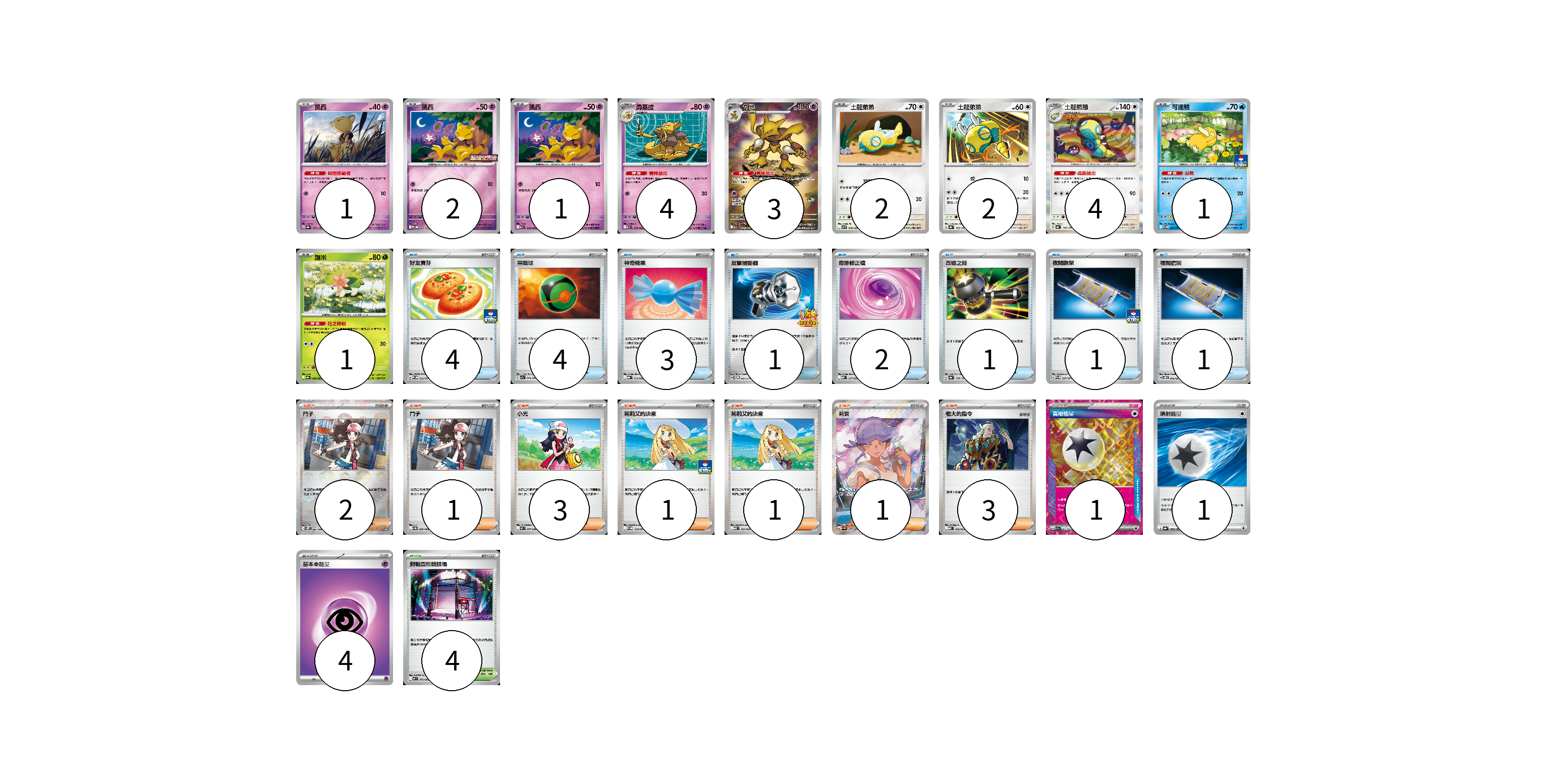 牌組構築方案 以此牌組為基礎新構築牌組 顯示卡面 顯示列表 寶可夢卡(21) 1 2 1 4 3 2 2 4 1 1 物品卡(17) 4 4 3 1 2 1 1 1 支援者卡(12) 2 1 3 1 1 1 3 競技場卡(4) 4 能量卡(6) 1 1 4 寶可夢卡(21) 卡牌名稱 張數 卡牌名稱 張數 凱西 SV8a 057/187 01 凱西 M-P 004/M-P 02 凱西 M1S 036/063 01 勇基拉 M1S 037/063 04 胡地 M1S 071/063 03 土龍弟弟 SV9 078/100 02 土龍弟弟 SV8a 129/187 02 土龍節節 SV8a 130/187 04 可達鴨 SV-P 220/SV-P 01 謝米 SV9a 006/063 01 物品卡(17) 卡牌名稱 張數 卡牌名稱 張數 好友寶芬 SV-P 212/SV-P 04 黑暗球 SV7a 054/064 04 神奇糖果 MBG 013/022 03 反擊捕捉器 SV-P 083/SV-P 01 奇跡修正檔 MBD 017/022 02 改造之錘 SV8a 138/187 01 夜間擔架 SV-P 227/SV-P 01 夜間擔架 SVOM 016/021 01 支援者卡(12) 卡牌名稱 張數 卡牌名稱 張數 鬥子 SV11W 085/086 02 鬥子 SV11W 085/086 01 小光 M2 077/080 03 莉莉艾的決意 M-P 018/M-P 01 莉莉艾的決意 MBD 021/022 01 莉普 SV4M 087/066 01 老大的指令 MBD 020/022 03 競技場卡(4) 卡牌名稱 張數 卡牌名稱 張數 對戰圓形競技場 M2 079/080 04 能量卡(6) 卡牌名稱 張數 卡牌名稱 張數 富裕能量 SV7a 064/064 01 噴射能量 SV8a 185/187 01 基本超能量 sv-p PSY 04 以此牌組為基礎新構築牌組 牌組編碼 GoVIsy-qAIwOg-STdOzS copy 列印牌組單 牌組編碼已複製 分享至SNS