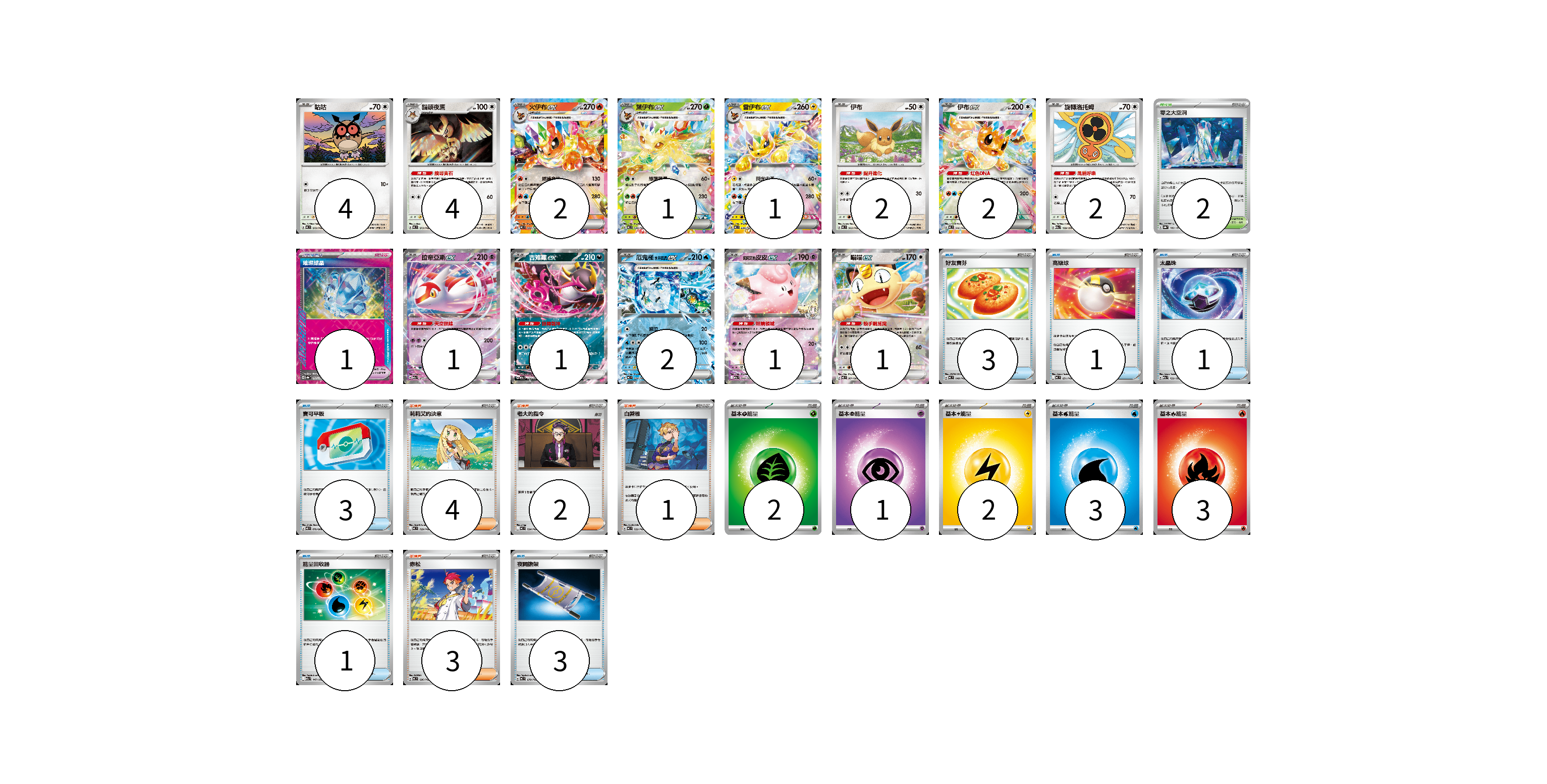 牌組構築方案 以此牌組為基礎新構築牌組 顯示卡面 顯示列表 寶可夢卡(24) 4 4 2 1 1 2 2 2 1 1 2 1 1 寶可夢道具(1) 1 物品卡(12) 3 1 1 3 1 3 支援者卡(10) 4 2 1 3 競技場卡(2) 2 能量卡(11) 2 1 2 3 3 寶可夢卡(24) 卡牌名稱 張數 卡牌名稱 張數 咕咕 MC 572/742 04 貓頭夜鷹 MC 573/742 04 火伊布ex MC 094/742 02 葉伊布ex MC 038/742 01 雷伊布ex MC 238/742 01 伊布 MC 565/742 02 伊布ex MC 566/742 02 旋轉洛托姆 M2a 139/193 02 拉帝亞斯ex M2a 075/193 01 吉雉雞ex M2a 114/193 01 厄鬼椪 水井面具ex MC 224/742 02 莉莉艾的皮皮ex M2a 060/193 01 喵喵ex M3 061/080 01 寶可夢道具(1) 卡牌名稱 張數 卡牌名稱 張數 璀璨結晶 SV8a 152/187 01 物品卡(12) 卡牌名稱 張數 卡牌名稱 張數 好友寶芬 MC 648/742 03 高級球 MC 651/742 01 太晶珠 M2a 152/193 01 寶可平板 M3 070/080 03 能量回收器 M2a 147/193 01 夜間擔架 MC 670/742 03 支援者卡(10) 卡牌名稱 張數 卡牌名稱 張數 莉莉艾的決意 MC 729/742 04 老大的指令 MC 724/742 02 白蕾雅 MC 722/742 01 赤松 MC 696/742 03 競技場卡(2) 卡牌名稱 張數 卡牌名稱 張數 零之大空洞 SV8a 182/187 02 能量卡(11) 卡牌名稱 張數 卡牌名稱 張數 基本【草】能量 MJ GRA 02 基本【超】能量 MC PSY 01 基本【雷】能量 MC LIG 02 基本【水】能量 MC WAT 03 基本【火】能量 MC FIR 03 以此牌組為基礎新構築牌組 牌組編碼 GphRlm-IUBBZn-xvcuUS copy 列印牌組單 牌組編碼已複製 分享至SNS