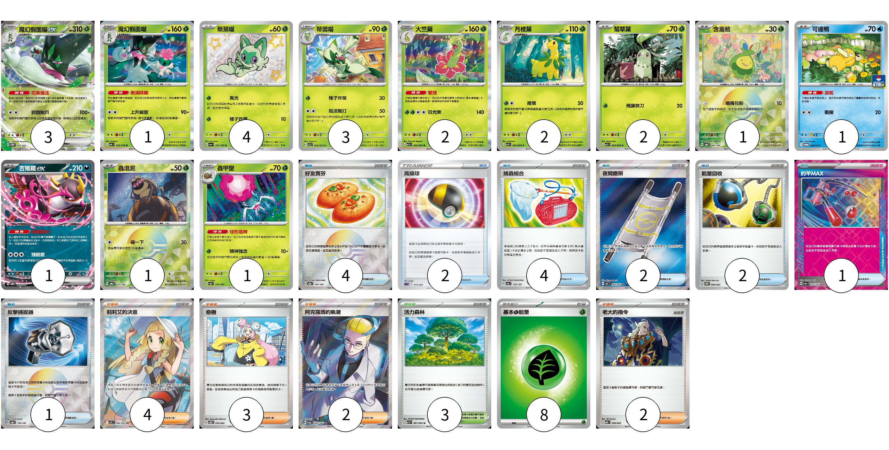 牌組構築方案 以此牌組為基礎新構築牌組 顯示卡面 顯示列表 寶可夢卡(22) 3 1 4 3 2 2 2 1 1 1 1 1 物品卡(16) 4 2 4 2 2 1 1 支援者卡(11) 4 3 2 2 競技場卡(3) 3 能量卡(8) 8 寶可夢卡(22) 卡牌名稱 張數 卡牌名稱 張數 魔幻假面喵ex SVTM 005/022 03 魔幻假面喵 SV9 012/100 01 新葉喵 SV4a 201/190 04 蒂蕾喵 SV1a 006/073 03 大竺葵 M1S 005/063 02 月桂葉 M1S 004/063 02 菊草葉 M1S 003/063 02 含羞苞 SV8a 001/187 01 可達鴨 SV-P 220/SV-P 01 吉雉雞ex SVOD 004/020 01 蟲滾泥 SV8a 013/187 01 蟲甲聖 SV8a 014/187 01 物品卡(16) 卡牌名稱 張數 卡牌名稱 張數 好友寶芬 SV8a 147/187 04 高級球 SDM 015/022 02 捕蟲組合 SV8a 150/187 04 夜間擔架 M1L 083/063 02 能量回收 SVTM 009/022 02 釣竿MAX SV8a 142/187 01 反擊捕捉器 SV8a 139/187 01 支援者卡(11) 卡牌名稱 張數 卡牌名稱 張數 莉莉艾的決意 M1L 086/063 04 奇樹 SVOD 016/020 03 阿克羅瑪的執著 SV6a 083/064 02 老大的指令 MBD 020/022 02 競技場卡(3) 卡牌名稱 張數 卡牌名稱 張數 活力森林 M1S 061/063 03 能量卡(8) 卡牌名稱 張數 卡牌名稱 張數 基本【草】能量 M-P GRA 08 以此牌組為基礎新構築牌組 牌組編碼 GsqDWK-opOkBV-UgxHyz copy 列印牌組單 牌組編碼已複製 分享至SNS