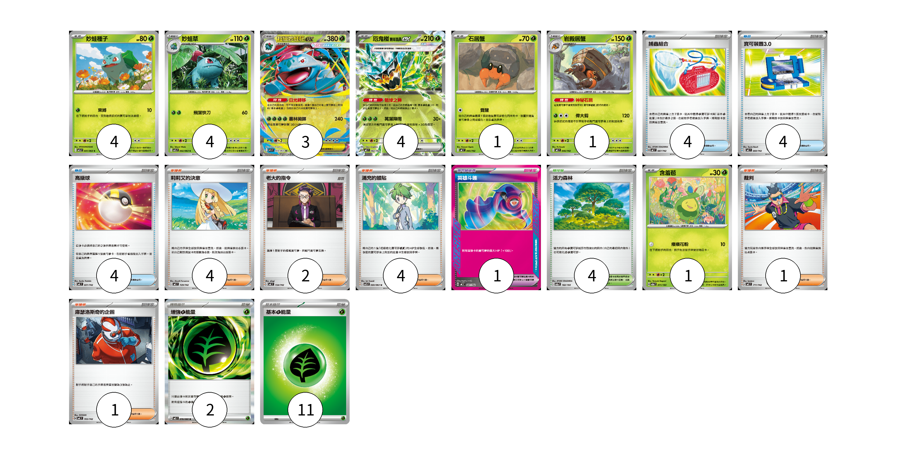 牌組構築方案 以此牌組為基礎新構築牌組 顯示卡面 顯示列表 寶可夢卡(18) 4 4 3 4 1 1 1 寶可夢道具(1) 1 物品卡(12) 4 4 4 支援者卡(12) 4 2 4 1 1 競技場卡(4) 4 能量卡(13) 2 11 寶可夢卡(18) 卡牌名稱 張數 卡牌名稱 張數 妙蛙種子 M1L 001/063 04 妙蛙草 M1L 002/063 04 超級妙蛙花ex M1L 003/063 03 厄鬼椪 碧草面具ex MC 082/742 04 石居蟹 MC 045/742 01 岩殿居蟹 MC 046/742 01 含羞苞 M2a 011/193 01 寶可夢道具(1) 卡牌名稱 張數 卡牌名稱 張數 英雄斗篷 MC 687/742 01 物品卡(12) 卡牌名稱 張數 卡牌名稱 張數 捕蟲組合 MC 667/742 04 寶可裝置3.0 MC 660/742 04 高級球 MC 651/742 04 支援者卡(12) 卡牌名稱 張數 卡牌名稱 張數 莉莉艾的決意 MC 729/742 04 老大的指令 MC 724/742 02 滿充的體貼 M1S 060/063 04 裁判 MC 711/742 01 庫瑟洛斯奇的企圖 MC 705/742 01 競技場卡(4) 卡牌名稱 張數 卡牌名稱 張數 活力森林 M2a 182/193 04 能量卡(13) 卡牌名稱 張數 卡牌名稱 張數 增強【草】能量 M3 078/080 02 基本【草】能量 MJ GRA 11 以此牌組為基礎新構築牌組 牌組編碼 GyYrCS-KRMBCj-jSQJvL copy 列印牌組單 牌組編碼已複製 分享至SNS