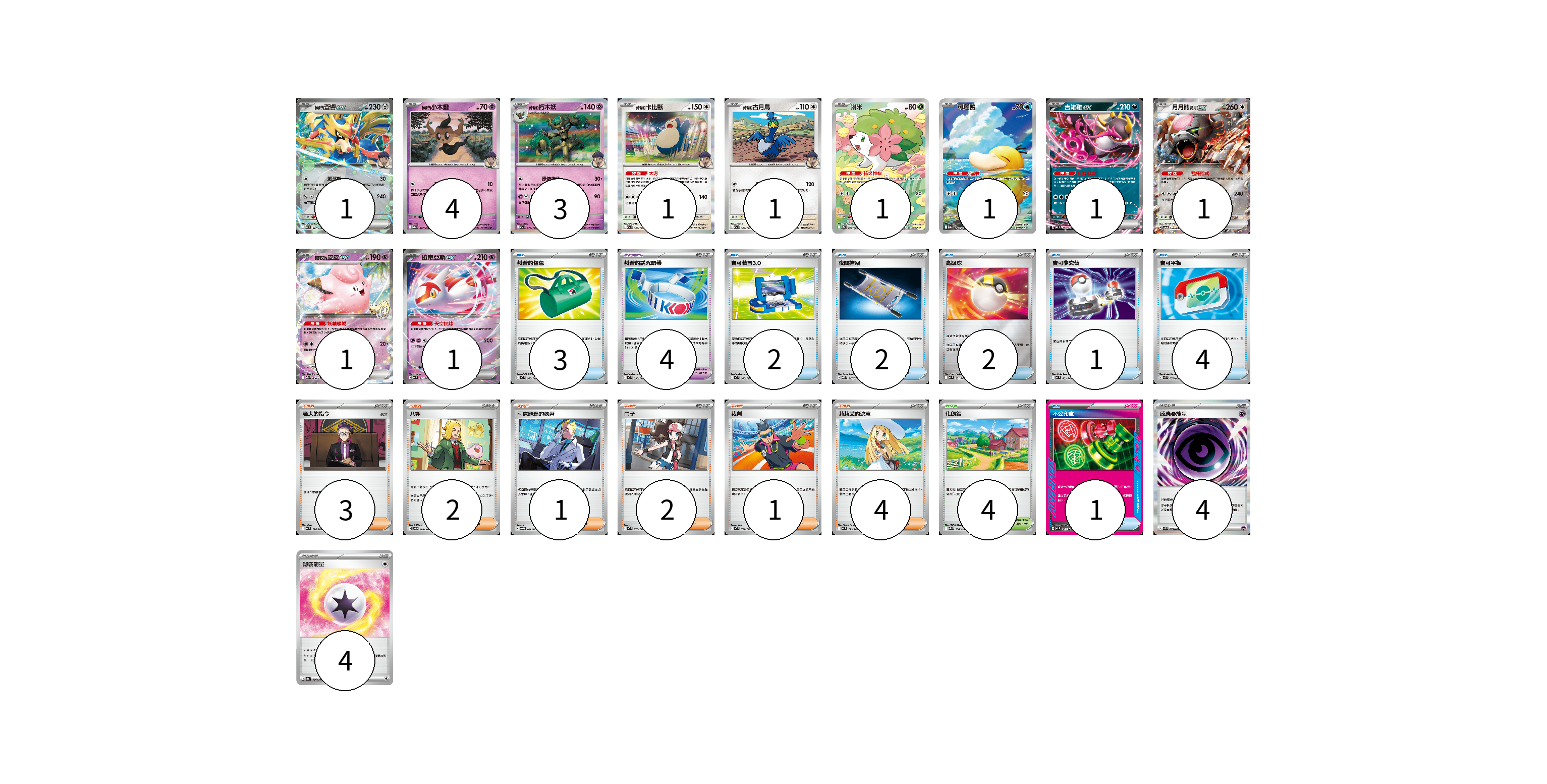 牌組構築方案 以此牌組為基礎新構築牌組 顯示卡面 顯示列表 寶可夢卡(16) 1 4 3 1 1 1 1 1 1 1 1 寶可夢道具(4) 4 物品卡(15) 3 2 2 2 1 4 1 支援者卡(13) 3 2 1 2 1 4 競技場卡(4) 4 能量卡(8) 4 4 寶可夢卡(16) 卡牌名稱 張數 卡牌名稱 張數 <赫普的>蒼響ex MC 527/742 01 赫普的小木靈 M2a 077/193 04 赫普的朽木妖 M2a 078/193 03 赫普的卡比獸 M2a 136/193 01 赫普的古月鳥 M2a 143/193 01 謝米 SV9a 066/063 01 可達鴨 M2a 199/193 01 吉雉雞ex MC 489/742 01 月月熊 赫月 ex SV5a 052/066 01 莉莉艾的皮皮ex M2a 060/193 01 拉帝亞斯ex MC 312/742 01 寶可夢道具(4) 卡牌名稱 張數 卡牌名稱 張數 赫普的講究頭帶 MC 690/742 04 物品卡(15) 卡牌名稱 張數 卡牌名稱 張數 赫普的包包 MC 666/742 03 寶可裝置3.0 MC 660/742 02 夜間擔架 MBG 017/022 02 高級球 MC 651/742 02 寶可夢交替 MC 663/742 01 寶可平板 M3 070/080 04 不公印章 MC 633/742 01 支援者卡(13) 卡牌名稱 張數 卡牌名稱 張數 老大的指令 MC 724/742 03 八朔 SV6 098/101 02 阿克羅瑪的執著 SVOM 017/021 01 鬥子 MC 718/742 02 裁判 MC 711/742 01 莉莉艾的決意 MC 729/742 04 競技場卡(4) 卡牌名稱 張數 卡牌名稱 張數 化朗鎮 M2a 186/193 04 能量卡(8) 卡牌名稱 張數 卡牌名稱 張數 感應【超】能量 M3 079/080 04 薄霧能量 SV8a 186/187 04 以此牌組為基礎新構築牌組 牌組編碼 GzZnXu-AIwvMd-RtWqMe copy 列印牌組單 牌組編碼已複製 分享至SNS