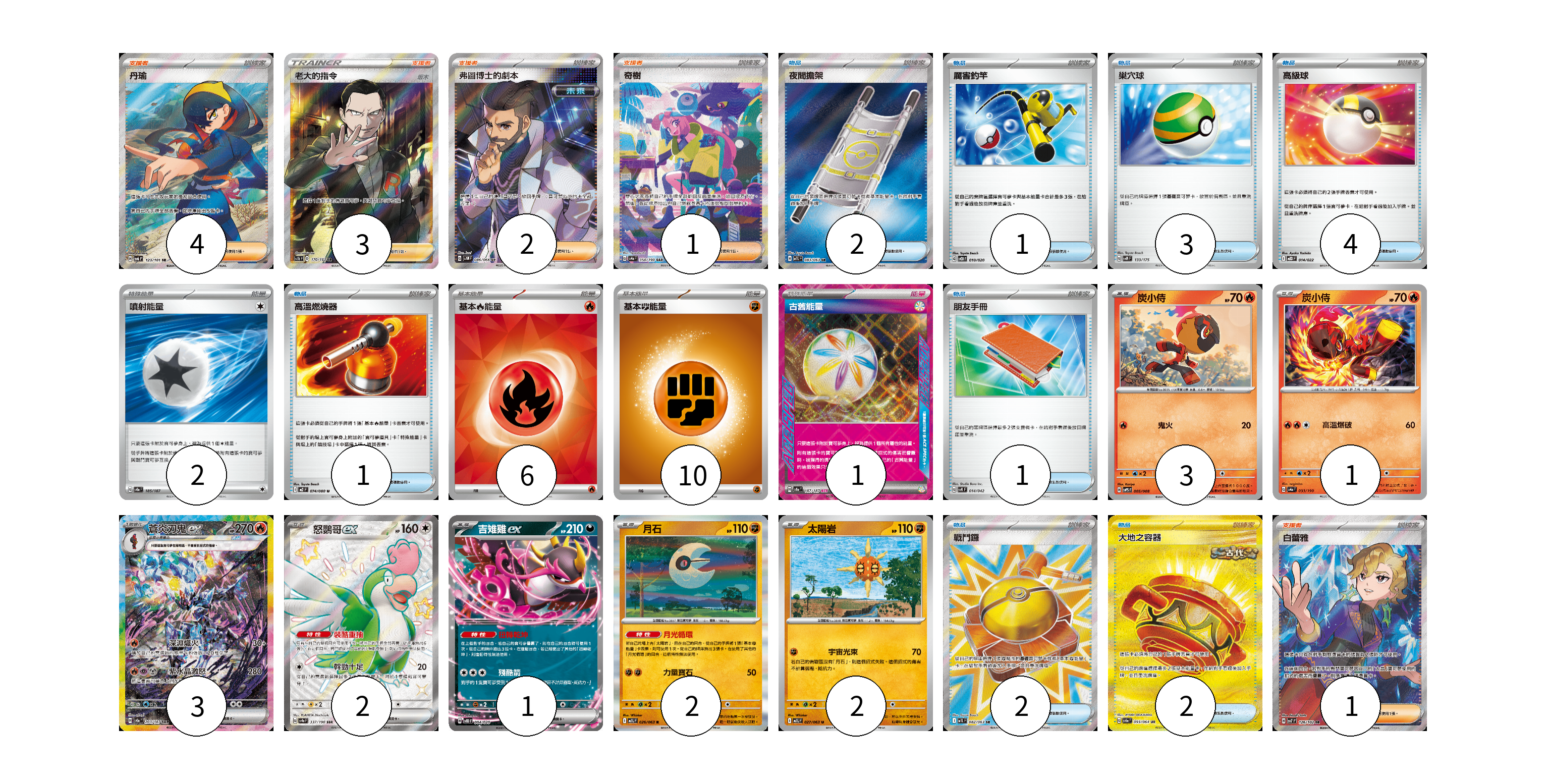 牌組構築方案 以此牌組為基礎新構築牌組 顯示卡面 顯示列表 寶可夢卡(14) 3 1 3 2 1 2 2 物品卡(16) 2 1 3 4 1 1 2 2 支援者卡(11) 4 3 2 1 1 能量卡(19) 2 6 10 1 寶可夢卡(14) 卡牌名稱 張數 卡牌名稱 張數 炭小侍 SVPS 005/008 03 炭小侍 SV4a 033/190 01 蒼炎刃鬼ex SV8a 203/187 03 怒鸚哥ex SV4a 337/190 02 吉雉雞ex SVOD 004/020 01 月石 M1L 026/063 02 太陽岩 M1L 027/063 02 物品卡(16) 卡牌名稱 張數 卡牌名稱 張數 夜間擔架 M1L 083/063 02 厲害釣竿 SVOD 010/020 01 巢穴球 SVM 133/175 03 高級球 MBD 014/022 04 高溫燃燒器 M2 074/080 01 朋友手冊 SVK 014/042 01 戰鬥鑼 M1L 082/063 02 大地之容器 SV6a 093/064 02 支援者卡(11) 卡牌名稱 張數 卡牌名稱 張數 丹瑜 SV6 123/101 04 老大的指令(坂木) SC1b 170/153 03 弗圖博士的劇本 SV4M 086/066 02 奇樹 SV4a 350/190 01 白蕾雅 SV7 126/102 01 能量卡(19) 卡牌名稱 張數 卡牌名稱 張數 噴射能量 SV8a 185/187 02 基本【火】能量 SVQL FIR 06 基本【鬥】能量 M-P FIG 10 古舊能量 SV8a 187/187 01 以此牌組為基礎新構築牌組 牌組編碼 HABrzD-EhdpyV-gcERGA copy 列印牌組單 牌組編碼已複製 分享至SNS