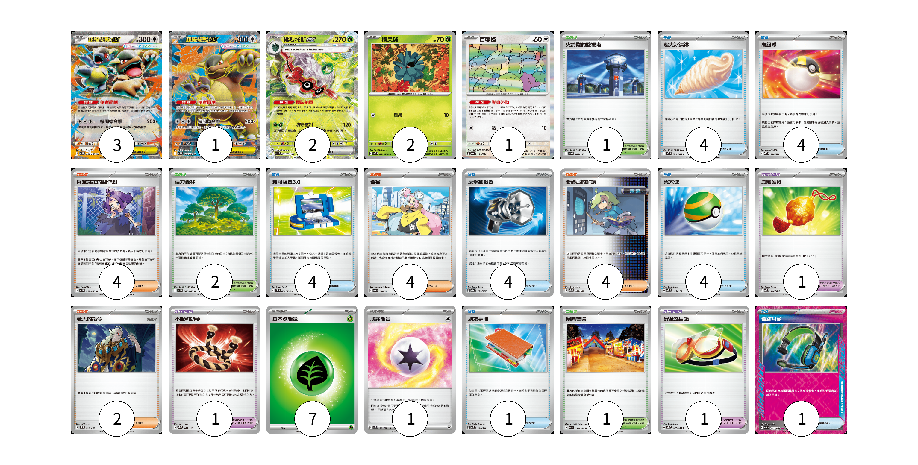 牌組構築方案 以此牌組為基礎新構築牌組 顯示卡面 顯示列表 寶可夢卡(9) 3 1 2 2 1 寶可夢道具(3) 1 1 1 物品卡(22) 4 4 4 4 4 1 1 支援者卡(14) 4 4 4 2 競技場卡(4) 1 2 1 能量卡(8) 7 1 寶可夢卡(9) 卡牌名稱 張數 卡牌名稱 張數 超級袋獸ex M1S 051/063 03 超級袋獸ex M1S 080/063 01 佛烈托斯ex SV4a 009/190 02 榛果球 SV10 001/098 02 百變怪 SV4a 144/190 01 寶可夢道具(3) 卡牌名稱 張數 卡牌名稱 張數 勇氣護符 SVM 142/175 01 不服輸頭帶 SV4a 168/190 01 安全護目鏡 SV2a 157/165 01 物品卡(22) 卡牌名稱 張數 卡牌名稱 張數 超大冰淇淋 M2 073/080 04 高級球 MBD 014/022 04 寶可裝置3.0 SV11B 081/086 04 反擊捕捉器 SV8a 139/187 04 巢穴球 SVM 133/175 04 朋友手冊 SVK 014/042 01 奇跡耳麥 SV8 097/106 01 支援者卡(14) 卡牌名稱 張數 卡牌名稱 張數 阿塞蘿拉的惡作劇 M1S 059/063 04 奇樹 SVOM 018/021 04 暗碼迷的解讀 SV8a 165/187 04 老大的指令 SVK 036/042 02 競技場卡(4) 卡牌名稱 張數 卡牌名稱 張數 火箭隊的監視塔 M2a 189/193 01 活力森林 M1S 061/063 02 祭典會場 SV6 099/101 01 能量卡(8) 卡牌名稱 張數 卡牌名稱 張數 基本【草】能量 M-P GRA 07 薄霧能量 SV5M 071/071 01 以此牌組為基礎新構築牌組 牌組編碼 HAwxku-KFIIBO-gNfcfI copy 列印牌組單 牌組編碼已複製 分享至SNS