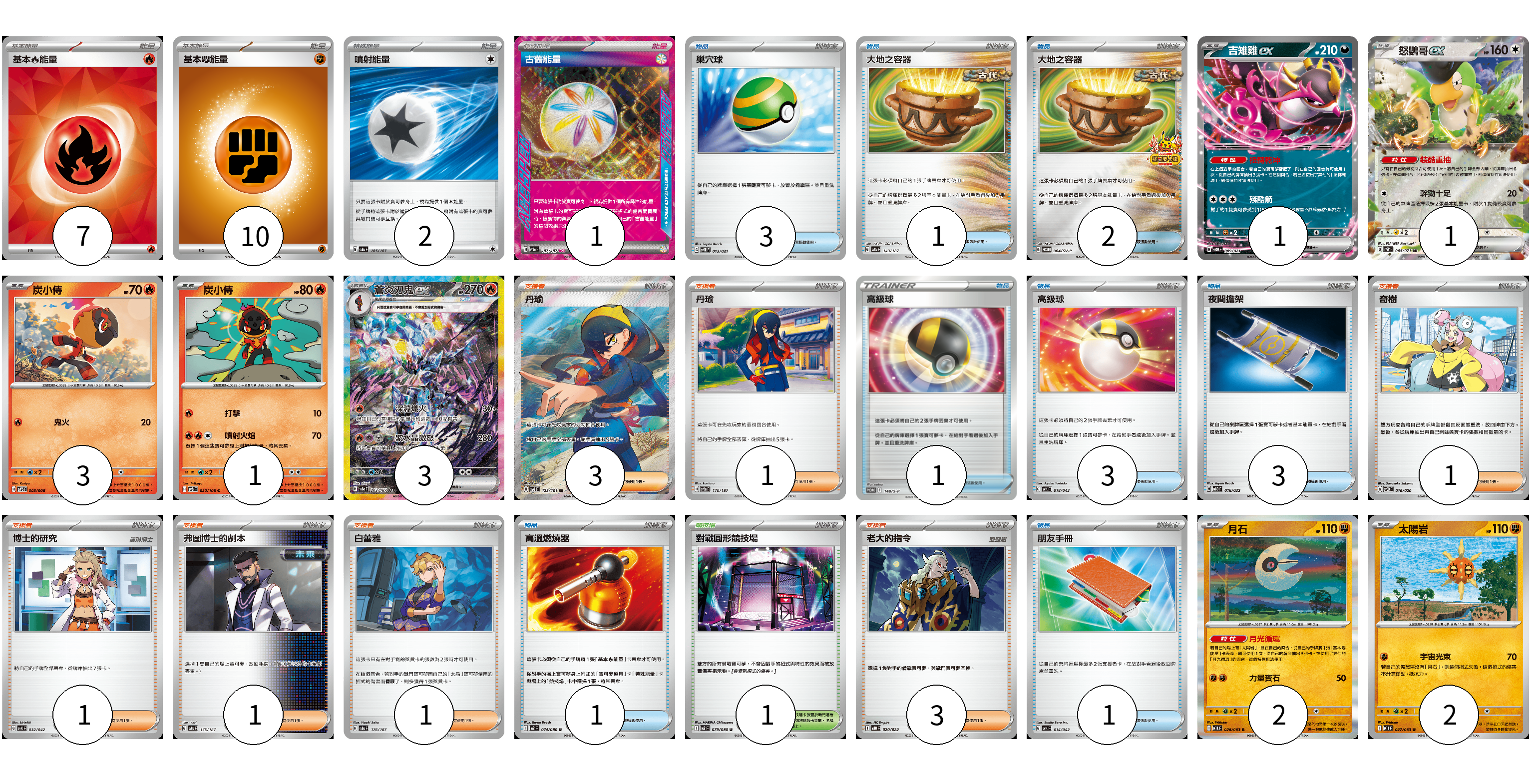 牌組構築方案 以此牌組為基礎新構築牌組 顯示卡面 顯示列表 寶可夢卡(13) 1 1 3 1 3 2 2 物品卡(15) 3 1 2 1 3 3 1 1 支援者卡(11) 3 1 1 1 1 1 3 競技場卡(1) 1 能量卡(20) 7 10 2 1 寶可夢卡(13) 卡牌名稱 張數 卡牌名稱 張數 吉雉雞ex SVOM 009/021 01 怒鸚哥ex SV2P 065/071 01 炭小侍 SVPS 005/008 03 炭小侍 SV8 020/106 01 蒼炎刃鬼ex SV8a 203/187 03 月石 M1L 026/063 02 太陽岩 M1L 027/063 02 物品卡(15) 卡牌名稱 張數 卡牌名稱 張數 巢穴球 SVTR 013/021 03 大地之容器 SV8a 143/187 01 大地之容器 SV-P 084/SV-P 02 高級球 S-P 148/S-P 01 高級球 SVK 018/042 03 夜間擔架 MBD 016/022 03 高溫燃燒器 M2 074/080 01 朋友手冊 SVK 014/042 01 支援者卡(11) 卡牌名稱 張數 卡牌名稱 張數 丹瑜 SV6 123/101 03 丹瑜 SV8a 170/187 01 奇樹 SVOD 016/020 01 博士的研究 SVK 032/042 01 弗圖博士的劇本 SV8a 175/187 01 白蕾雅 SV8a 176/187 01 老大的指令 MBD 020/022 03 競技場卡(1) 卡牌名稱 張數 卡牌名稱 張數 對戰圓形競技場 M2 079/080 01 能量卡(20) 卡牌名稱 張數 卡牌名稱 張數 基本【火】能量 SVQL FIR 07 基本【鬥】能量 M-P FIG 10 噴射能量 SV8a 185/187 02 古舊能量 SV8a 187/187 01 以此牌組為基礎新構築牌組 牌組編碼 HCYZKp-rpkoef-ibzkng copy 列印牌組單 牌組編碼已複製 分享至SNS