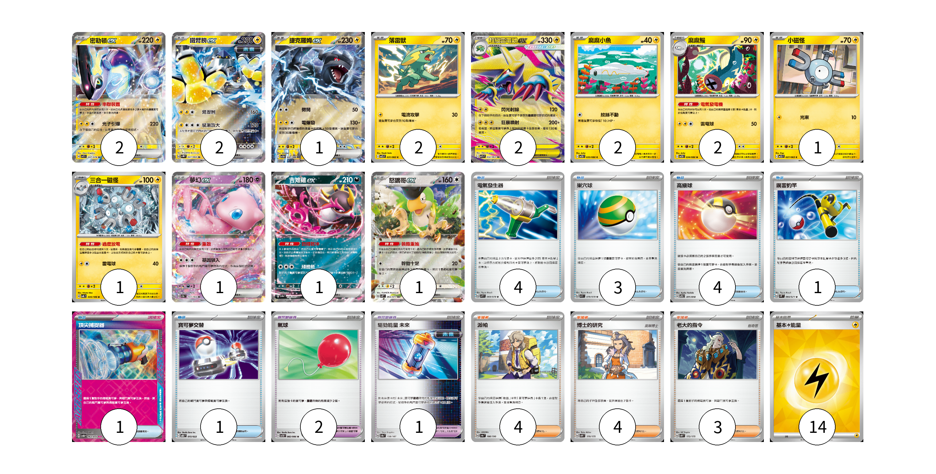 牌組構築方案 以此牌組為基礎新構築牌組 顯示卡面 顯示列表 寶可夢卡(18) 2 2 1 2 2 2 2 1 1 1 1 1 寶可夢道具(3) 2 1 物品卡(14) 4 3 4 1 1 1 支援者卡(11) 4 4 3 能量卡(14) 14 寶可夢卡(18) 卡牌名稱 張數 卡牌名稱 張數 密勒頓ex SV1V 037/078 02 鐵臂膀ex SV4M 027/066 02 捷克羅姆ex SV11B 037/086 01 落雷獸 M1S 031/063 02 超級雷電獸ex M1S 032/063 02 麻麻小魚 SV11B 033/086 02 麻麻鰻 SV11B 034/086 02 小磁怪 M1S 027/063 01 三合一磁怪 SV8 035/106 01 夢幻ex SV2a 151/165 01 吉雉雞ex SV6a 038/064 01 怒鸚哥ex SV2P 065/071 01 寶可夢道具(3) 卡牌名稱 張數 卡牌名稱 張數 氣球 SV11B 082/086 02 驅勁能量 未來 SV8a 158/187 01 物品卡(14) 卡牌名稱 張數 卡牌名稱 張數 電氣發生器 SV1V 069/078 04 巢穴球 SV1S 070/078 03 高級球 SVTH 011/018 04 厲害釣竿 SV2P 066/071 01 頂尖捕捉器 SV5M 062/071 01 寶可夢交替 MBG 015/022 01 支援者卡(11) 卡牌名稱 張數 卡牌名稱 張數 派帕 SV4a 180/190 04 博士的研究 SVM 170/175 04 老大的指令 SVM 172/175 03 能量卡(14) 卡牌名稱 張數 卡牌名稱 張數 基本【雷】能量 SVQP LIG 14 以此牌組為基礎新構築牌組 牌組編碼 HCjCsq-CEEEdd-YFjLbK copy 列印牌組單 牌組編碼已複製 分享至SNS