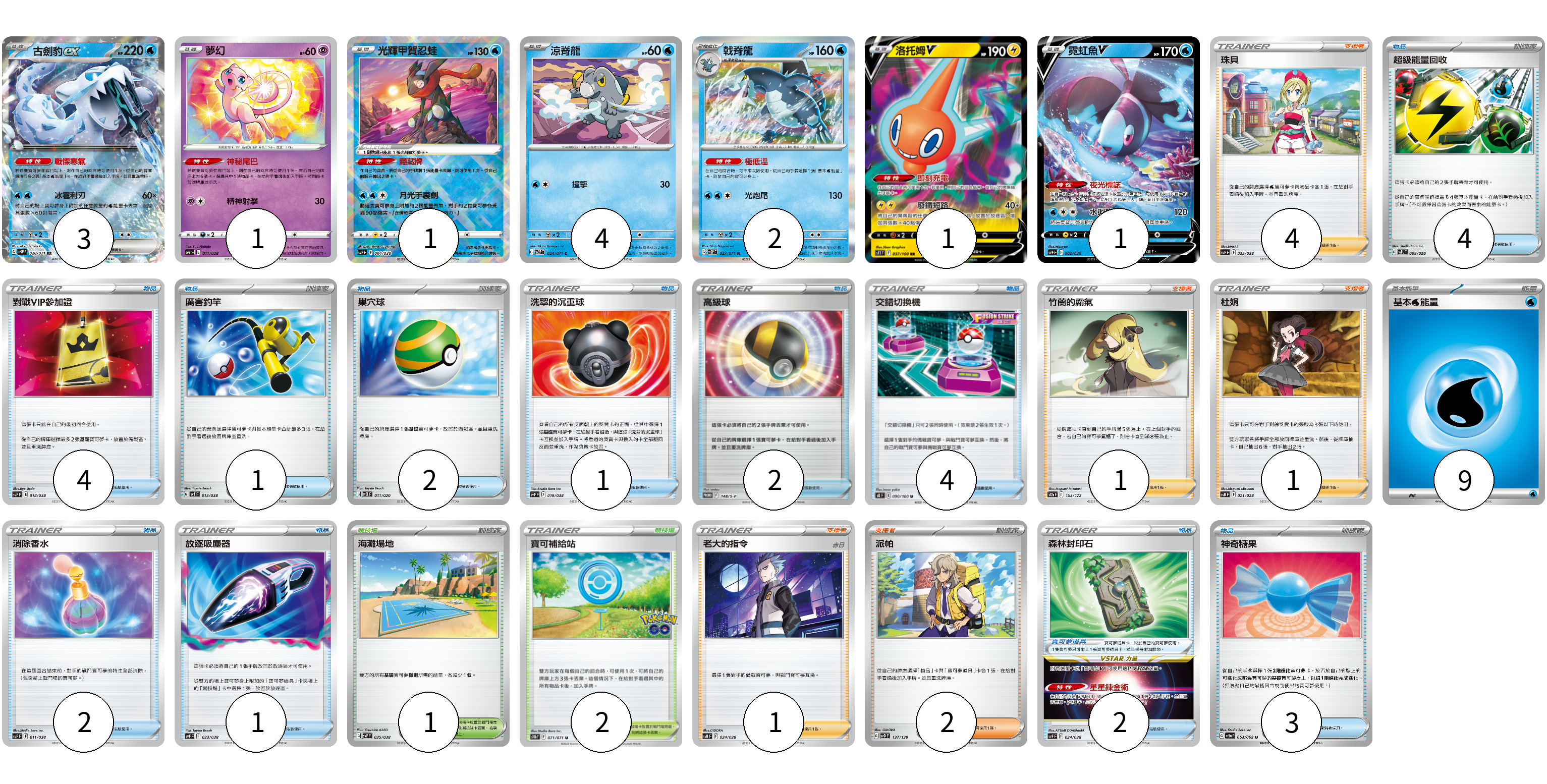牌組構築方案 以此牌組為基礎新構築牌組 顯示卡面 顯示列表 寶可夢卡(13) 3 1 1 4 2 1 1 物品卡(26) 4 4 1 2 1 2 4 2 1 2 3 支援者卡(9) 4 1 1 1 2 競技場卡(3) 1 2 能量卡(9) 9 寶可夢卡(13) 卡牌名稱 張數 卡牌名稱 張數 古劍豹ex SV2P 028/071 03 夢幻 SVB 011/028 01 光輝甲賀忍蛙 SVF 004/038 01 涼脊龍 SV2P 024/071 04 戟脊龍 SV2P 027/071 02 洛托姆V S11 037/100 01 霓虹魚V SVF 002/038 01 物品卡(26) 卡牌名稱 張數 卡牌名稱 張數 超級能量回收 SVEL 009/020 04 對戰VIP參加證 SVF 018/038 04 厲害釣竿 SVF 013/038 01 巢穴球 SVEL 011/020 02 洗翠的沉重球 SVF 019/038 01 高級球 S-P 148/S-P 02 交錯切換機 S8 090/100 04 消除香水 SVF 011/038 02 放逐吸塵器 SVF 023/038 01 森林封印石 SVF 024/038 02 神奇糖果 SV3a 053/062 03 支援者卡(9) 卡牌名稱 張數 卡牌名稱 張數 珠貝 SVF 025/038 04 竹蘭的霸氣 S12a 153/172 01 杜娟 SVB 021/028 01 老大的指令(赤日) SVB 024/028 01 派帕 SVD 137/139 02 競技場卡(3) 卡牌名稱 張數 卡牌名稱 張數 海灘場地 SVF 035/038 01 寶可補給站 S10b 071/071 02 能量卡(9) 卡牌名稱 張數 卡牌名稱 張數 基本【水】能量 SVF WAT 09 以此牌組為基礎新構築牌組 牌組編碼 HDKjmx-bwMfgi-TzxJFQ copy 列印牌組單 牌組編碼已複製 分享至SNS