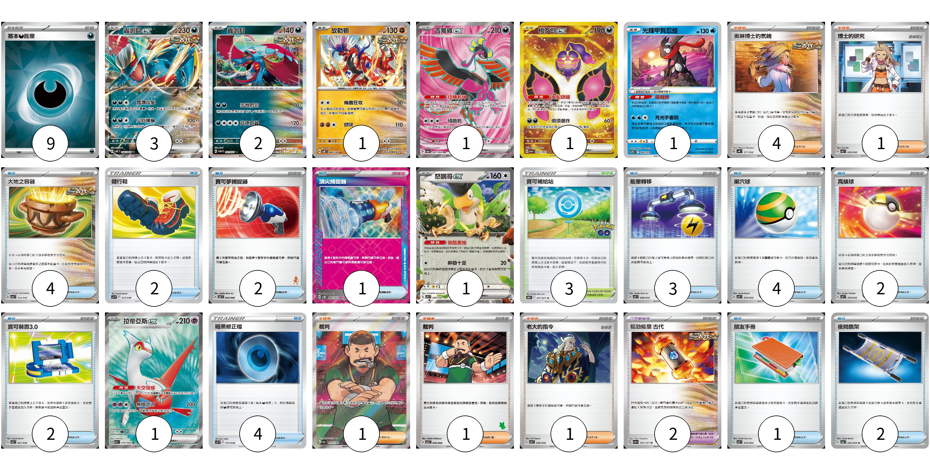 牌組構築方案 以此牌組為基礎新構築牌組 顯示卡面 顯示列表 寶可夢卡(11) 3 2 1 1 1 1 1 1 寶可夢道具(2) 2 物品卡(27) 4 2 2 1 3 4 2 2 4 1 2 支援者卡(8) 4 1 1 1 1 競技場卡(3) 3 能量卡(9) 9 寶可夢卡(11) 卡牌名稱 張數 卡牌名稱 張數 轟鳴月ex SV4K 054/066 03 轟鳴月 SV5K 051/071 02 故勒頓 SV8 069/106 01 吉雉雞ex SV6a 081/064 01 桃歹郎ex SV6a 092/064 01 光輝甲賀忍蛙 SVTG 002/019 01 怒鸚哥ex SVK 006/042 01 拉帝亞斯ex SV7a 078/064 01 寶可夢道具(2) 卡牌名稱 張數 卡牌名稱 張數 驅勁能量 古代 SV5K 065/071 02 物品卡(27) 卡牌名稱 張數 卡牌名稱 張數 大地之容器 SVK 012/042 04 健行鞋 SVF 015/038 02 寶可夢捕捉器 SVI 055/066 02 頂尖捕捉器 SV5M 062/071 01 能量轉移 SVK 008/042 03 巢穴球 SVK 016/042 04 高級球 SVK 018/042 02 寶可裝置3.0 SVK 021/042 02 暗黑修正檔 SVF 014/038 04 朋友手冊 SVK 014/042 01 夜間擔架 SV6a 056/064 02 支援者卡(8) 卡牌名稱 張數 卡牌名稱 張數 奧琳博士的氣魄 SVHK 017/022 04 博士的研究 SVK 032/042 01 裁判 SV4a 342/190 01 裁判 SVI 059/066 01 老大的指令 SVK 036/042 01 競技場卡(3) 卡牌名稱 張數 卡牌名稱 張數 寶可補給站 S10b 071/071 03 能量卡(9) 卡牌名稱 張數 卡牌名稱 張數 基本【惡】能量 SVK DAR 09 以此牌組為基礎新構築牌組 牌組編碼 HEriwM-GyFnwU-qlSpui copy 列印牌組單 牌組編碼已複製 分享至SNS