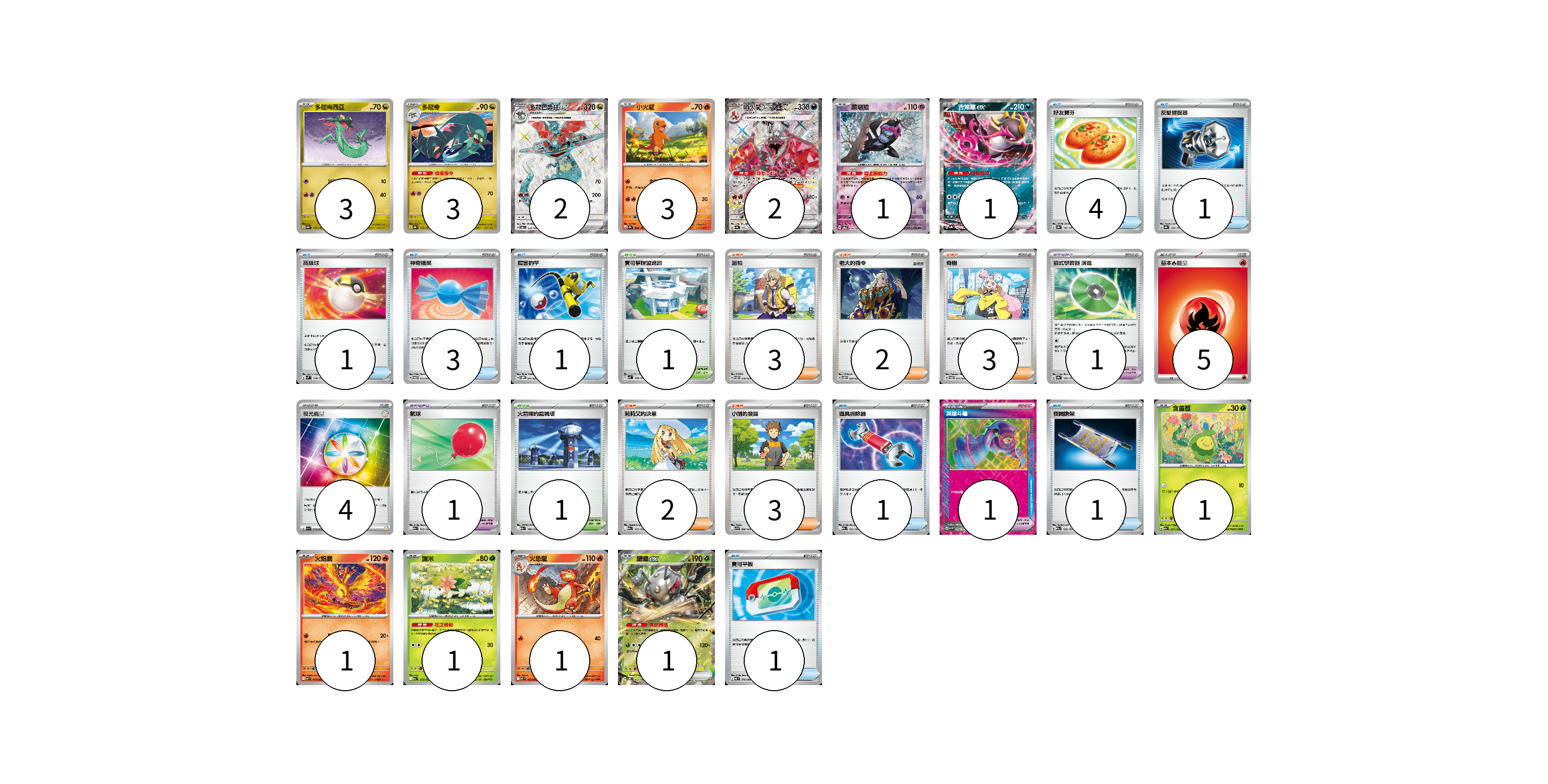 牌組構築方案 以此牌組為基礎新構築牌組 顯示卡面 顯示列表 寶可夢卡(20) 3 3 2 3 2 1 1 1 1 1 1 1 寶可夢道具(3) 1 1 1 物品卡(13) 4 1 1 3 1 1 1 1 支援者卡(13) 3 2 3 2 3 競技場卡(2) 1 1 能量卡(9) 5 4 寶可夢卡(20) 卡牌名稱 張數 卡牌名稱 張數 多龍梅西亞 SV8a 118/187 03 多龍奇 SV8a 119/187 03 多龍巴魯托ex SV6 120/101 02 小火龍 SV2a 004/165 03 噴火龍ex SV4a 331/190 02 願增猿 SV8a 075/187 01 吉雉雞ex SV8a 104/187 01 含羞苞 M2a 011/193 01 火焰鳥 M2 014/080 01 謝米 M2a 012/193 01 火恐龍 M2 012/080 01 鐵蟻ex SV8 003/106 01 寶可夢道具(3) 卡牌名稱 張數 卡牌名稱 張數 招式學習器 演進 SV8a 160/187 01 氣球 M2a 165/193 01 英雄斗篷 SV5M 064/071 01 物品卡(13) 卡牌名稱 張數 卡牌名稱 張數 好友寶芬 SV8a 147/187 04 反擊捕捉器 SV8a 139/187 01 高級球 SVM 134/175 01 神奇糖果 SVTM 013/022 03 厲害釣竿 SVOM 011/021 01 道具拆除器 M2a 151/193 01 夜間擔架 M2a 159/193 01 寶可平板 M3 070/080 01 支援者卡(13) 卡牌名稱 張數 卡牌名稱 張數 派帕 SVTM 019/022 03 老大的指令 SVTM 020/022 02 奇樹 SVTM 017/022 03 莉莉艾的決意 M2a 175/193 02 小剛的發掘 SV9 096/100 03 競技場卡(2) 卡牌名稱 張數 卡牌名稱 張數 寶可夢聯盟總部 SV3 108/108 01 火箭隊的監視塔 M2a 189/193 01 能量卡(9) 卡牌名稱 張數 卡牌名稱 張數 基本【火】能量 SVTL FIR 05 夜光能量 SV1a 073/073 04 以此牌組為基礎新構築牌組 牌組編碼 HGlarr-VlNZwU-HyhaOn copy 列印牌組單 牌組編碼已複製 分享至SNS