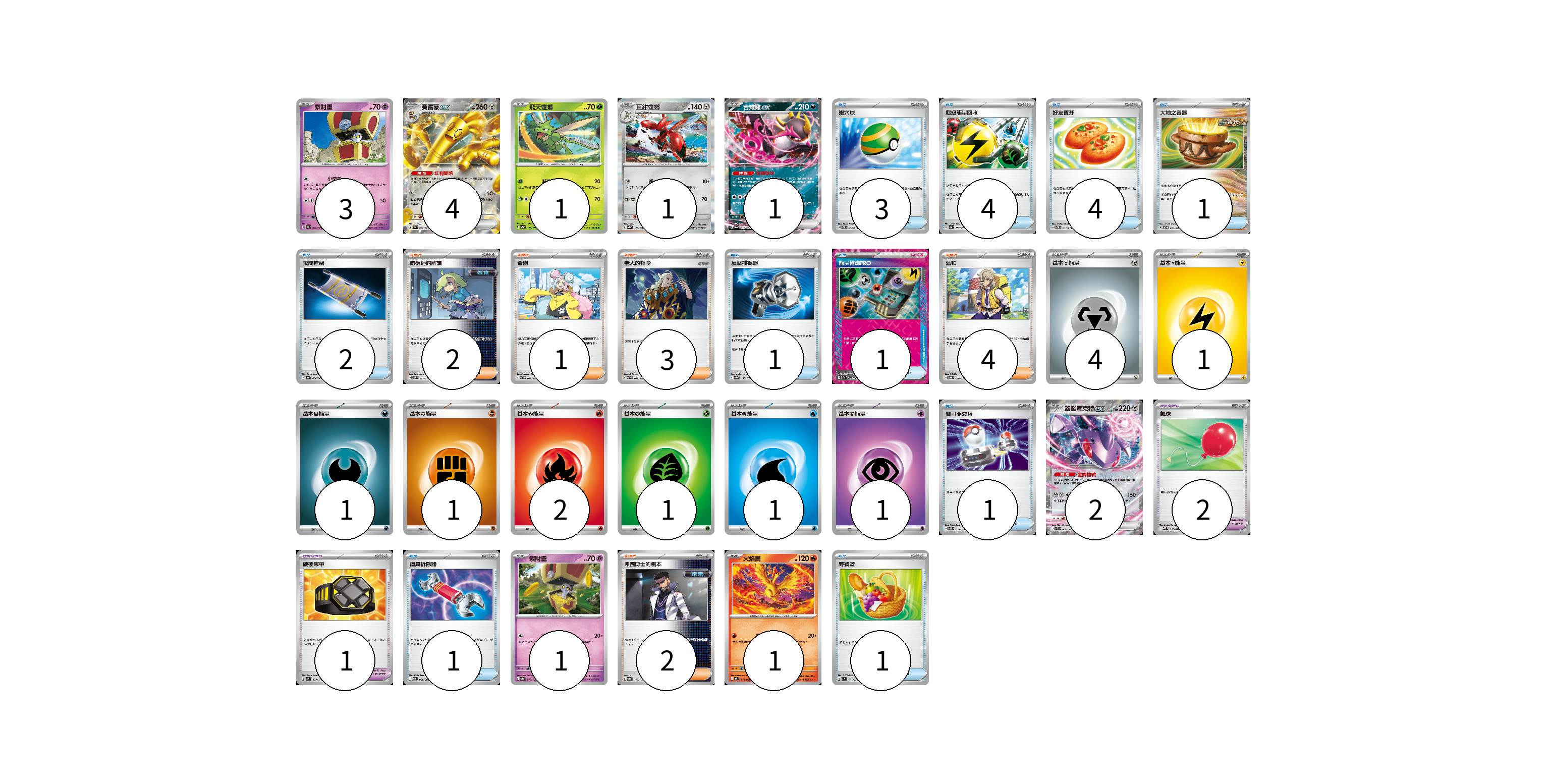 牌組構築方案 以此牌組為基礎新構築牌組 顯示卡面 顯示列表 寶可夢卡(14) 3 4 1 1 1 2 1 1 寶可夢道具(3) 2 1 物品卡(19) 3 4 4 1 2 1 1 1 1 1 支援者卡(12) 2 1 3 4 2 能量卡(12) 4 1 1 1 2 1 1 1 寶可夢卡(14) 卡牌名稱 張數 卡牌名稱 張數 索財靈 SV7a 024/064 03 賽富豪ex SV3a 050/062 04 飛天螳螂 SV2a 123/165 01 巨鉗螳螂 SV4a 129/190 01 吉雉雞ex SV6a 038/064 01 蓋諾賽克特ex SV11B 069/086 02 索財靈 SV8a 073/187 01 火焰鳥 M2 014/080 01 寶可夢道具(3) 卡牌名稱 張數 卡牌名稱 張數 氣球 MBD 018/022 02 硬硬束帶 SVM 139/175 01 物品卡(19) 卡牌名稱 張數 卡牌名稱 張數 巢穴球 SVTG 012/019 03 超級能量回收 SV4a 157/190 04 好友寶芬 SVTG 011/019 04 大地之容器 SVTG 010/019 01 夜間擔架 SV6a 056/064 02 反擊捕捉器 SV8a 139/187 01 能量輸送PRO SV7a 052/064 01 寶可夢交替 SVOM 015/021 01 道具拆除器 SV11W 080/086 01 野餐籃 SV1V 071/078 01 支援者卡(12) 卡牌名稱 張數 卡牌名稱 張數 暗碼迷的解讀 SV5M 067/071 02 奇樹 SVTG 017/019 01 老大的指令 SVTG 019/019 03 派帕 SVOD 018/020 04 弗圖博士的劇本 SV8a 175/187 02 能量卡(12) 卡牌名稱 張數 卡牌名稱 張數 基本【鋼】能量 SVB MET 04 基本【雷】能量 SVB LIG 01 基本【惡】能量 SVB DAR 01 基本【鬥】能量 SVB FIG 01 基本【火】能量 SVB FIR 02 基本【草】能量 SVB GRA 01 基本【水】能量 SVD WAT 01 基本【超】能量 SVB PSY 01 以此牌組為基礎新構築牌組 牌組編碼 HIUsgu-nDjDXY-DSmouH copy 列印牌組單 牌組編碼已複製 分享至SNS